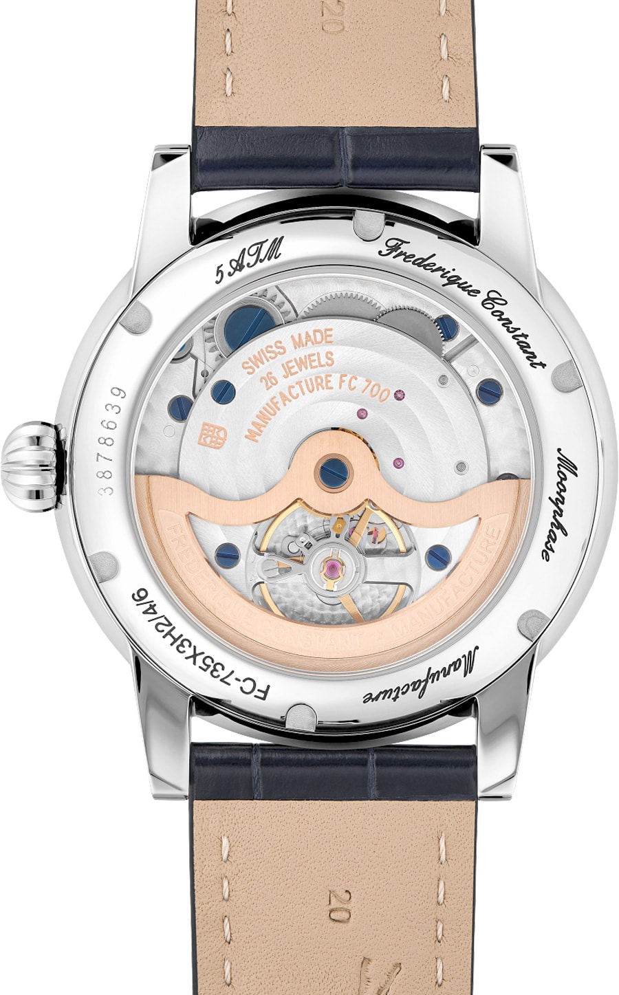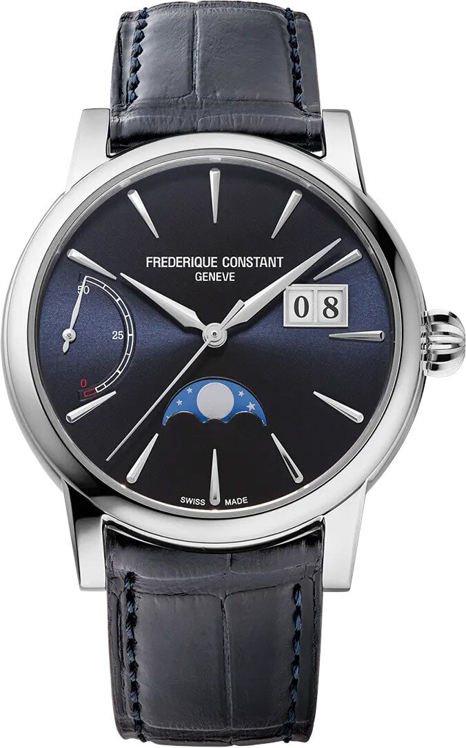 The Classic Power Reserve Big Date Manufacture, bringing to life Frederique Constant’s thirty-first Manufacture calibre, the FC-735. It’s the first calibre from the firm to offer a big date, a moon phase and a power reserve indicator – now for a total of 50 hours., The latter is indicated at 9 o’clock by a slim, dedicated hand travelling along an arc marked out from 0 to 50, ending in a red zone warning that it’s time to wind the watch before it stops. Opposite, between 2 and 3 o’clock, the big date proudly displays its encircled double window (one for tens and the other for units). This perfect balance is further highlighted by a radiant, poetic moon phase at 6 o’clock on a starry blue background.