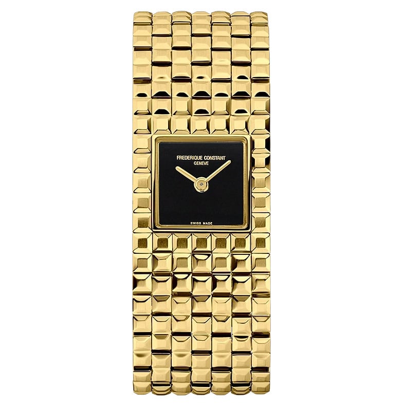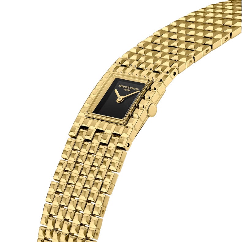 Here, style comes first. Frederique Constant has therefore made no concessions. The ‘Clou de Paris’ motif adorns the entire watch in a myriad of sparkling, polished squares, with a brushed finish at the top of each link. At their centre is a discreet dial with only the hour and minute hands.