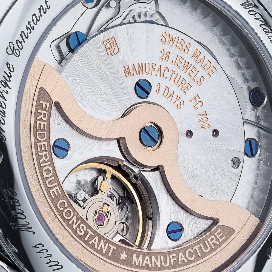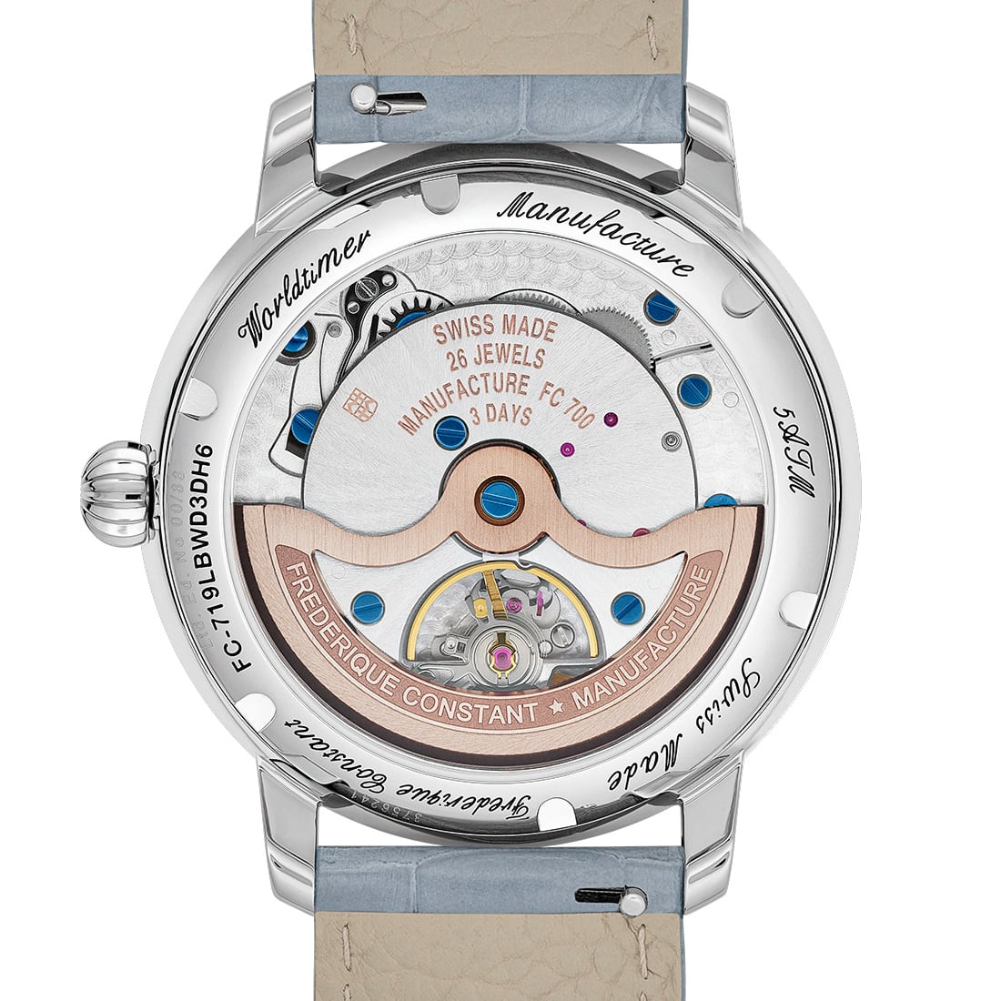 This collector’s piece is offered with two interchangeable alligator leather straps: a harmonious light blue and an additional navy blue to vary styles according to your journeys. Thanks to the quick-change system, adapting to every moment is instantaneous. The sapphire crystal caseback allows one to admire the artisanal finishes of the FC-719 movement: Perlage decoration on the bridges, sunray Côtes de Genève on the automatic frame, and a satin-finished, snailed oscillating weight—testaments to the audacity and savoir-faire of the Manufacture.