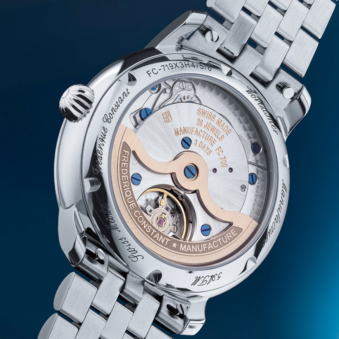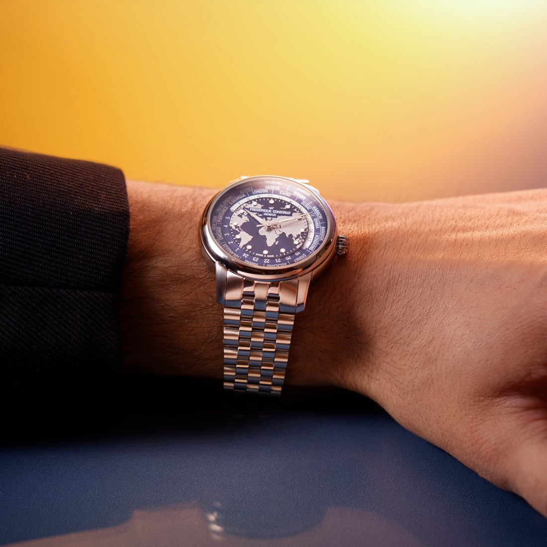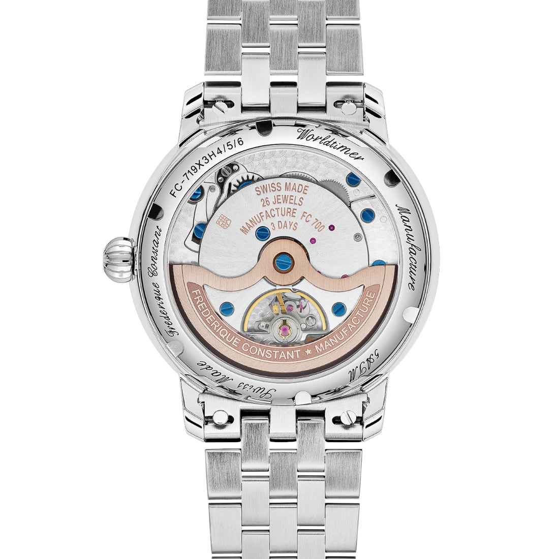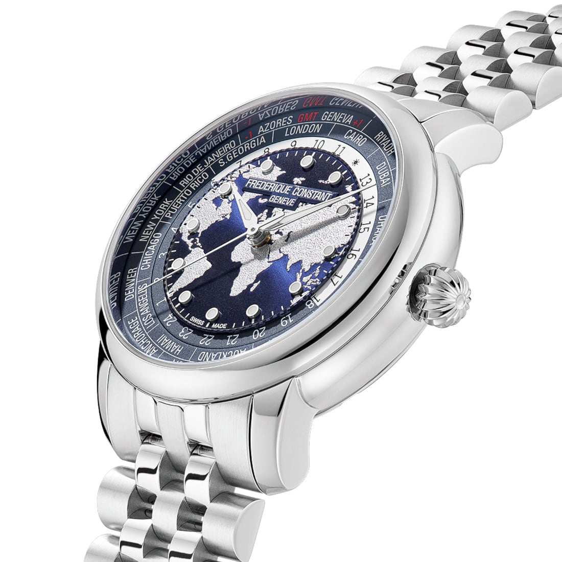 The Classic Worldtimer Manufacture enters a new chapter with this contemporary design on a five-link steel bracelet. Its navy blue dial with embossed continents gains legibility thanks to a clean no-date display. Now powered by the new Manufacture caliber FC-719 with 72 hours of power reserve, it guarantees a full three-day autonomy to accompany your travels with precision.