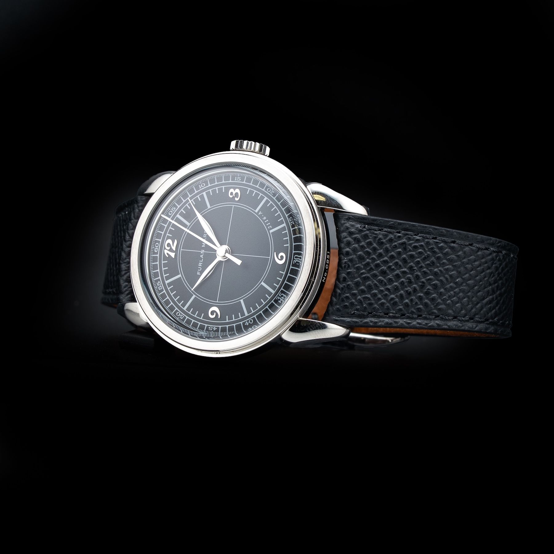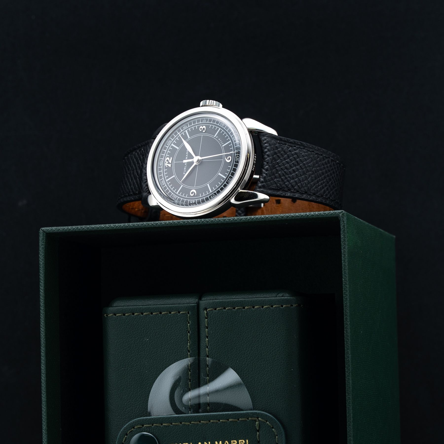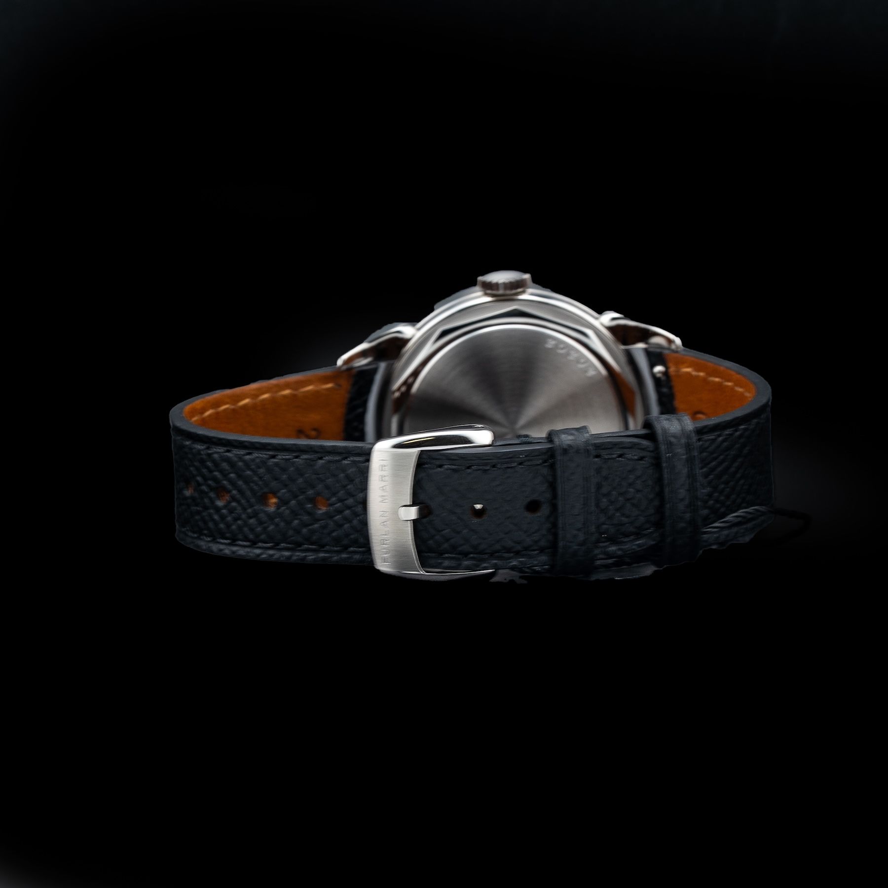 This watch features a 37.5mm stainless steel case on leather strap. This watch also sports a black dial. Powered by an automatic movement. Water resistance up to 50 meters.