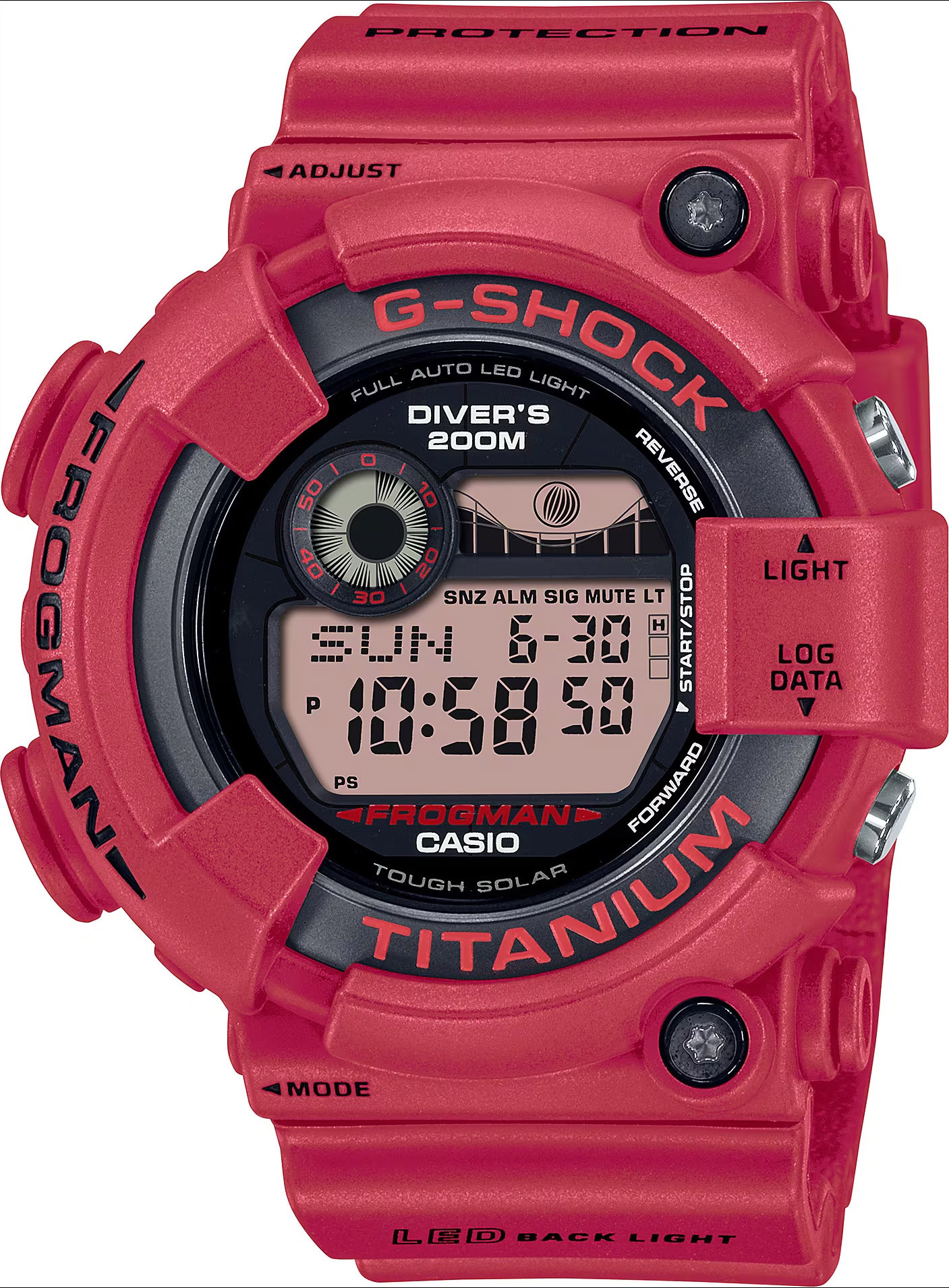 The third commemorative model to mark the 30 years since the first FROGMAN made a splash in 1993, this limited-edition timepiece revisits the bold design of the DW-8200NT debut in 2000 — the iconic asymmetrical FROGMAN shape with striking red band, bezel, and LCD.