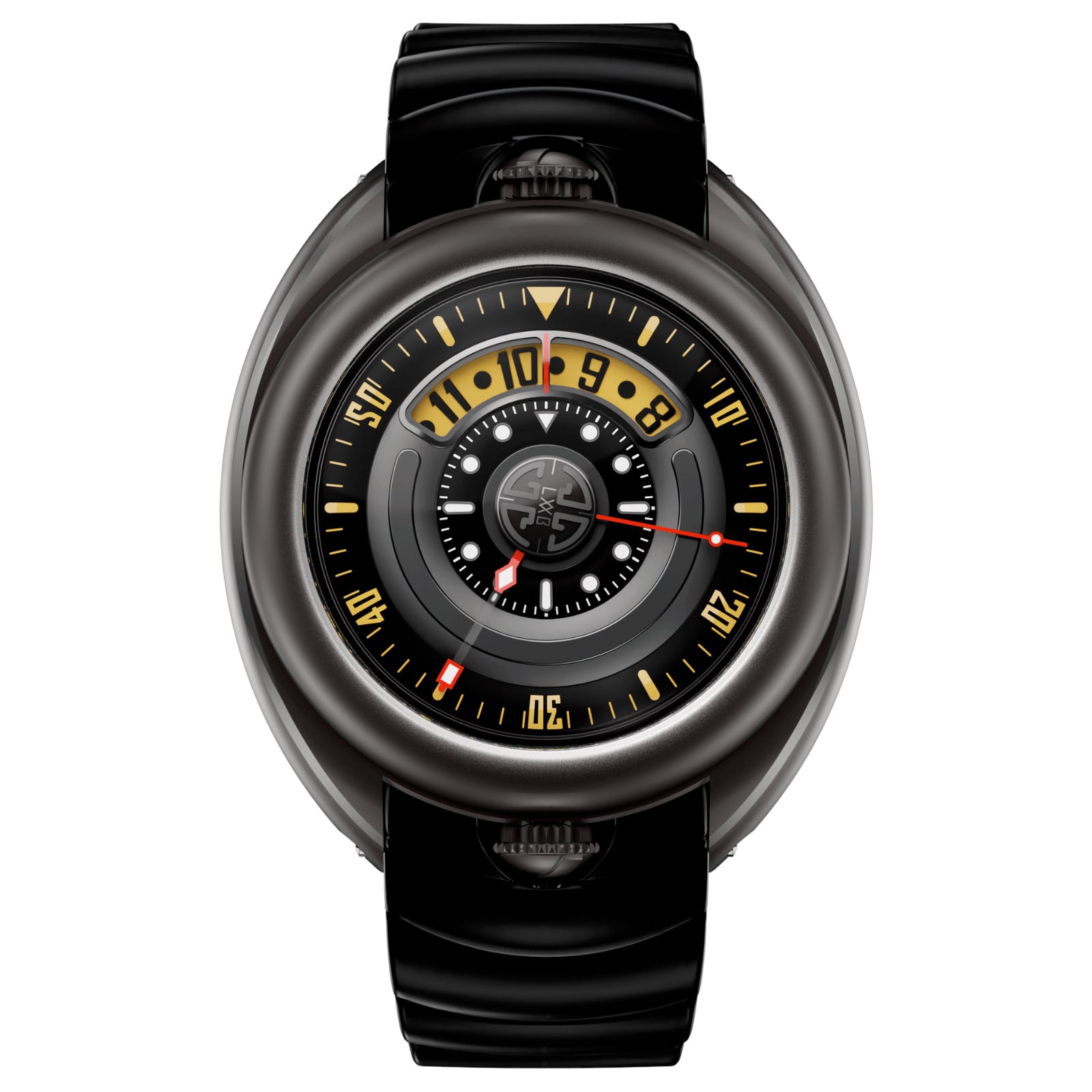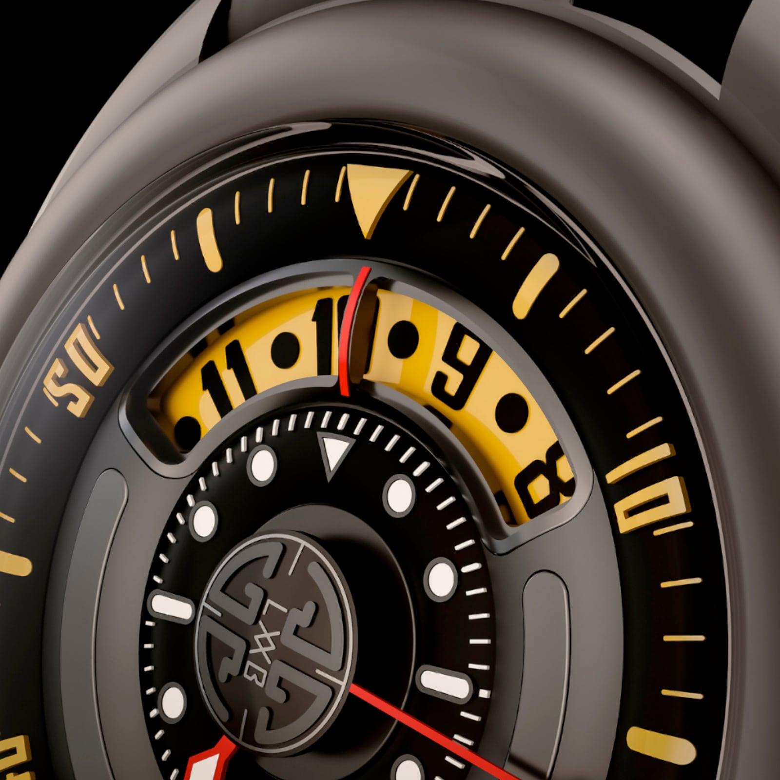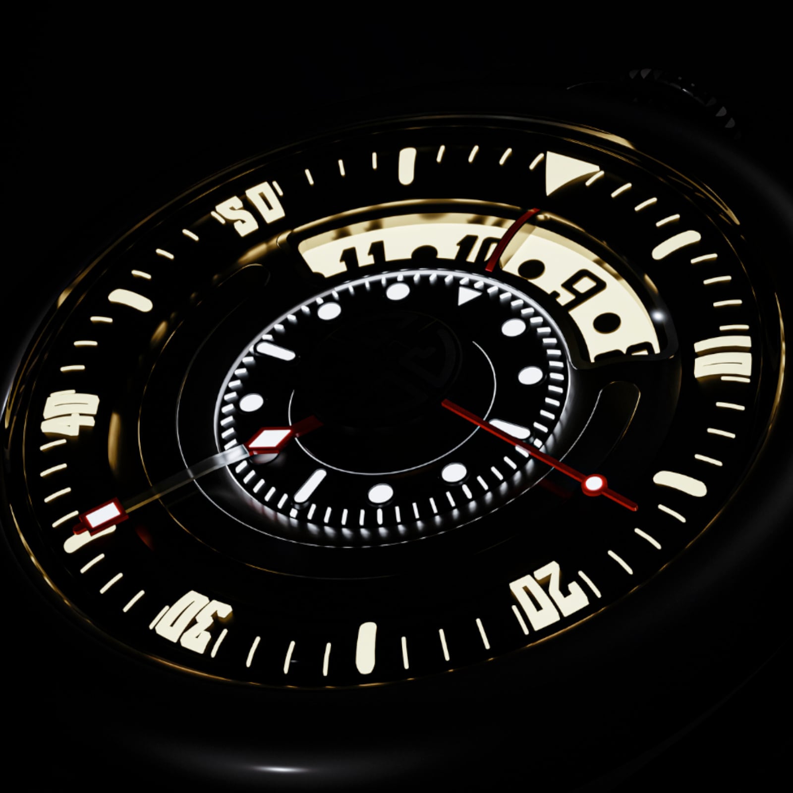 Design: Inner ring with minute indications. Caseback secured with 4 screws. Double crown – H12 time setting / H6 inner ring setting.