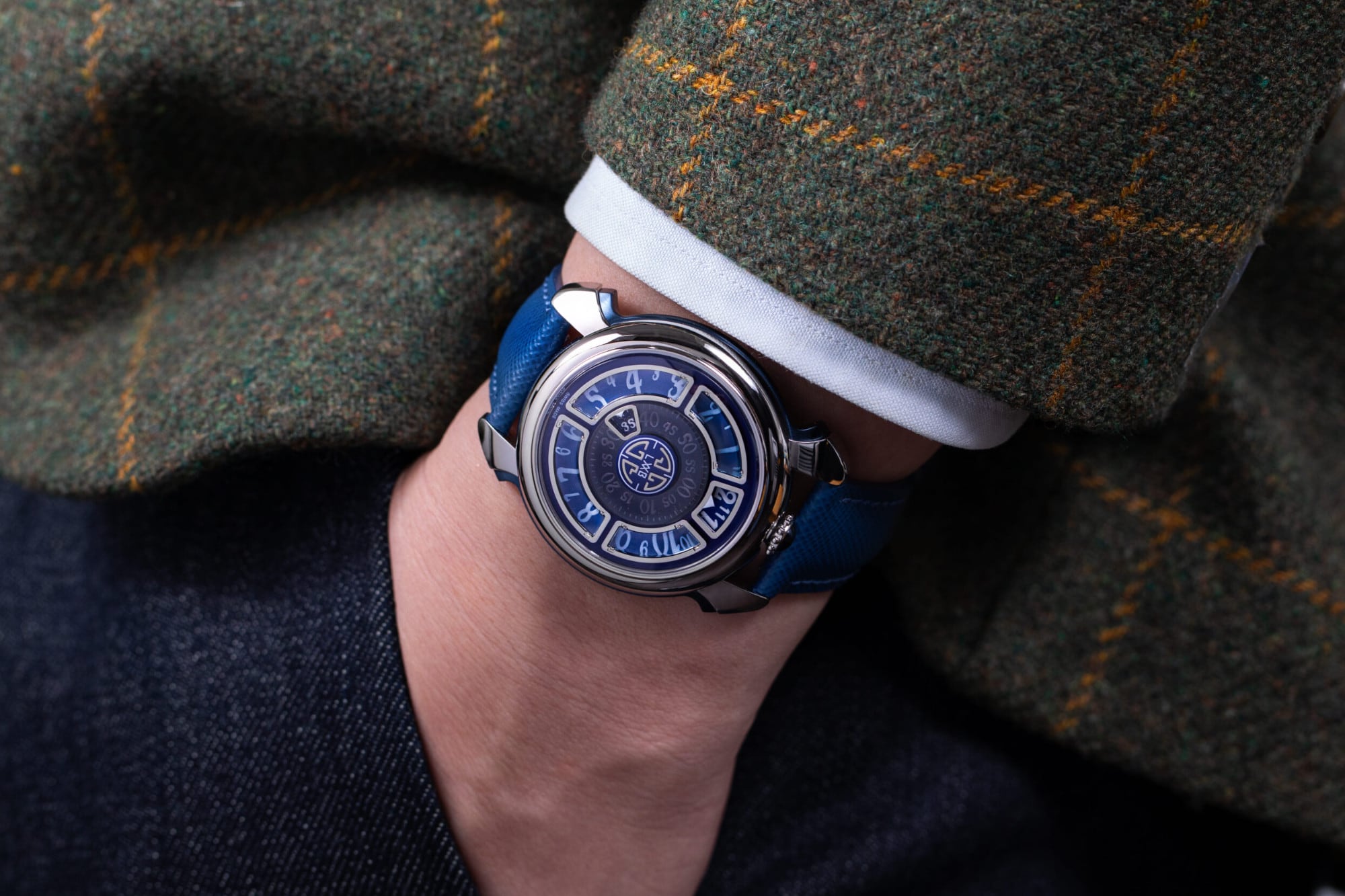 - Monochrome aesthetic: blue case, blue dial, grey.