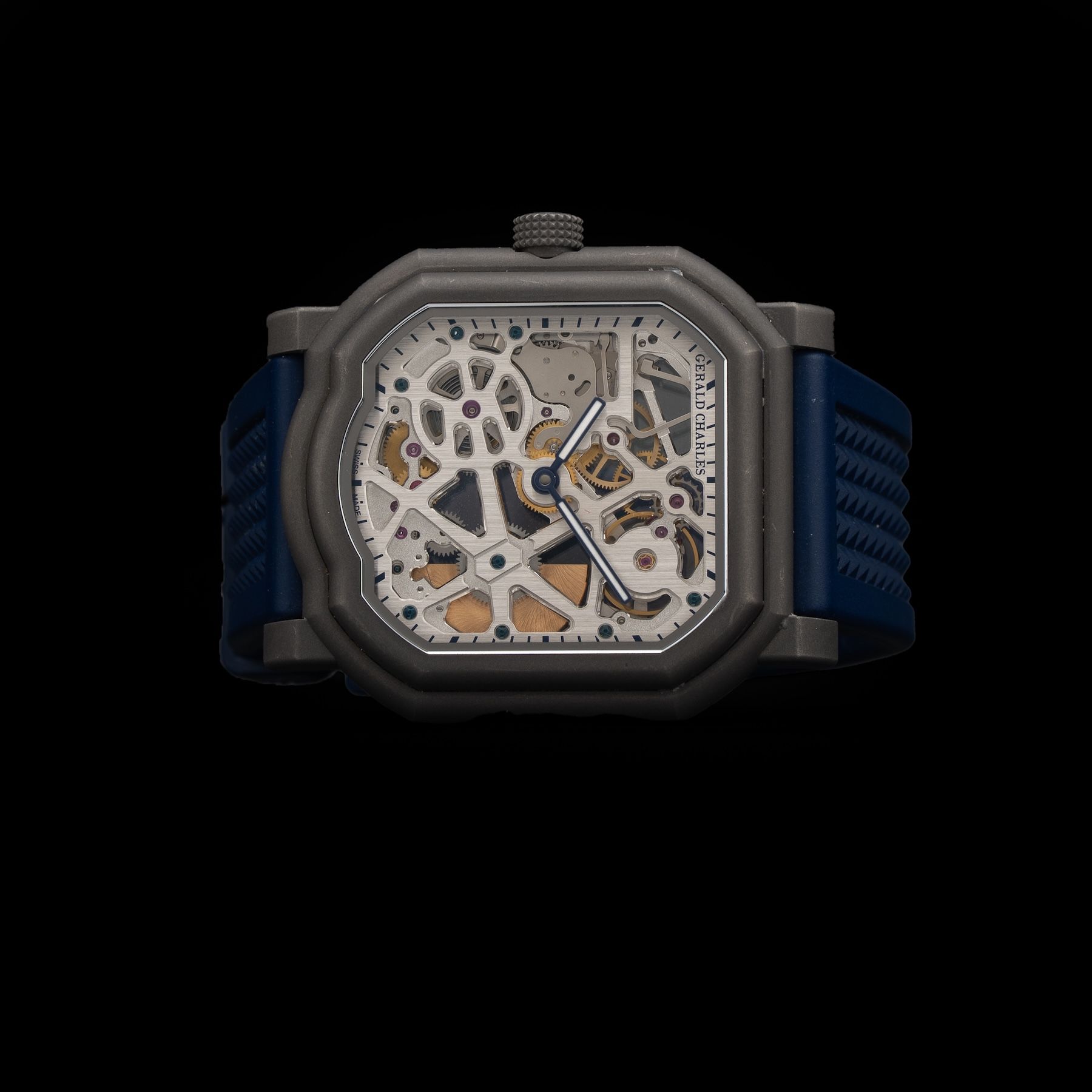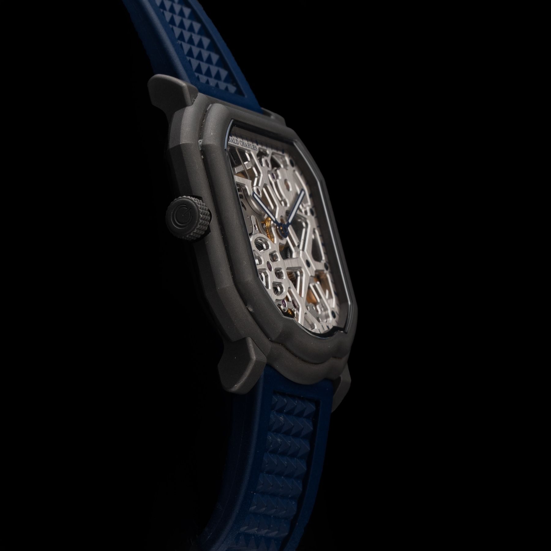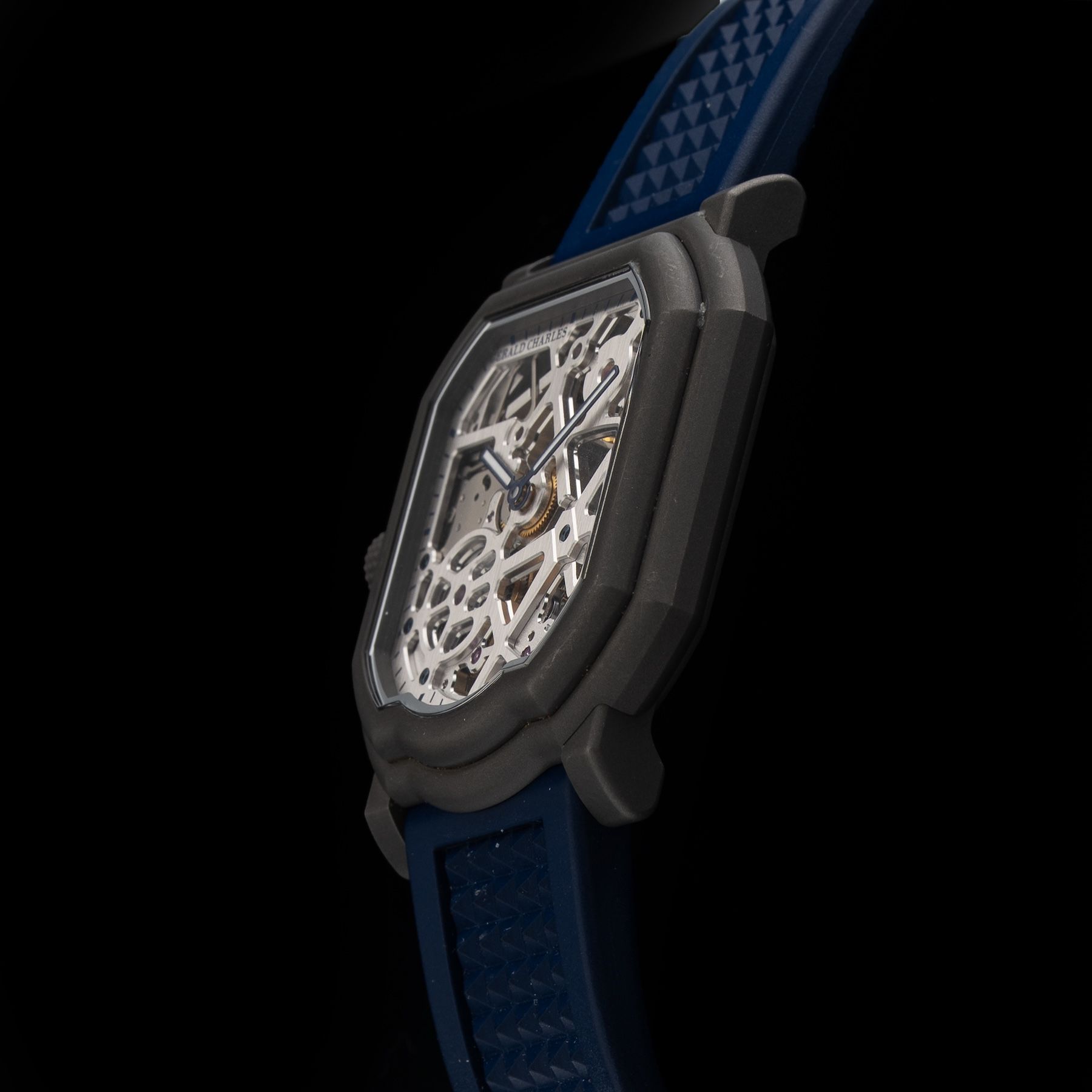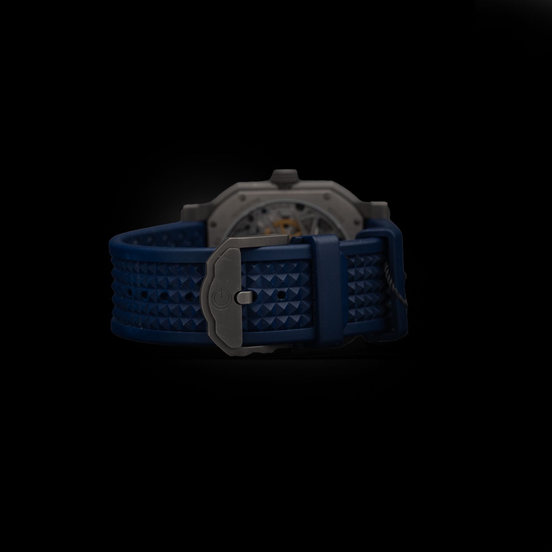 This watch features a 39mm grade 5 titanium case on rubber strap. This watch also sports a skeleton dial. Powered by an automatic movement. Water resistance up to 100 meters.