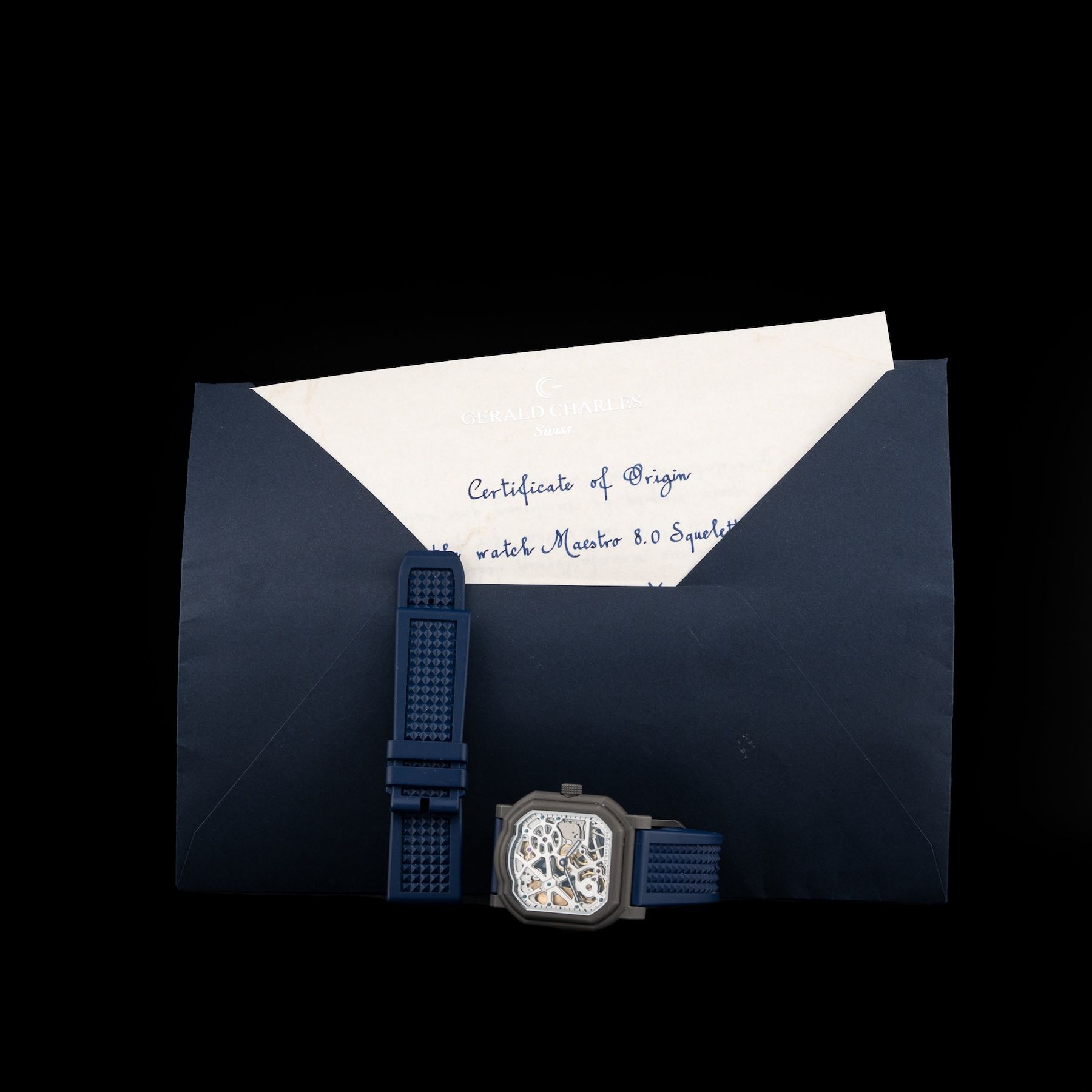 This Gerald Charles Maestro GC8.0-TX-TN-01 is in GREAT condition. This watch includes its Warranty Card Only, Not Dated. This watch has been fully authenticated and certified by Exquisite Timepieces. Please note, the photos shown are of the actual watch you will receive.