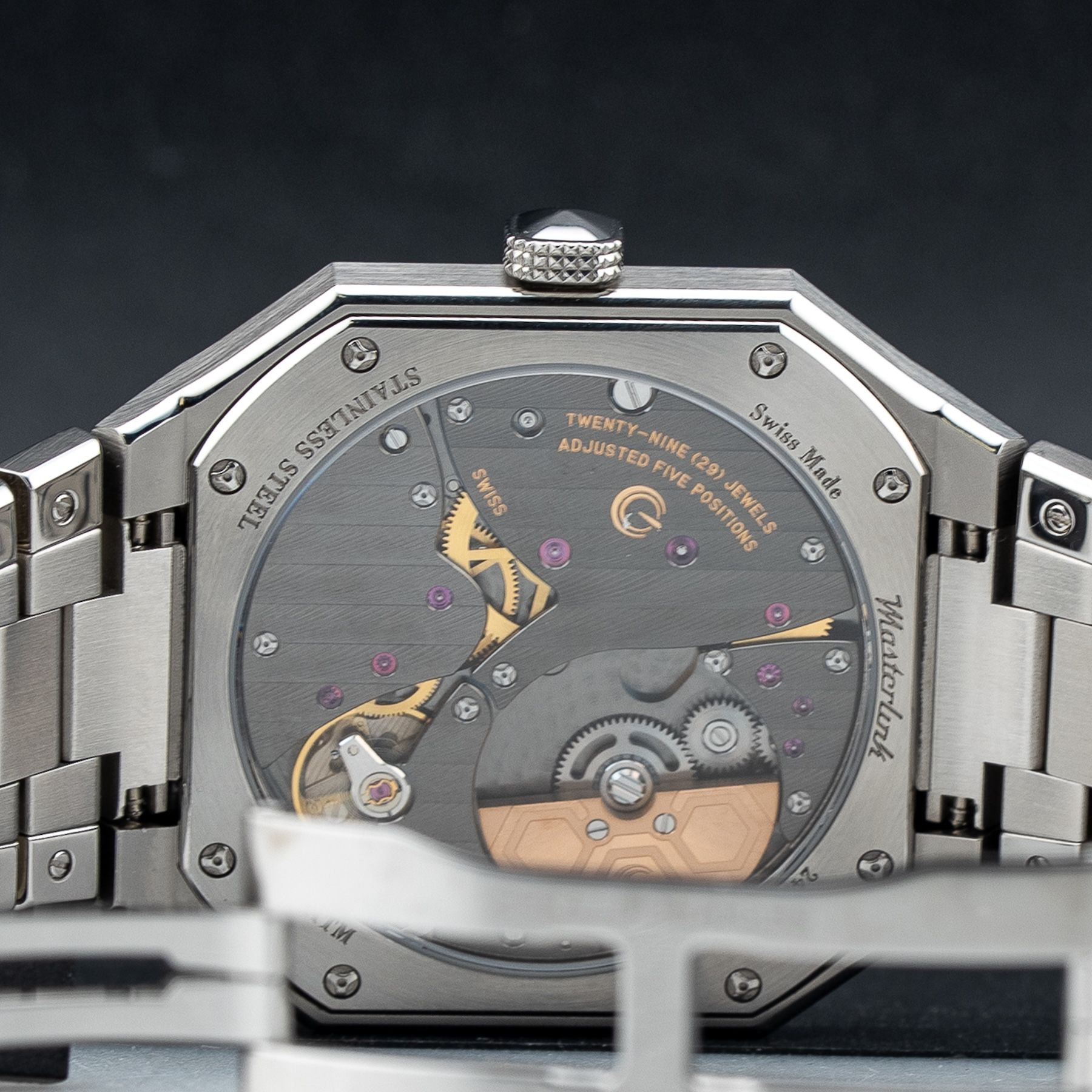 - This timepiece features a 38mm steel case paired with a high quality steel bracelet. It showcases a distinctive silver dial and is powered by a precise automatic winding movement. The watch is designed with a water resistance of up to 100m.