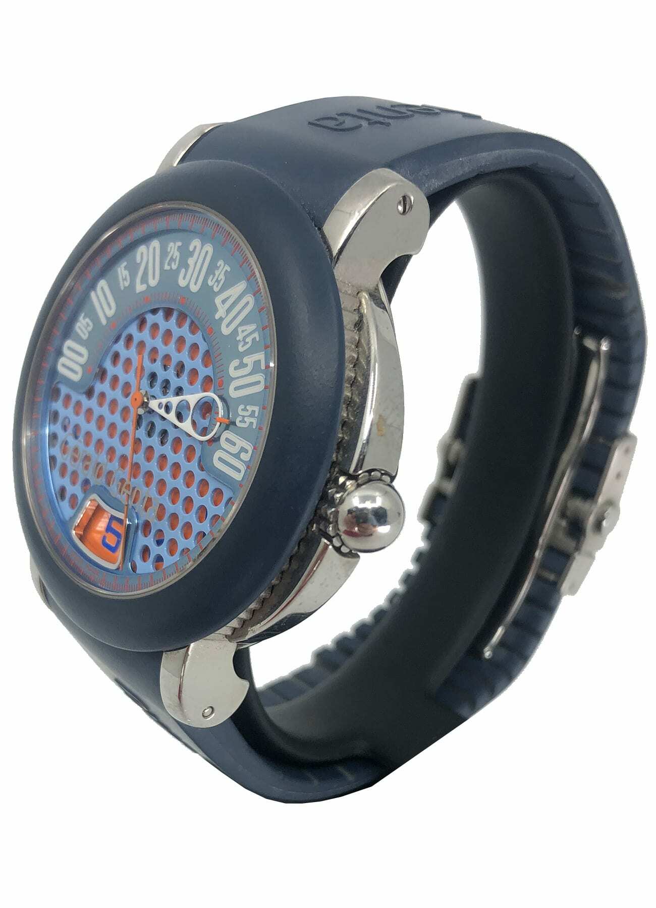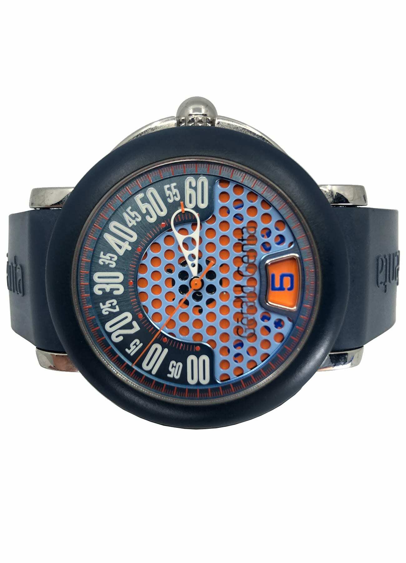 This watch features a 41mm steel case on rubber strap. This watch also sports blue/orange dial covered by sapphire crystal. Powered by an Automatic Movement. Water resistance up to 100 meters.