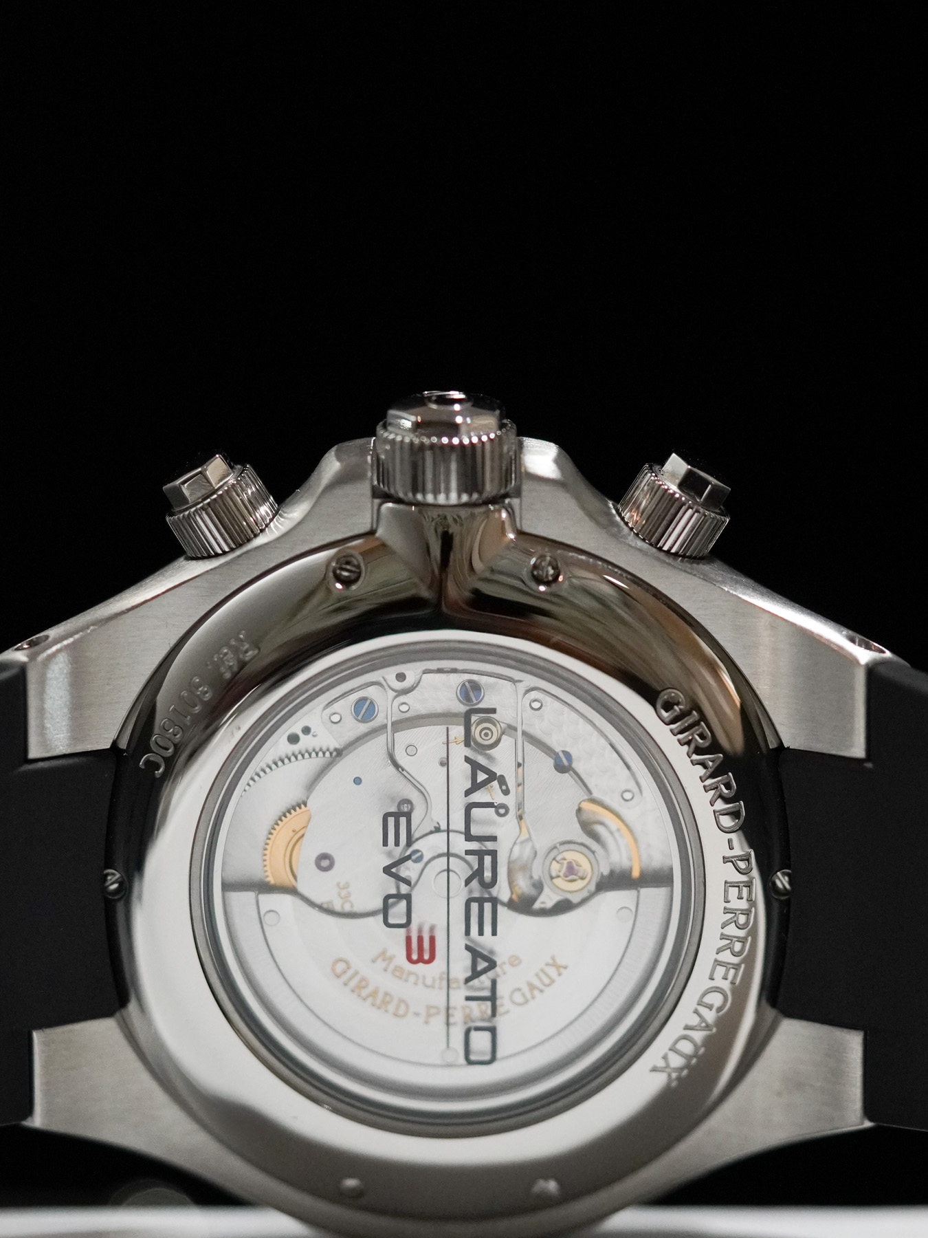 This Girard Perregaux Laureato Evo 3 features a 44mm stainless steel case with an exhibition case back on a black rubber strap. This watch also sports a black dial with luminous hands and Arabic numeral dial markers covered by scratch resistant sapphire crystal.