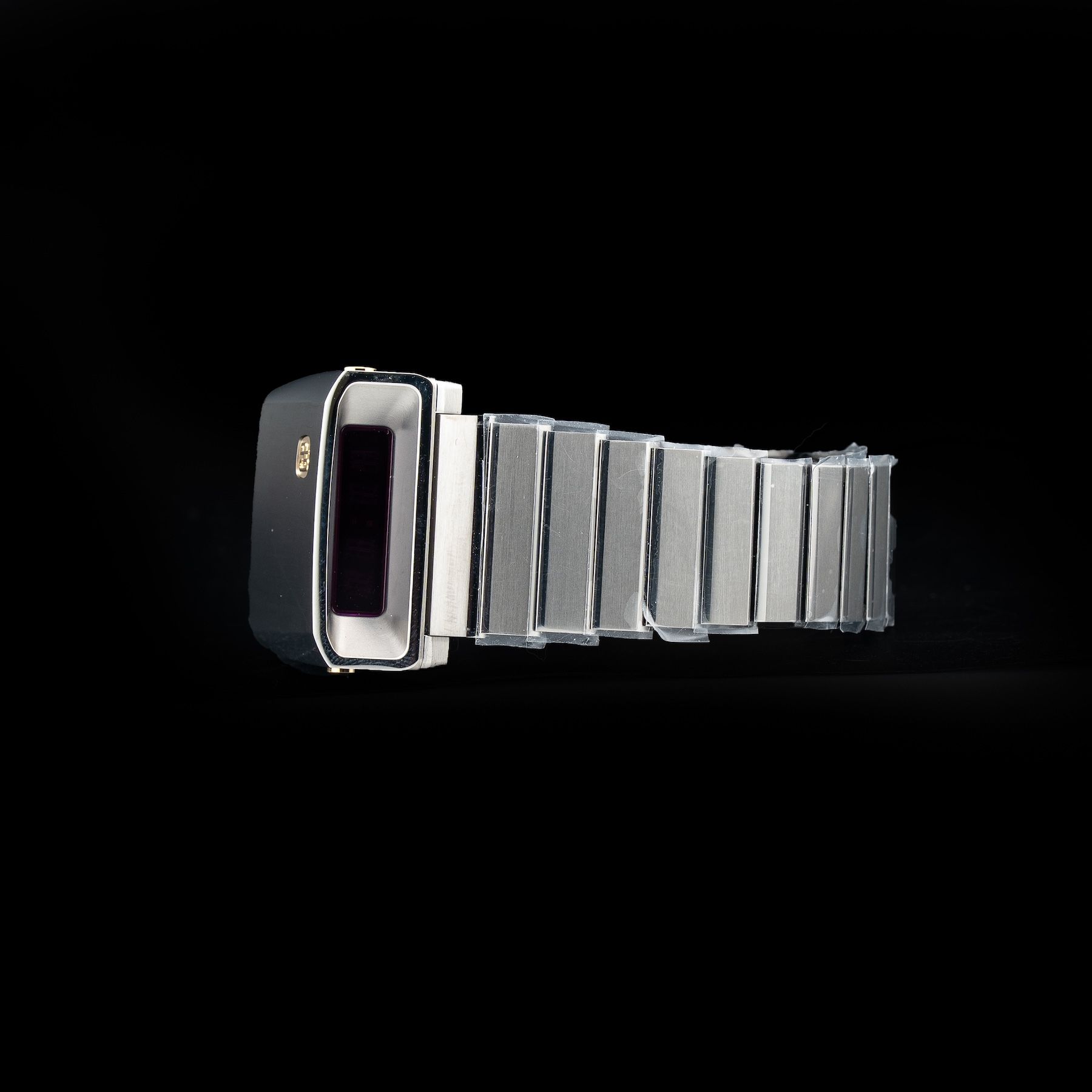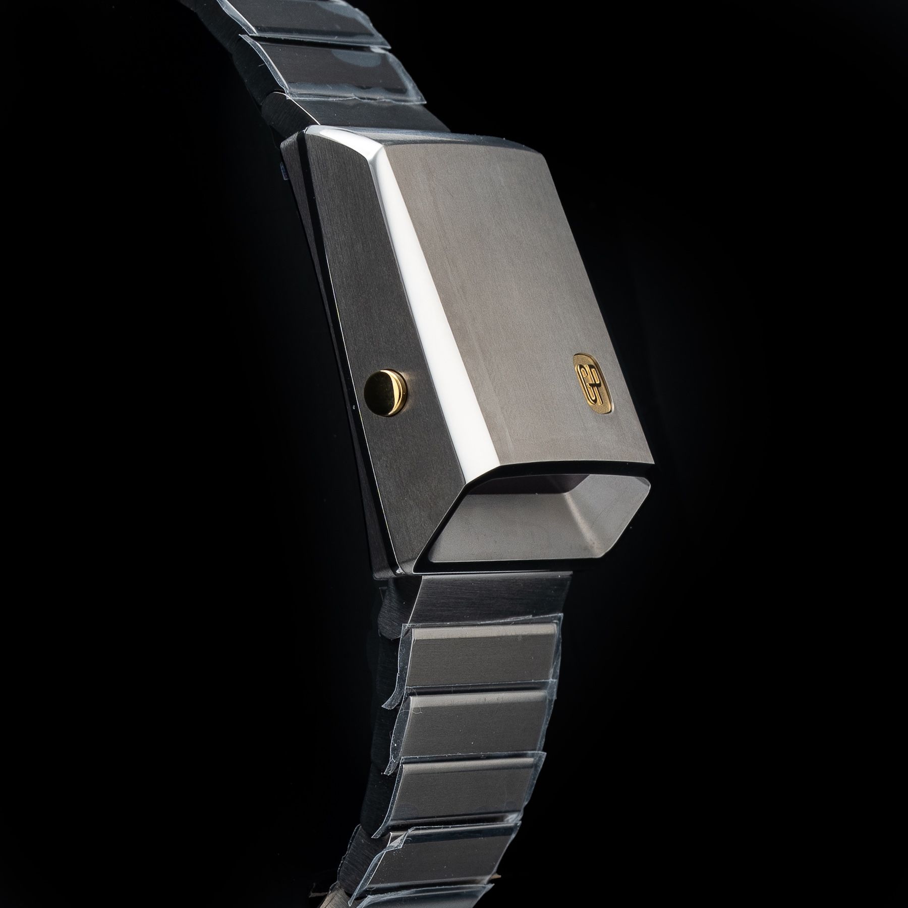 This watch features a 42.40 x 33.60 mm Titanium and Yellow Gold GP case on titanium bracelet. This watch also sports a black dial. Powered by a quartz movement. Water resistance up to 50 meters.
