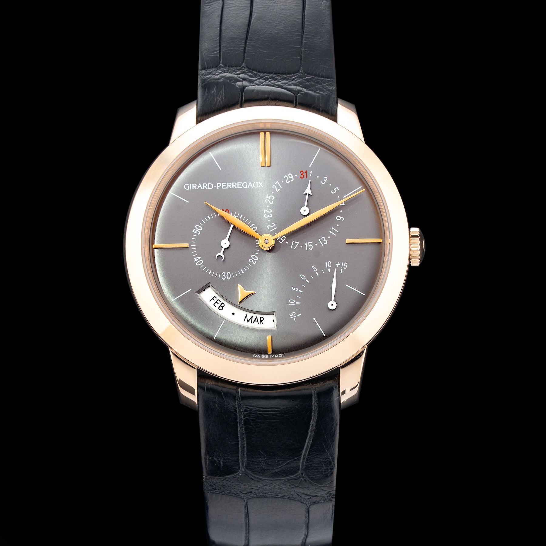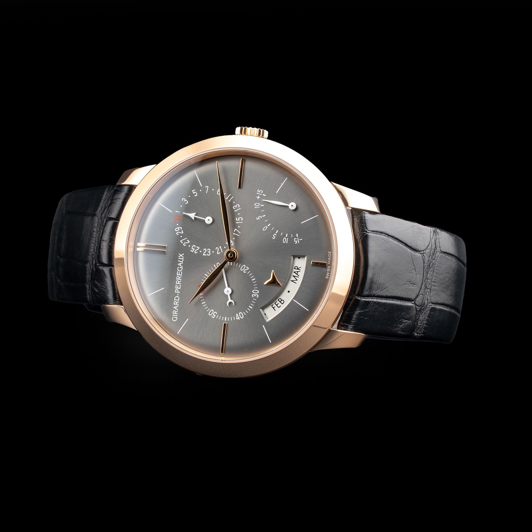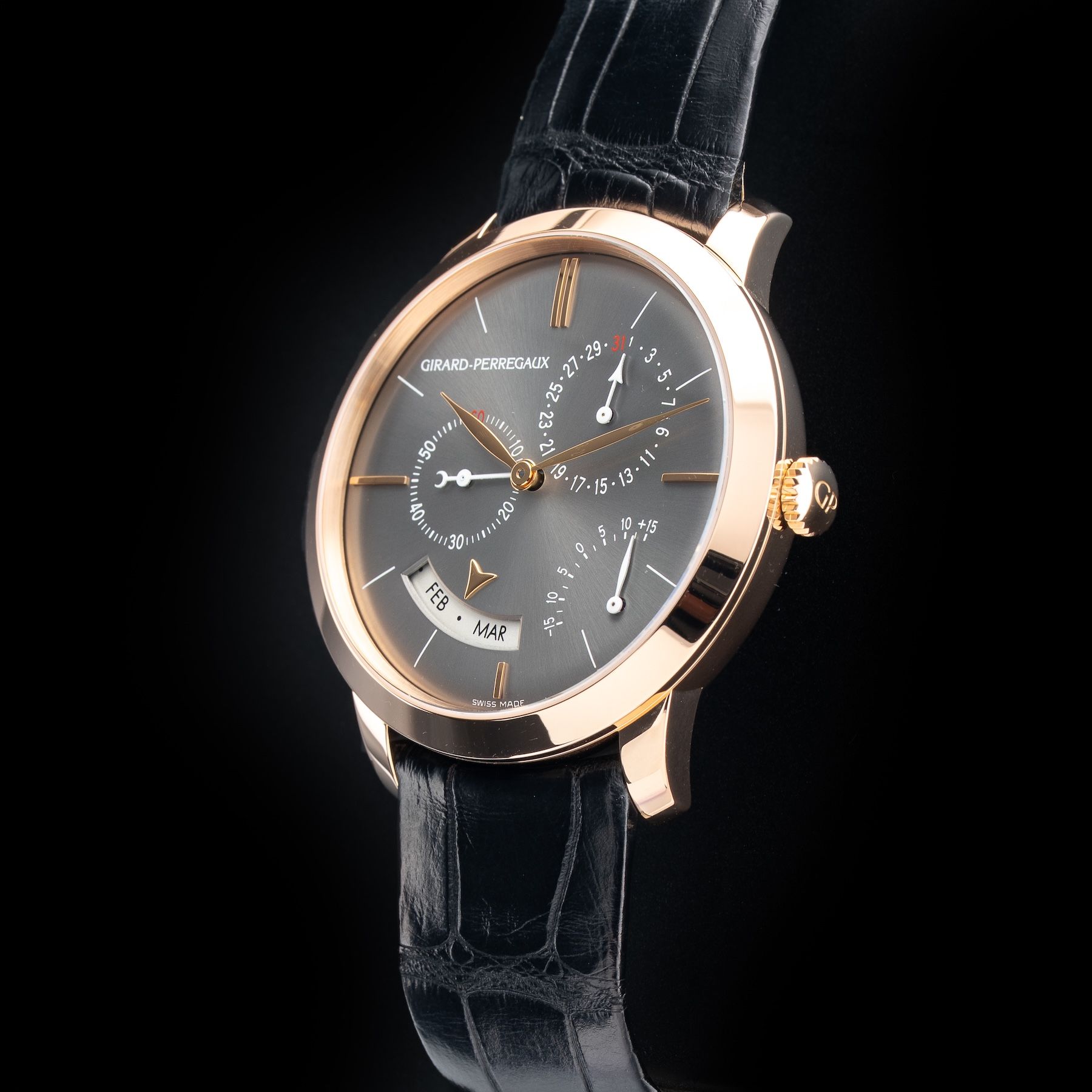 This watch features a 40mm pink gold case on leather strap. This watch also sports a anthracite dial. Powered by a Girard-Perregaux caliber GP03300-0010 movement. Water resistance up to 30 meters.
