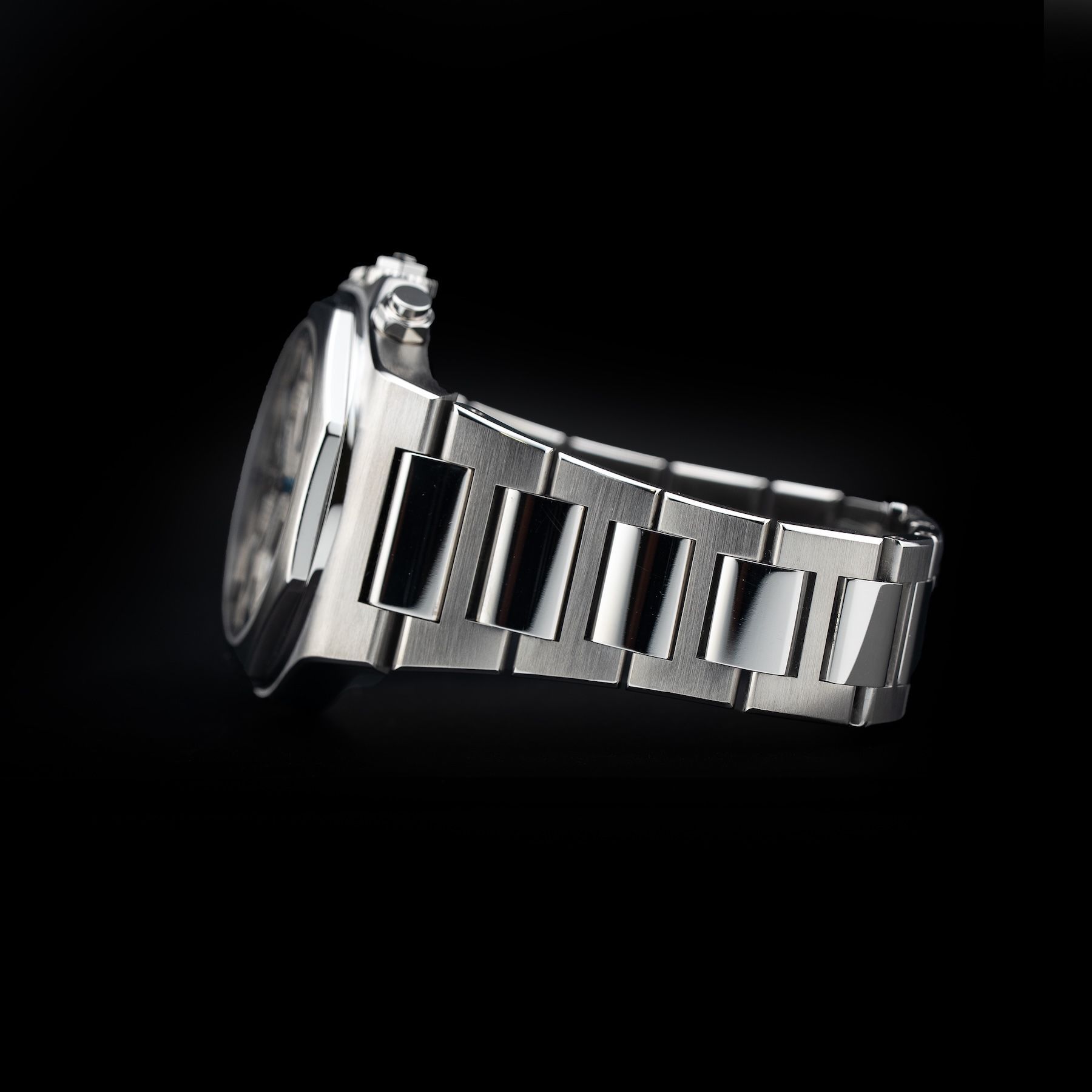 This watch features a 42mm steel case on steel strap. This watch also sports a silver dial. Powered by a self-winding mechanical movement. Water resistance up to 100 meters.