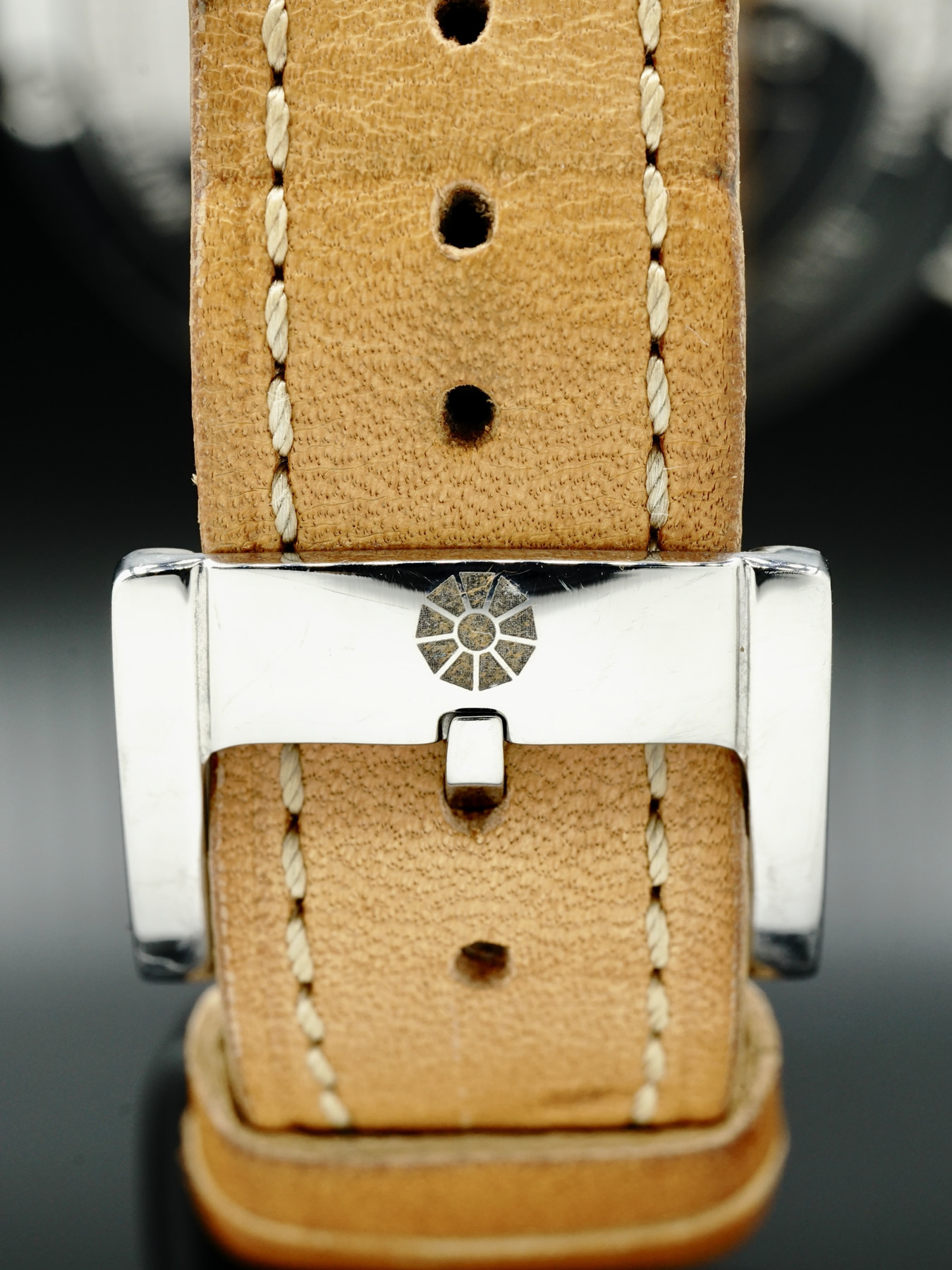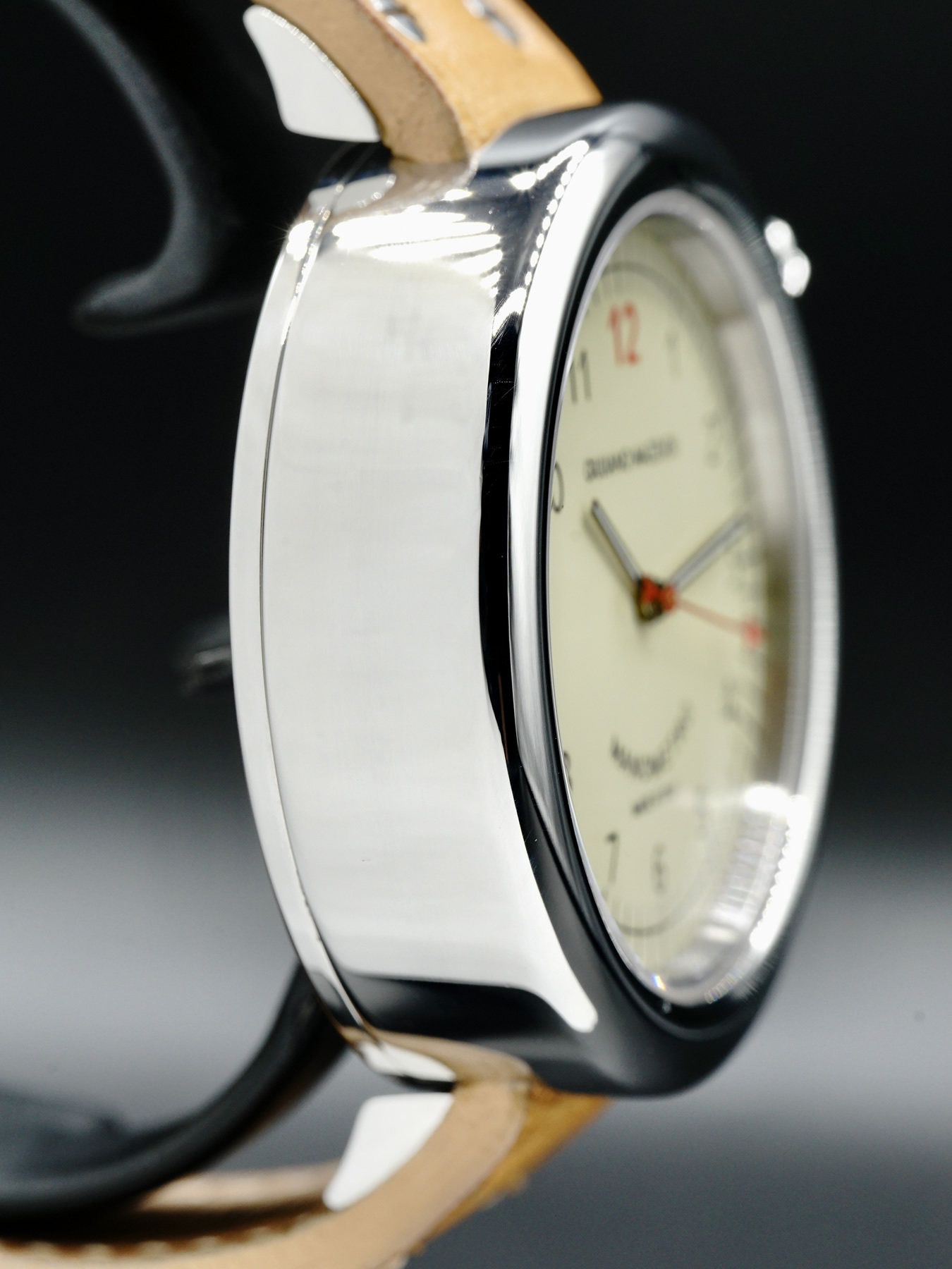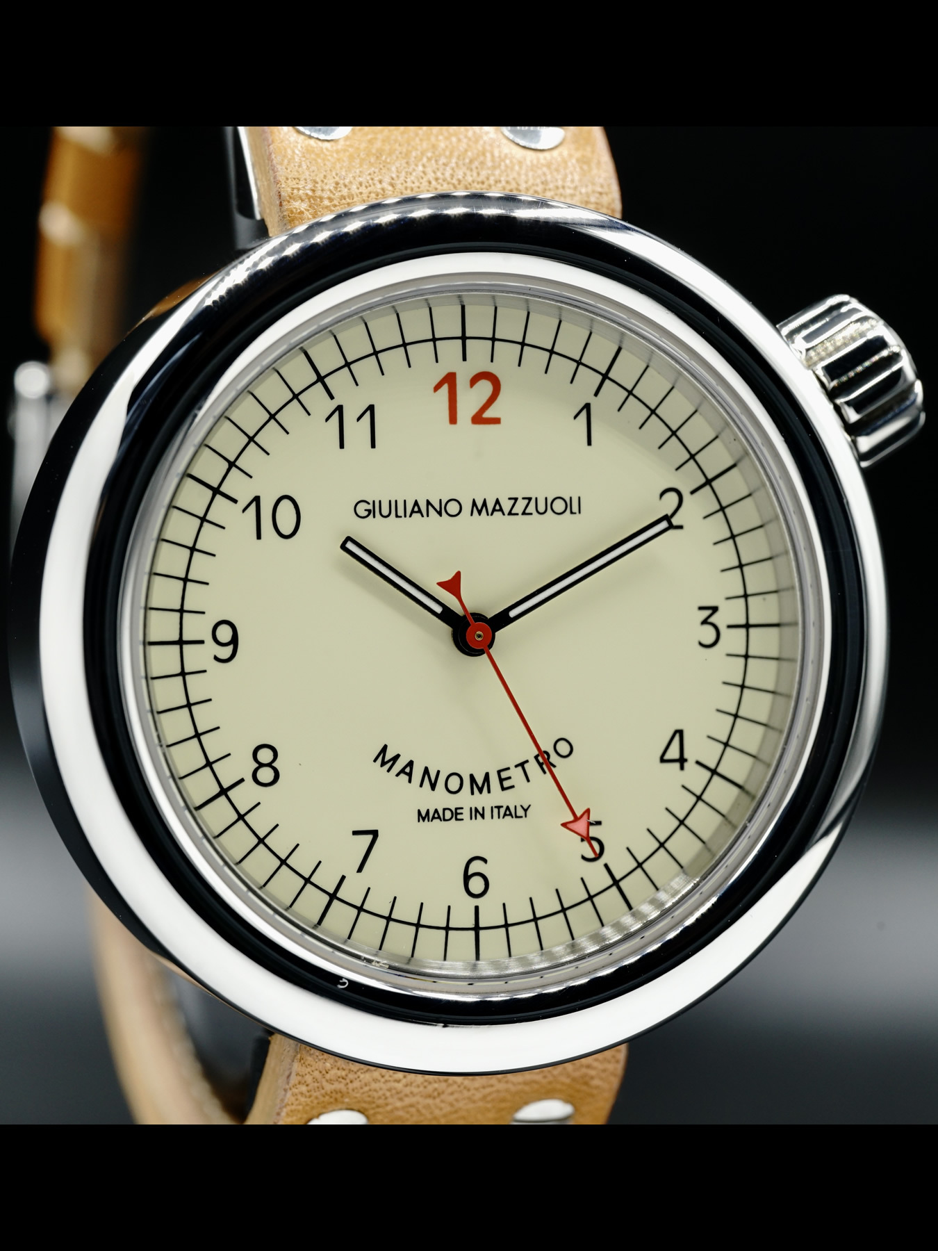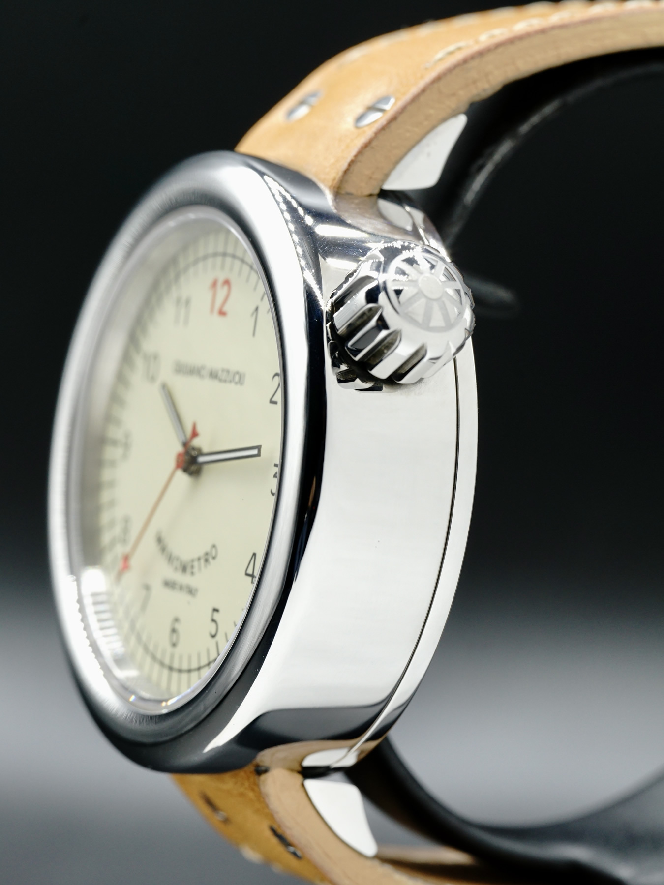 This Giuliano Mazzuoli Manometro features a 45.20mm stainless steel case & bezel with a solid case back on a brown leather strap. This watch also sports an ivory dial with luminescent hour and minute hands covered by scratch resistant sapphire crystal.