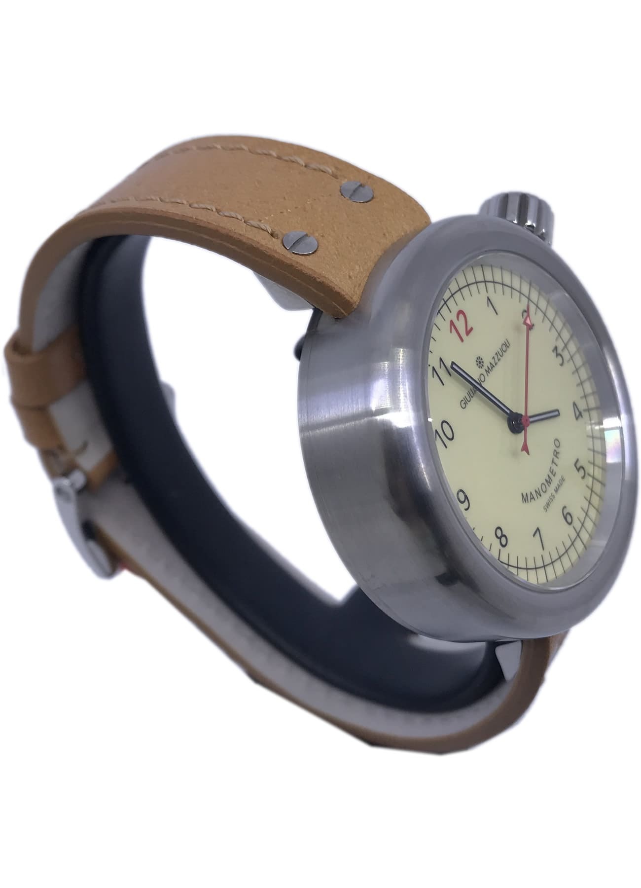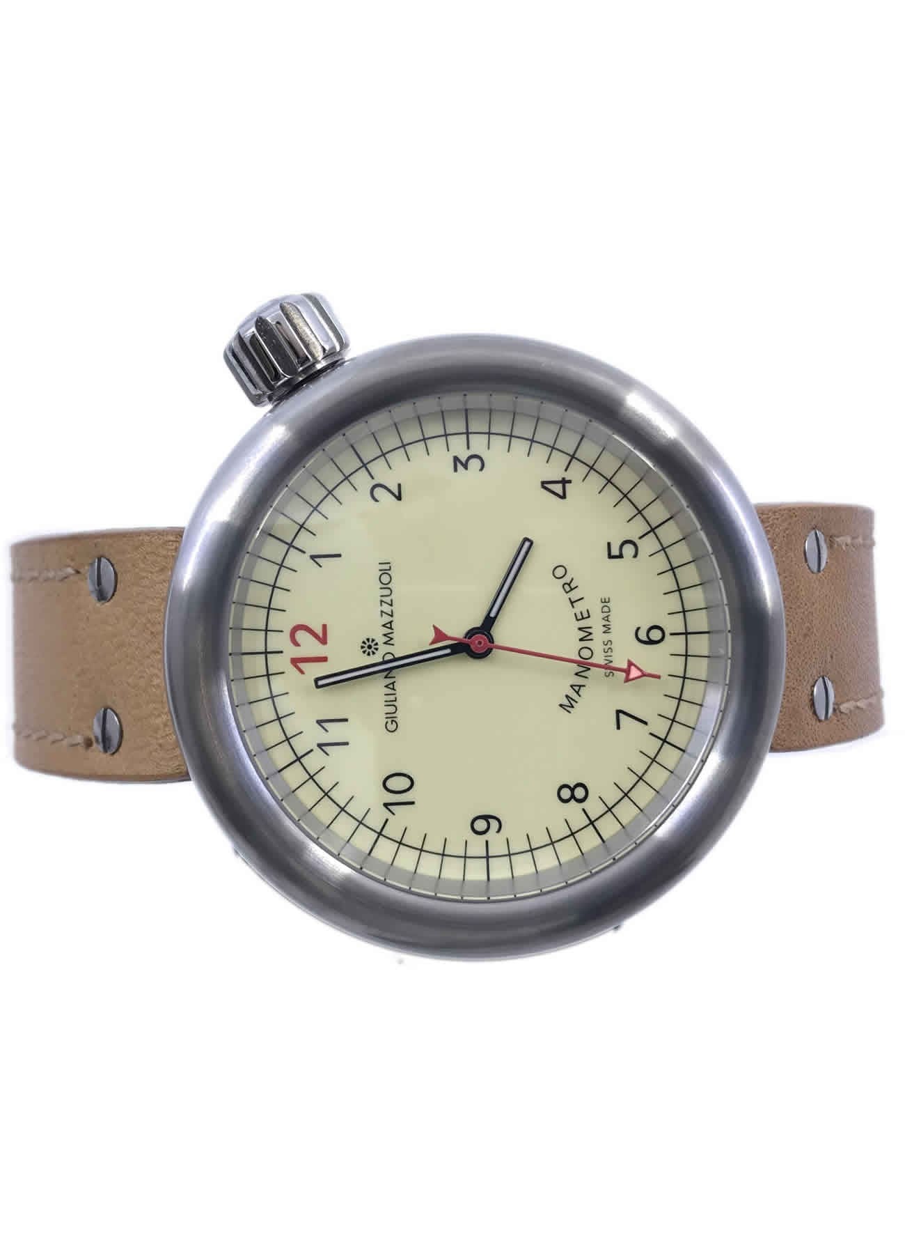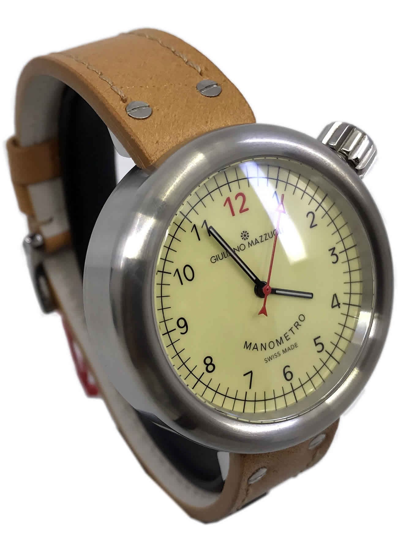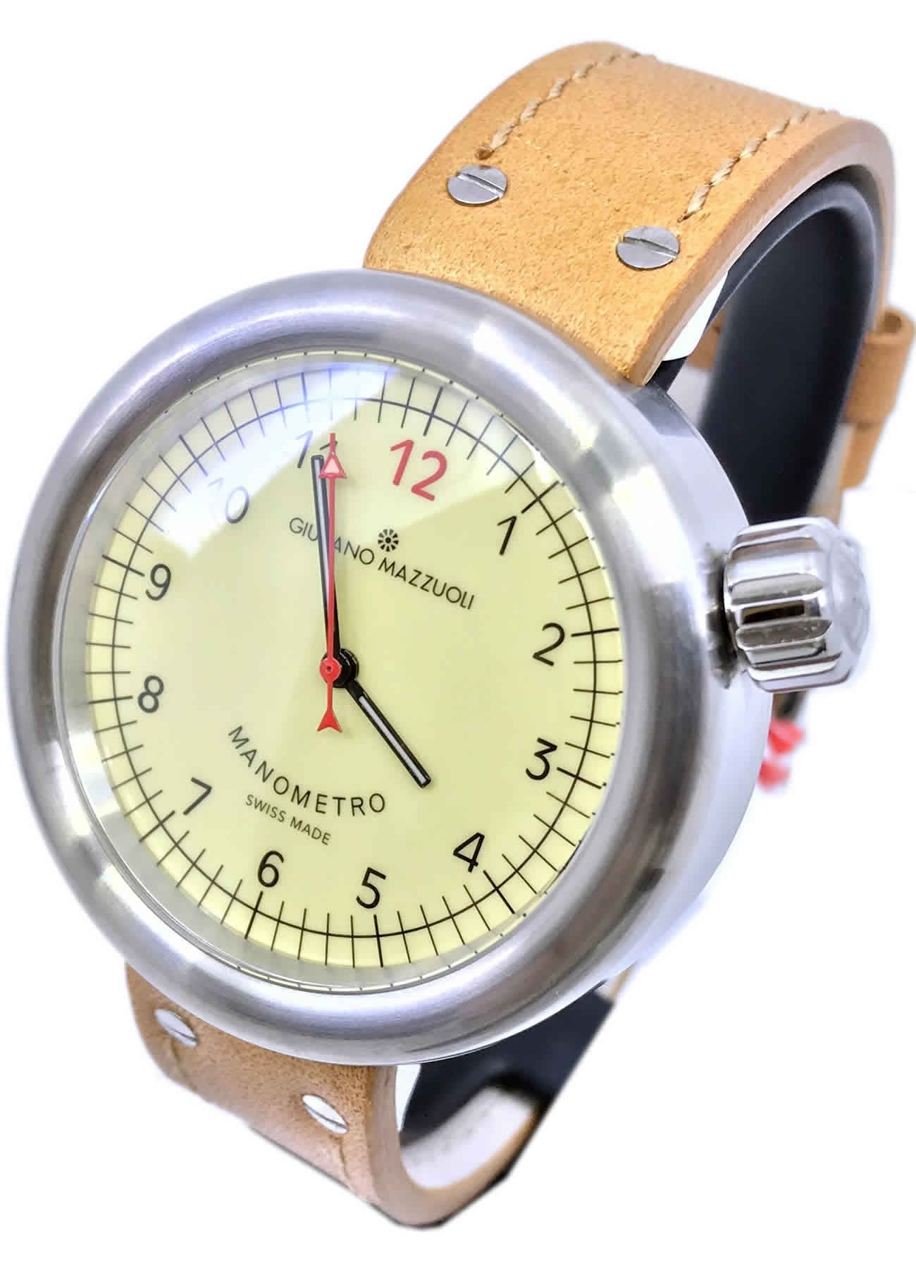 - This timepiece features a 45mm steel case paired with a high quality leather strap. It showcases a distinctive ivory dial and is powered by a precise automatic winding movement. The watch is designed with a water resistance of up to 50M.