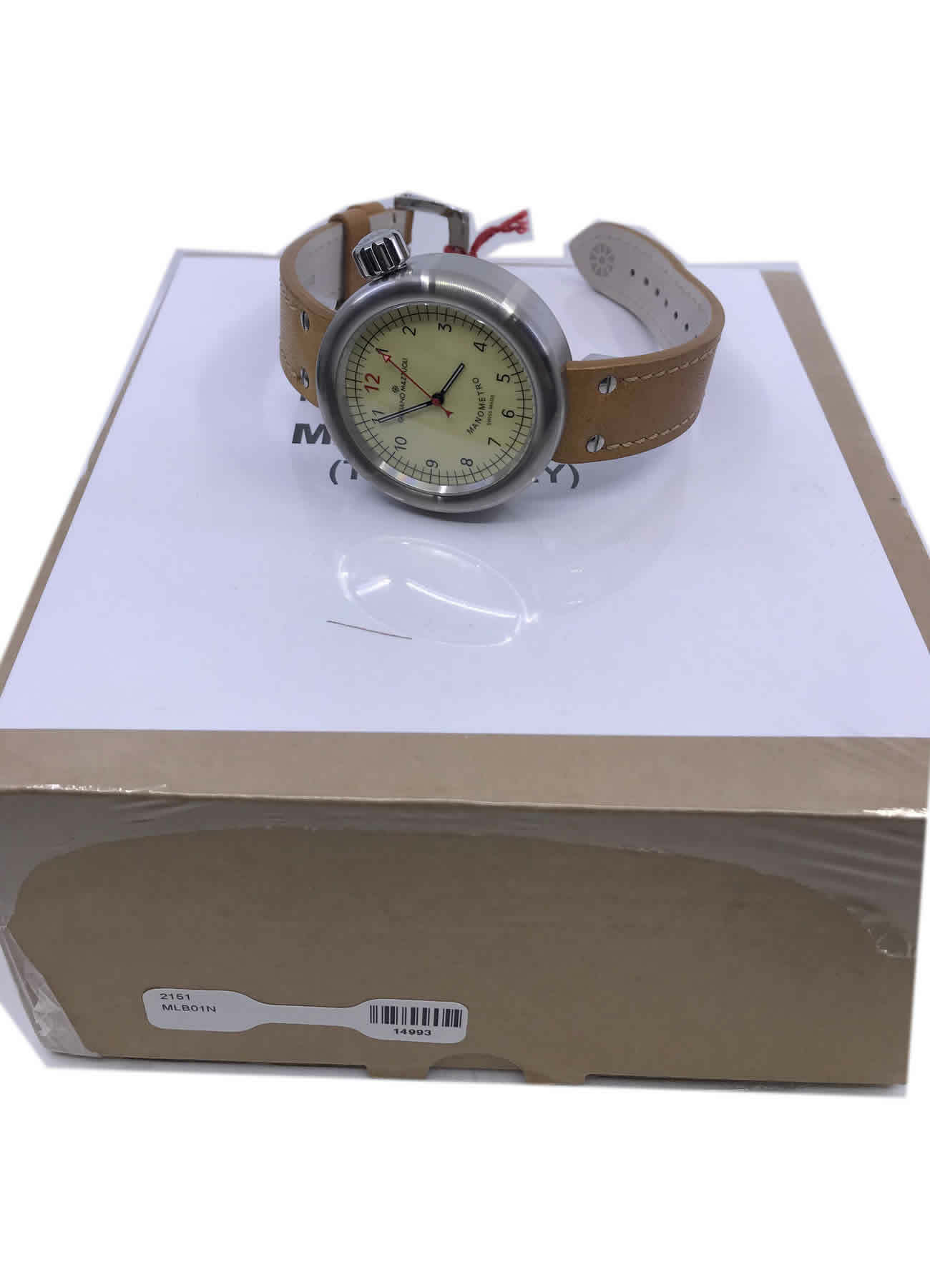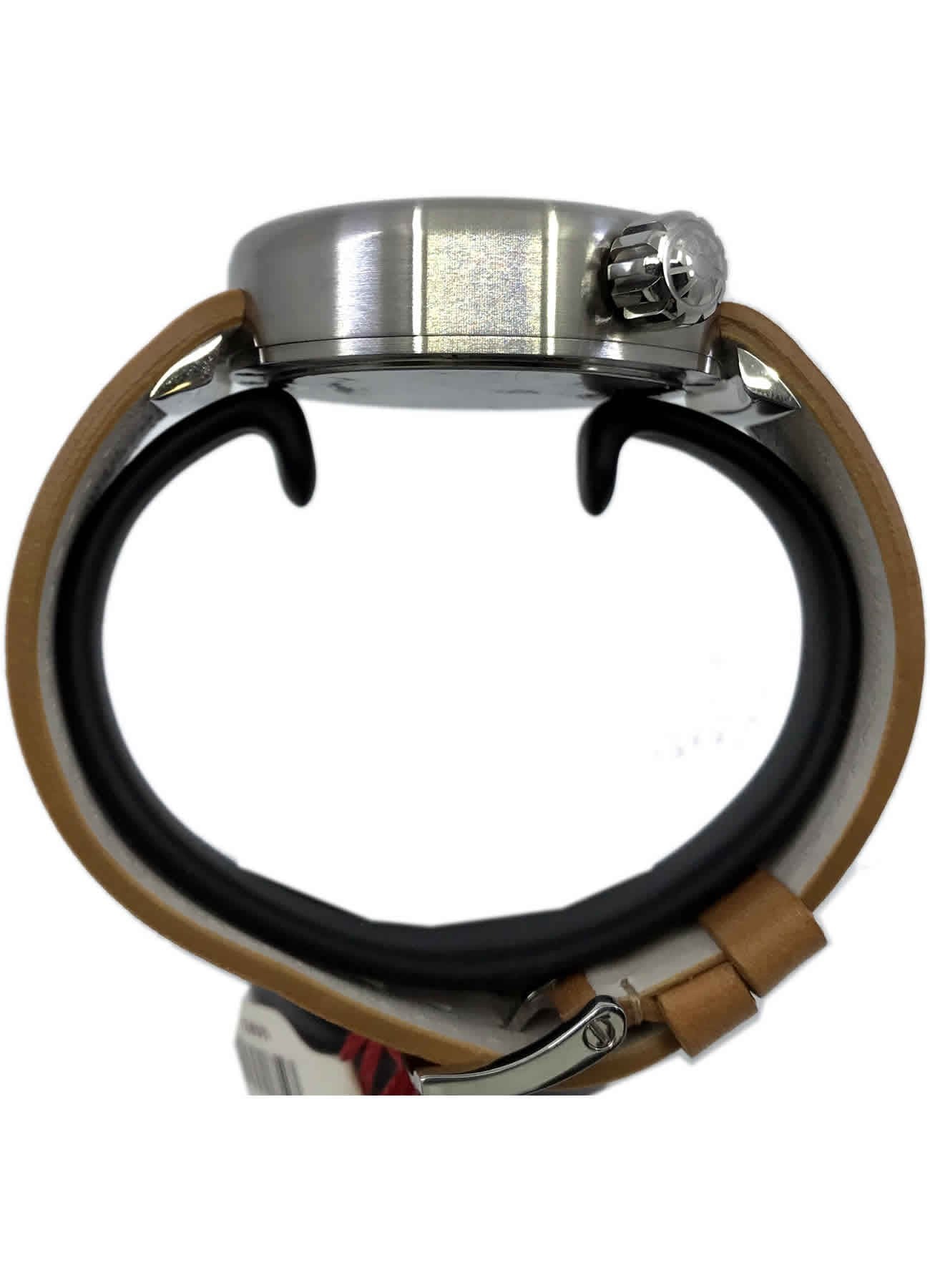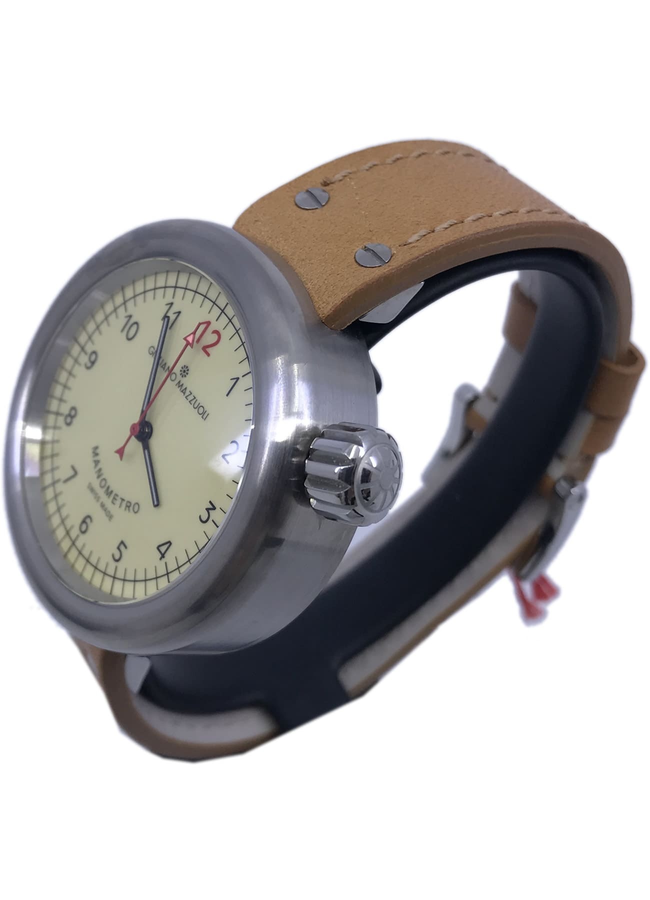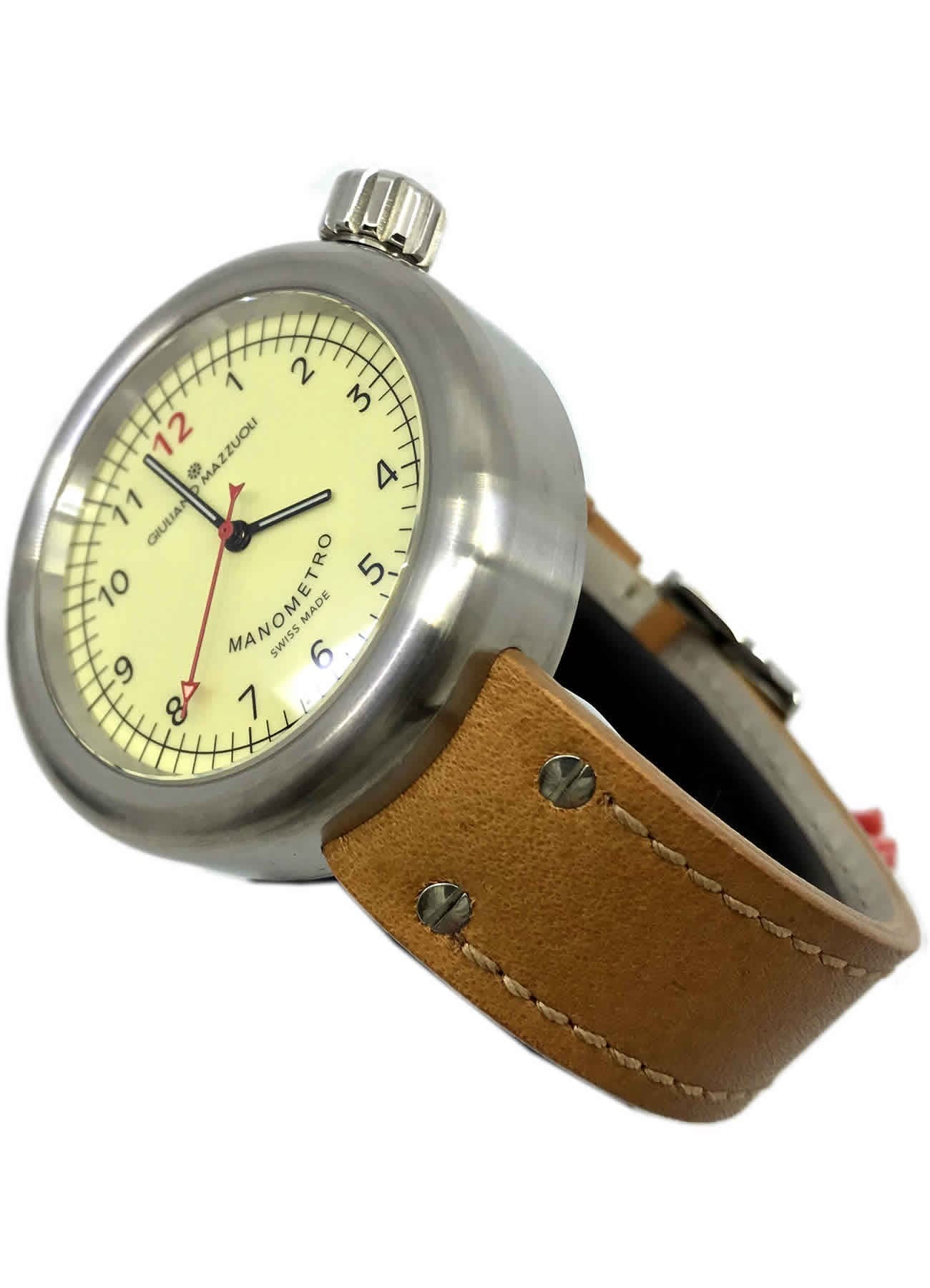 - This timepiece features a 45mm steel case paired with a high quality leather strap. It showcases a distinctive ivory dial and is powered by a precise automatic winding movement. The watch is designed with a water resistance of up to 50M.