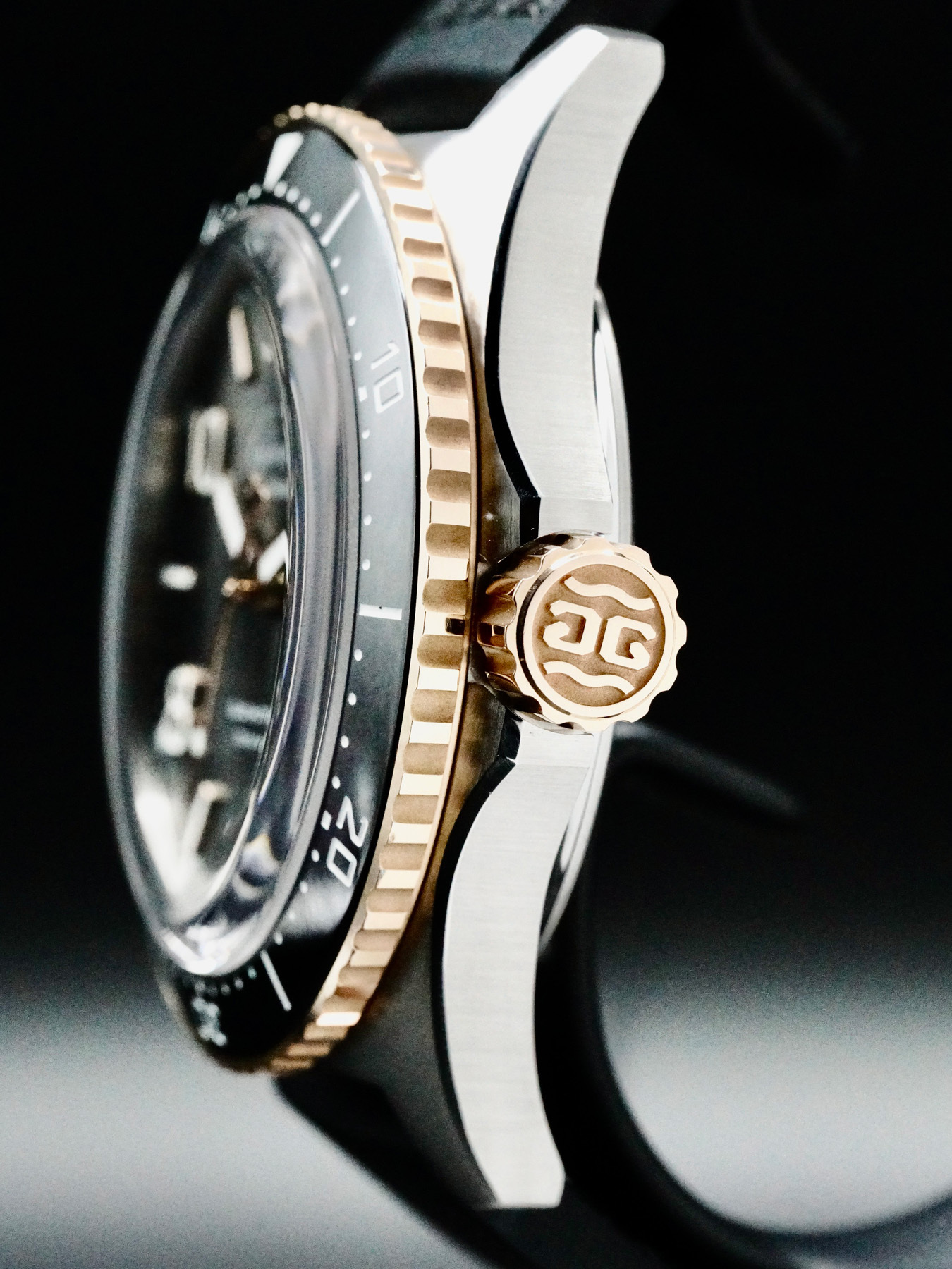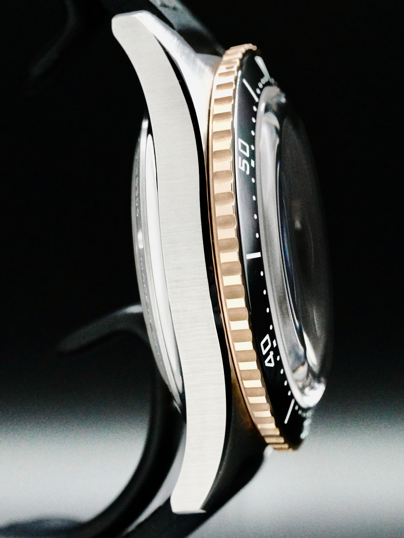 This watch features a 43 mm Stainless Steel & 18k Red Gold case on canvas strap. This watch also sports a black dial. Powered by a mechanical automatic movement. Water resistance up to 300 meters.