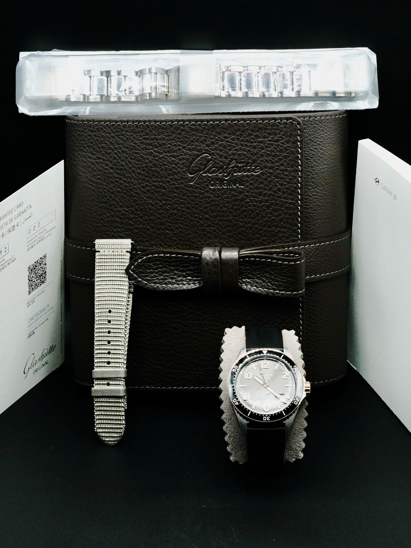 This Glashütte 1-36-13-04-91-34 SeaQ Panorama Date Steel and Gold is in EXCELLENT condition. This watch includes its original box, instruction manual, and guarantee card not dated. Extra stainless steel bracelet and tan canvas strap. This watch has been fully authenticated and certified by Exquisite Timepieces.
