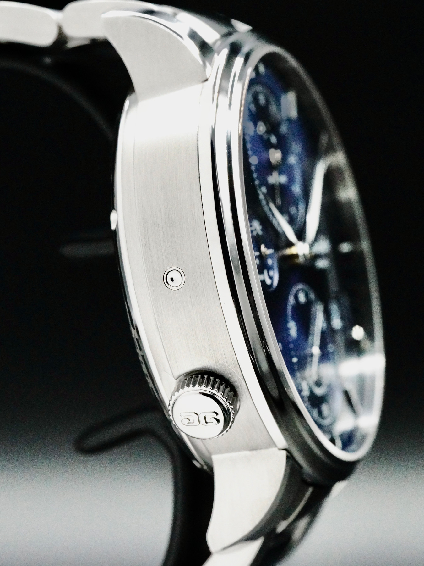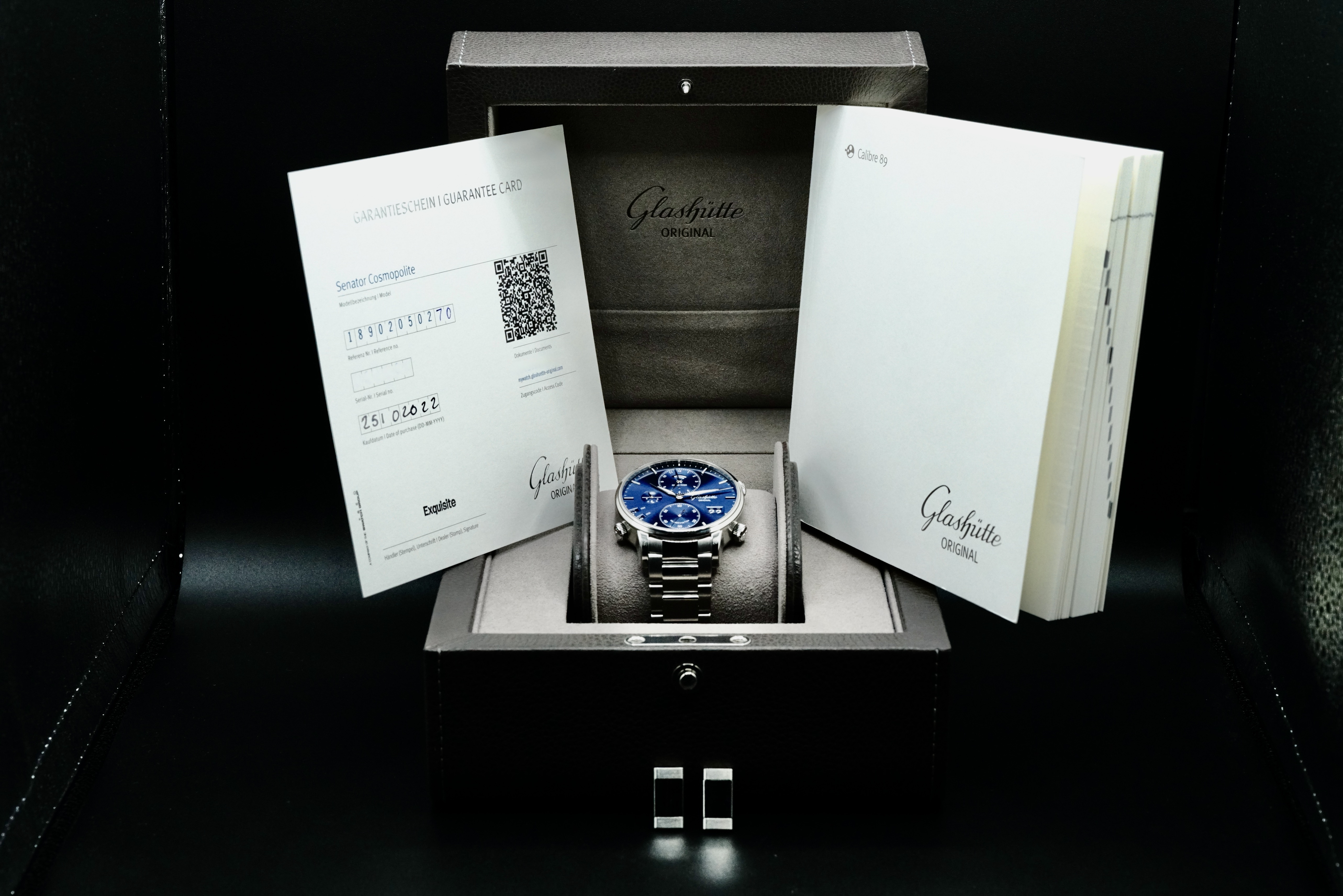 This Glashütte Original 1-89-02-05-02-70 Senator Cosmopolite Midnight Blue on Bracelet is in EXCELLENT condition. This watch includes its original box, instruction booklet and warranty card dated 2022. Extra stainless steel bracelet links. This watch has been fully authenticated and certified by Exquisite Timepieces.