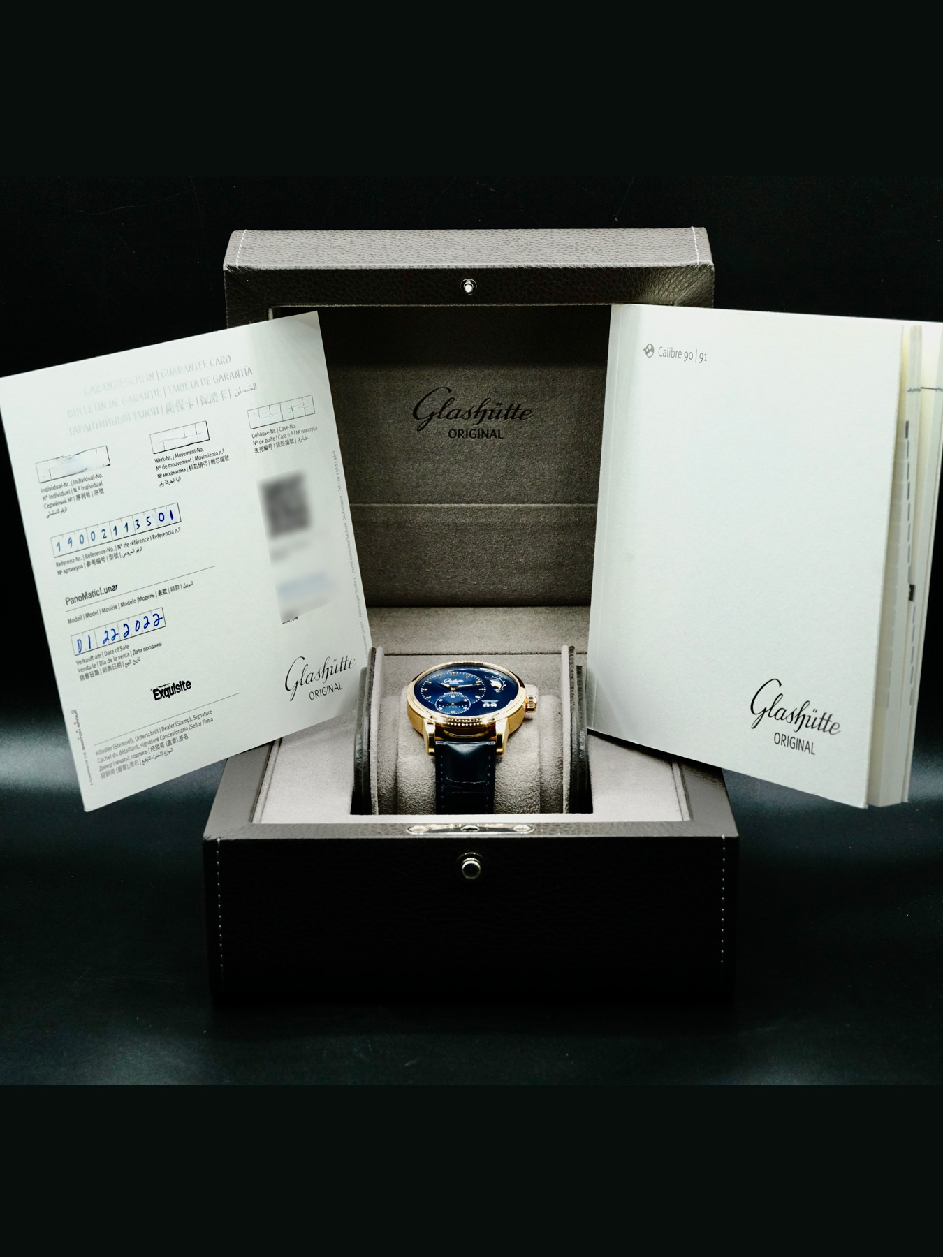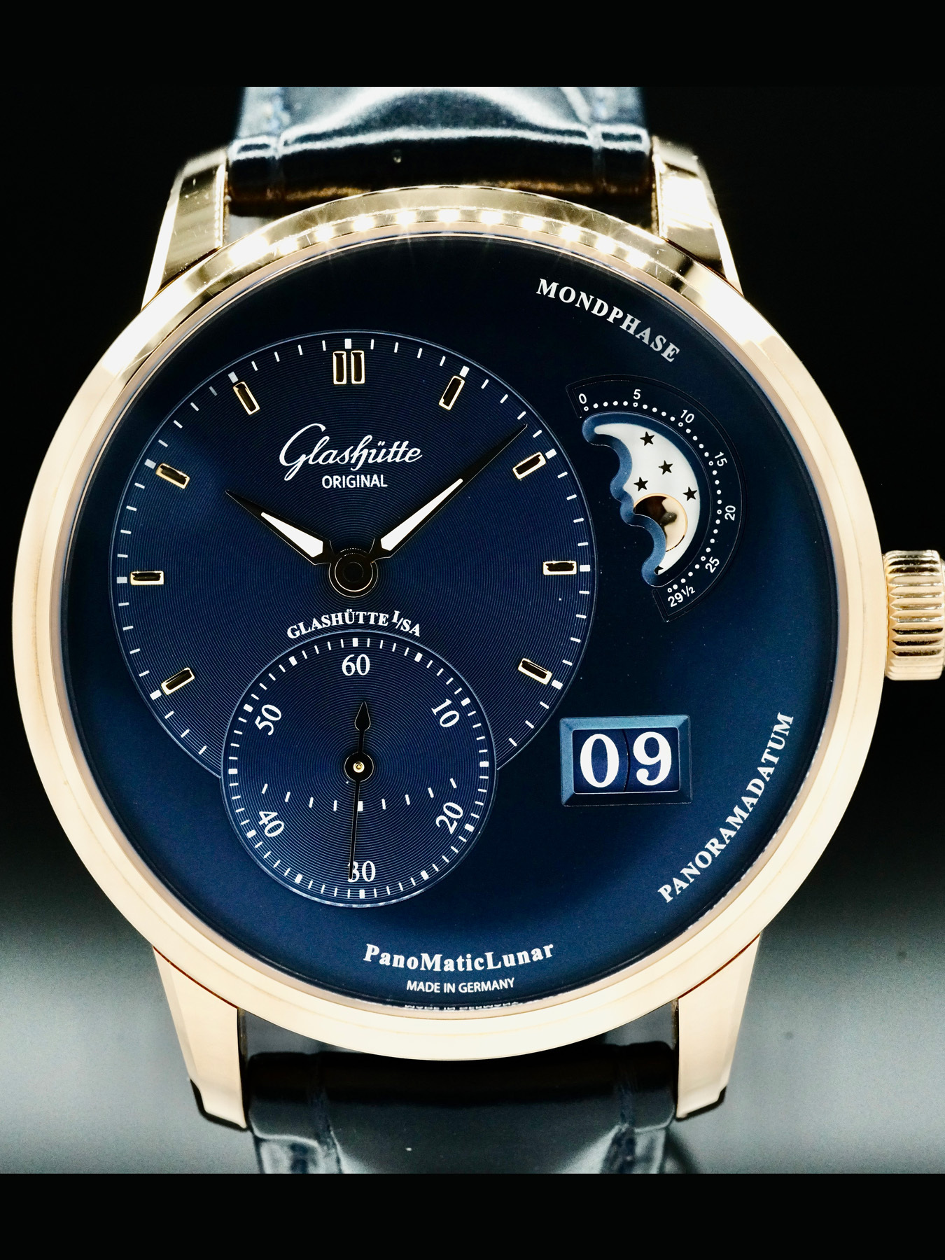 This Glashütte 1-90-02-11-35-01 Original PanoMaticLunar is in EXCELLENT condition. It has box, instructions, warranty dated January 2022.