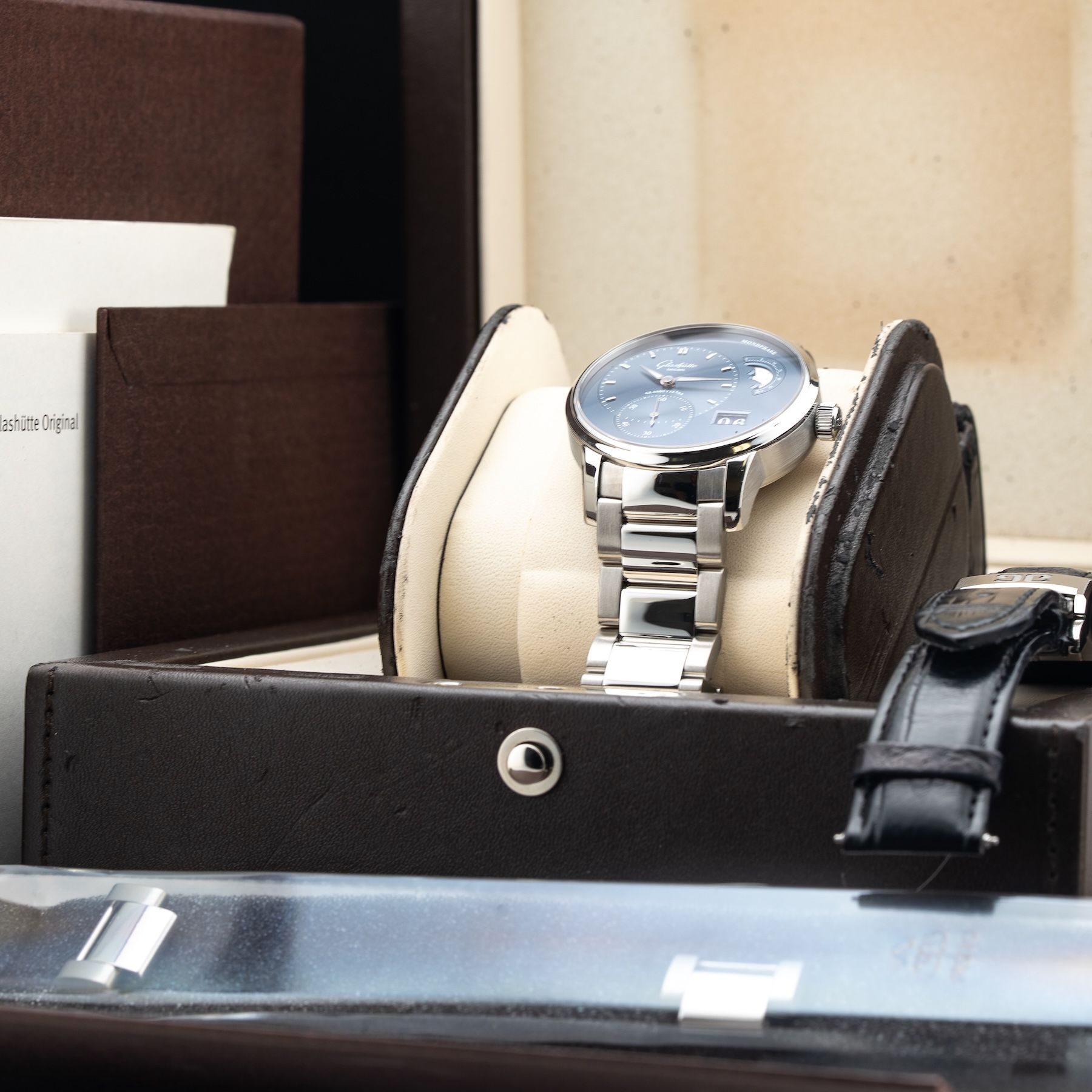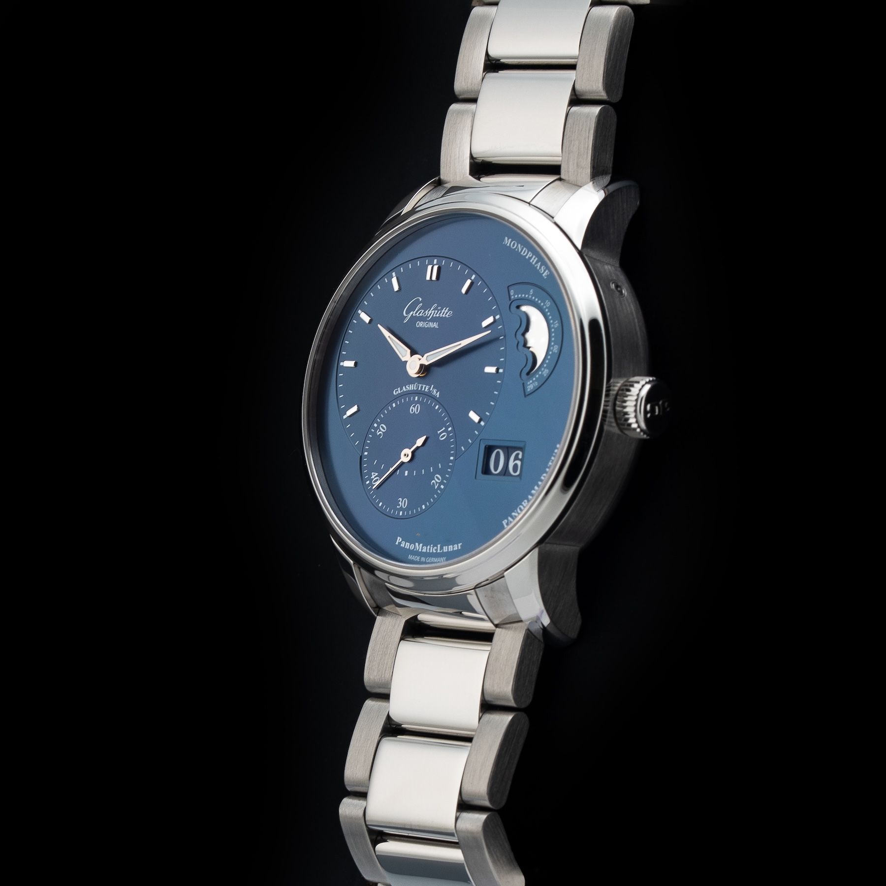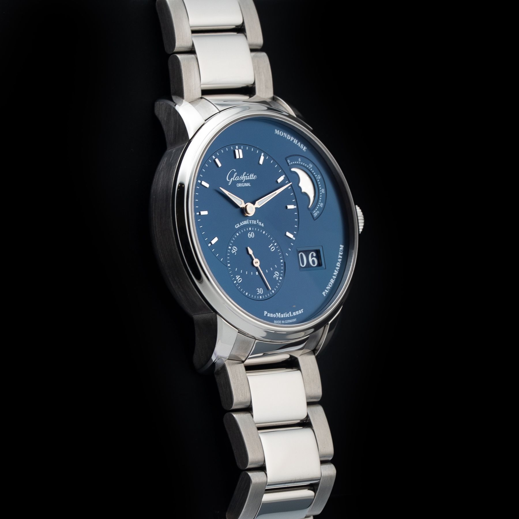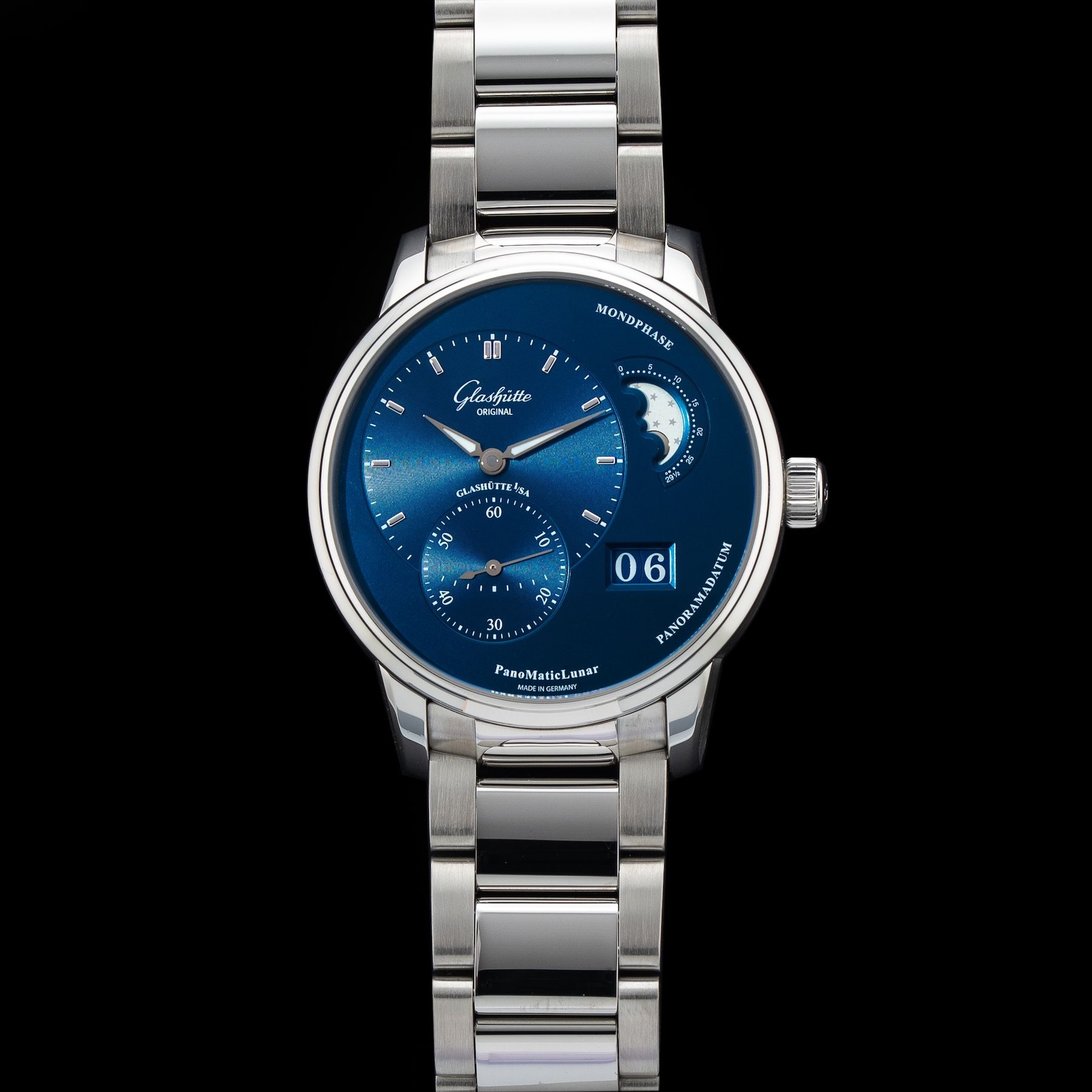 Glashütte Original PanoMaticLunar, 1-90-02-46-32-30. Stainless steel case on a stainless-steel bracelet. Also comes with a blac Louisiana alligator leather strap with deployemnt buckle. Automatic in-house Calibre 90-02, 47 jewels, approx. 42-hour power reserve, 4 Hz frequency. Asymmetric dial layout with off‑center hours/minutes, small seconds, Panorama Date, and moon‑phase indicator. Galvanic blue dial with applied silver indices and white‑gold hands; silver-toned moon disc rendered in-house via precision milling and galvanic process. Sapphire crystal with exhibition caseback displaying Glashütte three‑quarter plate, skeletonized off-center rotor with double‑G and 21 k gold oscillation weight, hand‑engraved balance bridge, swan‑neck fine adjustment. Water resistant to 50 m. Diameter: 40 mm; Thickness: approx. 12.7 mm. Warranty dated 12/08/2023