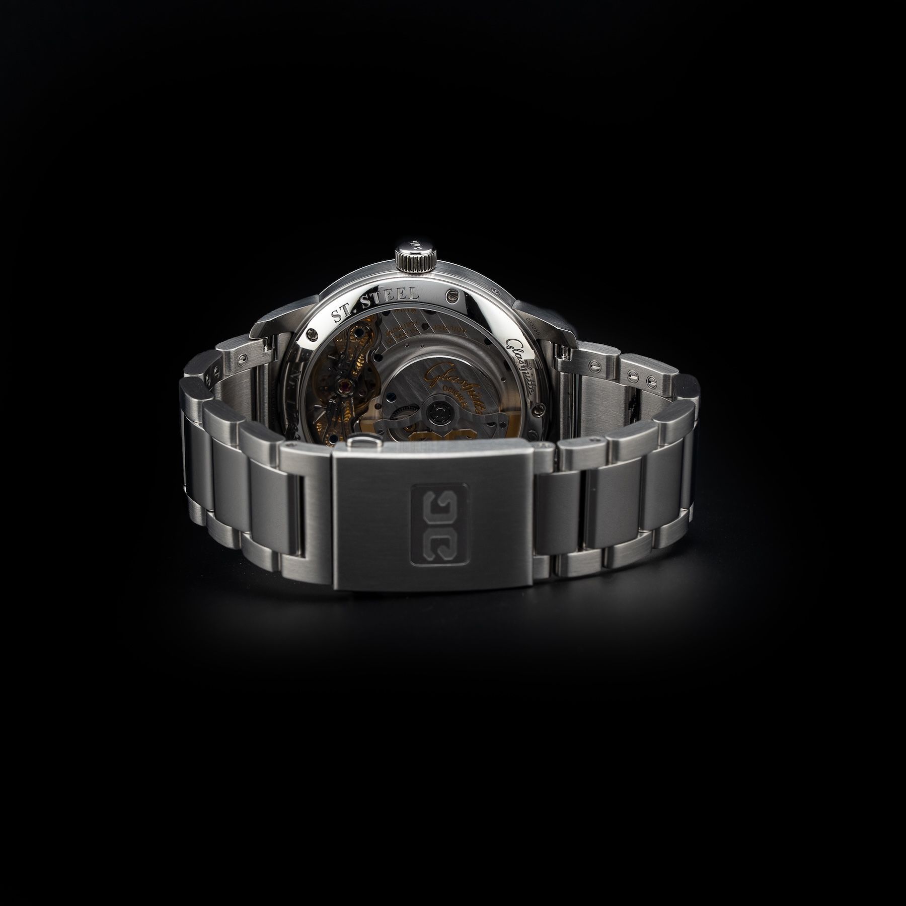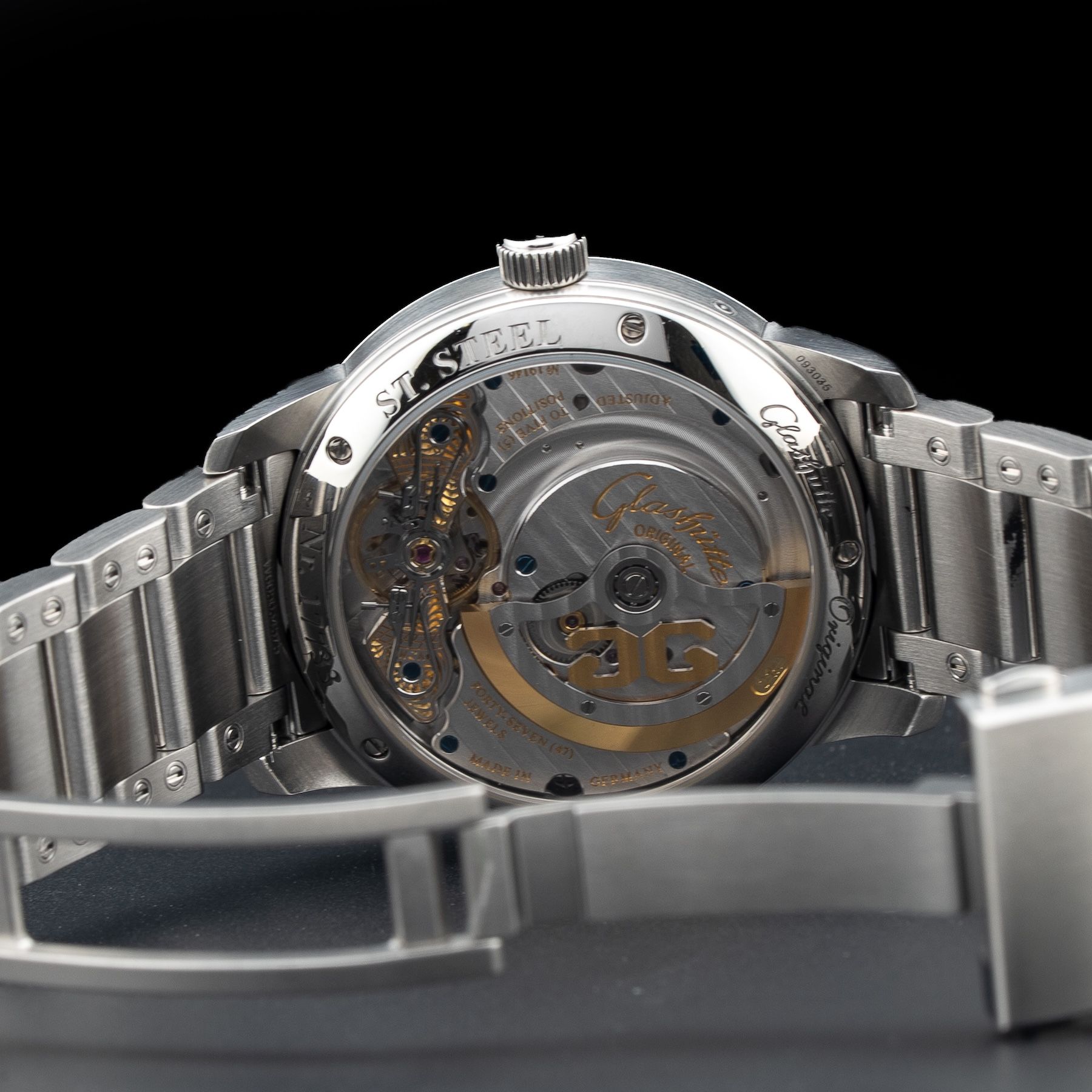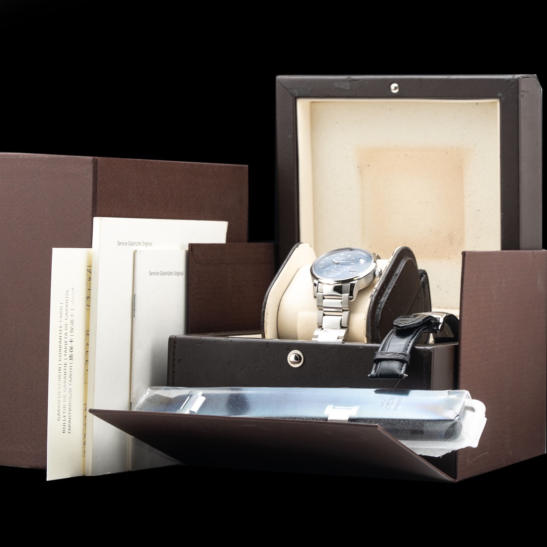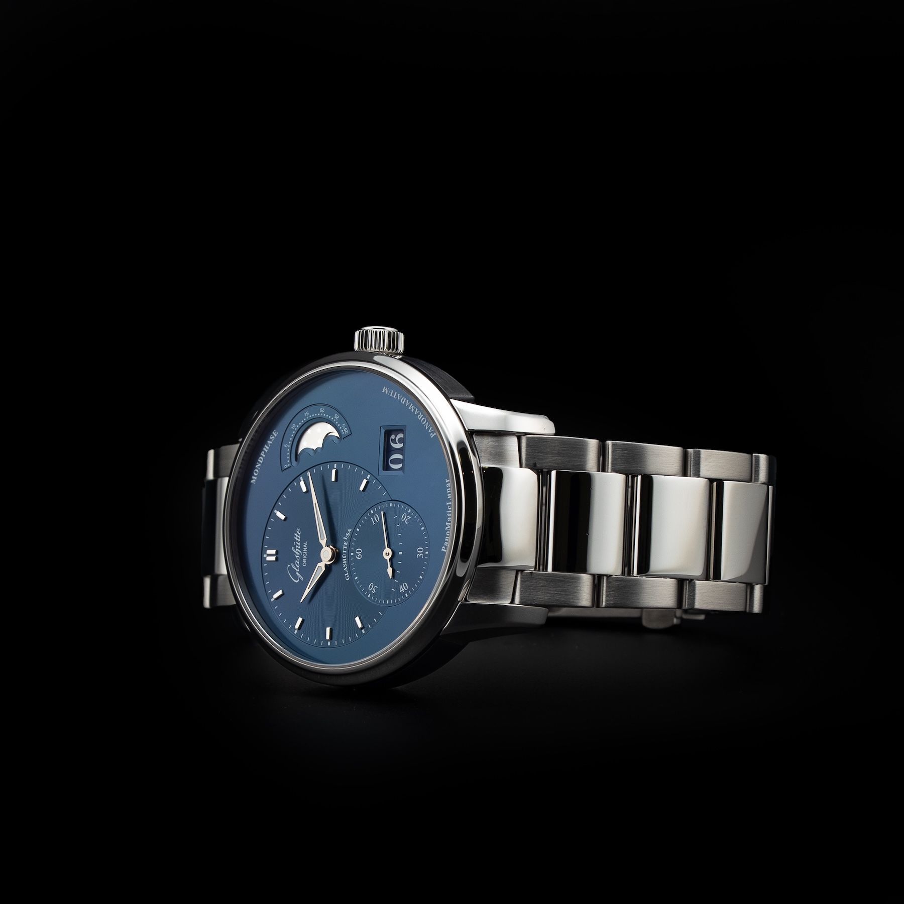 Glashütte Original PanoMaticLunar, 1-90-02-46-32-30. Stainless steel case on a stainless-steel bracelet. Also comes with a blac Louisiana alligator leather strap with deployemnt buckle. Automatic in-house Calibre 90-02, 47 jewels, approx. 42-hour power reserve, 4 Hz frequency. Asymmetric dial layout with off‑center hours/minutes, small seconds, Panorama Date, and moon‑phase indicator. Galvanic blue dial with applied silver indices and white‑gold hands; silver-toned moon disc rendered in-house via precision milling and galvanic process. Sapphire crystal with exhibition caseback displaying Glashütte three‑quarter plate, skeletonized off-center rotor with double‑G and 21 k gold oscillation weight, hand‑engraved balance bridge, swan‑neck fine adjustment. Water resistant to 50 m. Diameter: 40 mm; Thickness: approx. 12.7 mm. Warranty dated 12/08/2023