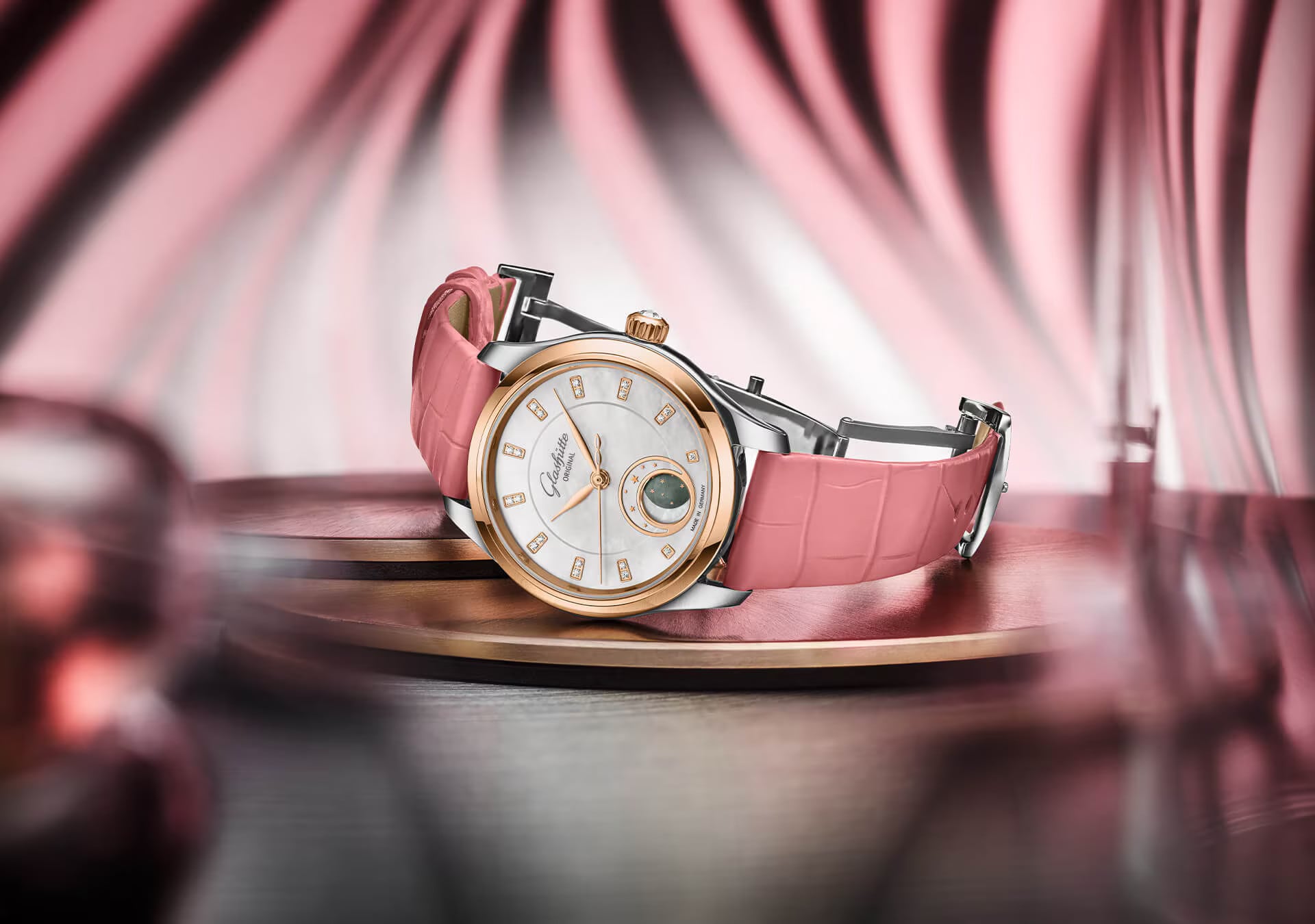 This Serenade Luna in an elegant bi-colour look attracts everyone’s attention. The sophisticated mix of warm red gold and cool stainless steel gives it an unmistakable appearance. A single diamond on the crown adds a luxurious touch. The case has a diameter of 32.5 mm and is water-resistant to 3 bar. A rose-coloured Louisana alligator leather strap tastefully rounds off this feminine timepiece.