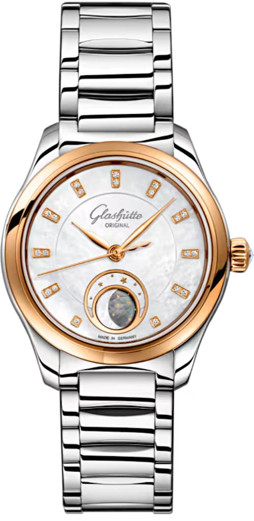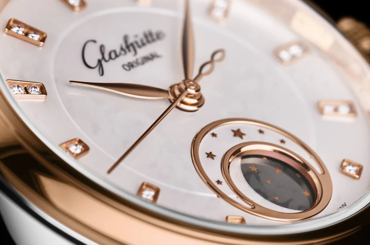 Fans of German watchmaking are also impressed by the back of this timepiece, which offers fascinating insights into the manufactory calibre 35-14. Typical Glashütte features and finishes can be seen through the sapphire crystal case back: the accurate stripe finish on the Glashütte three-quarter plate, the sunburst finish on the reduction wheel, the polished and blued screws and the solid gold rotor plate with fine shell decoration.
