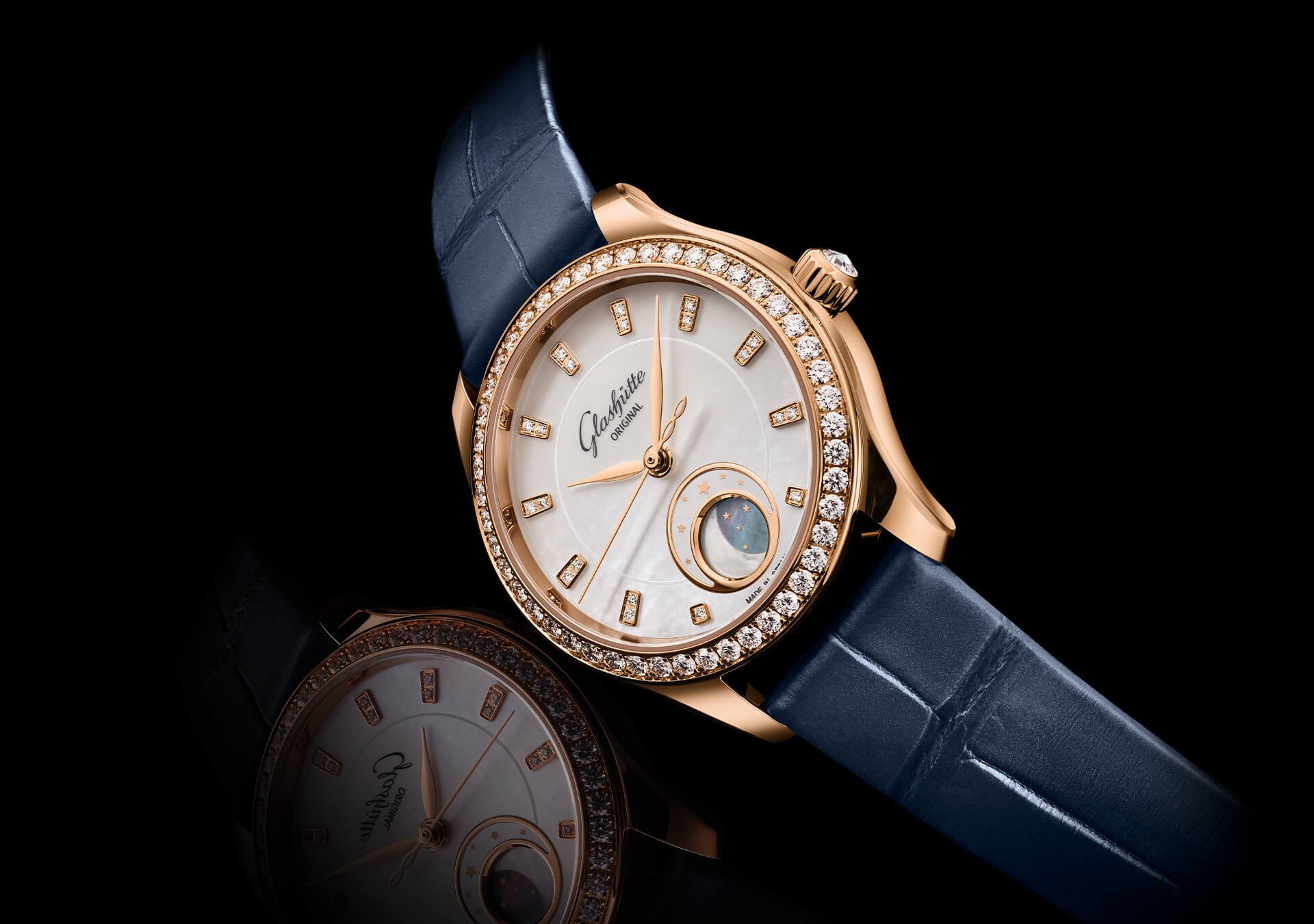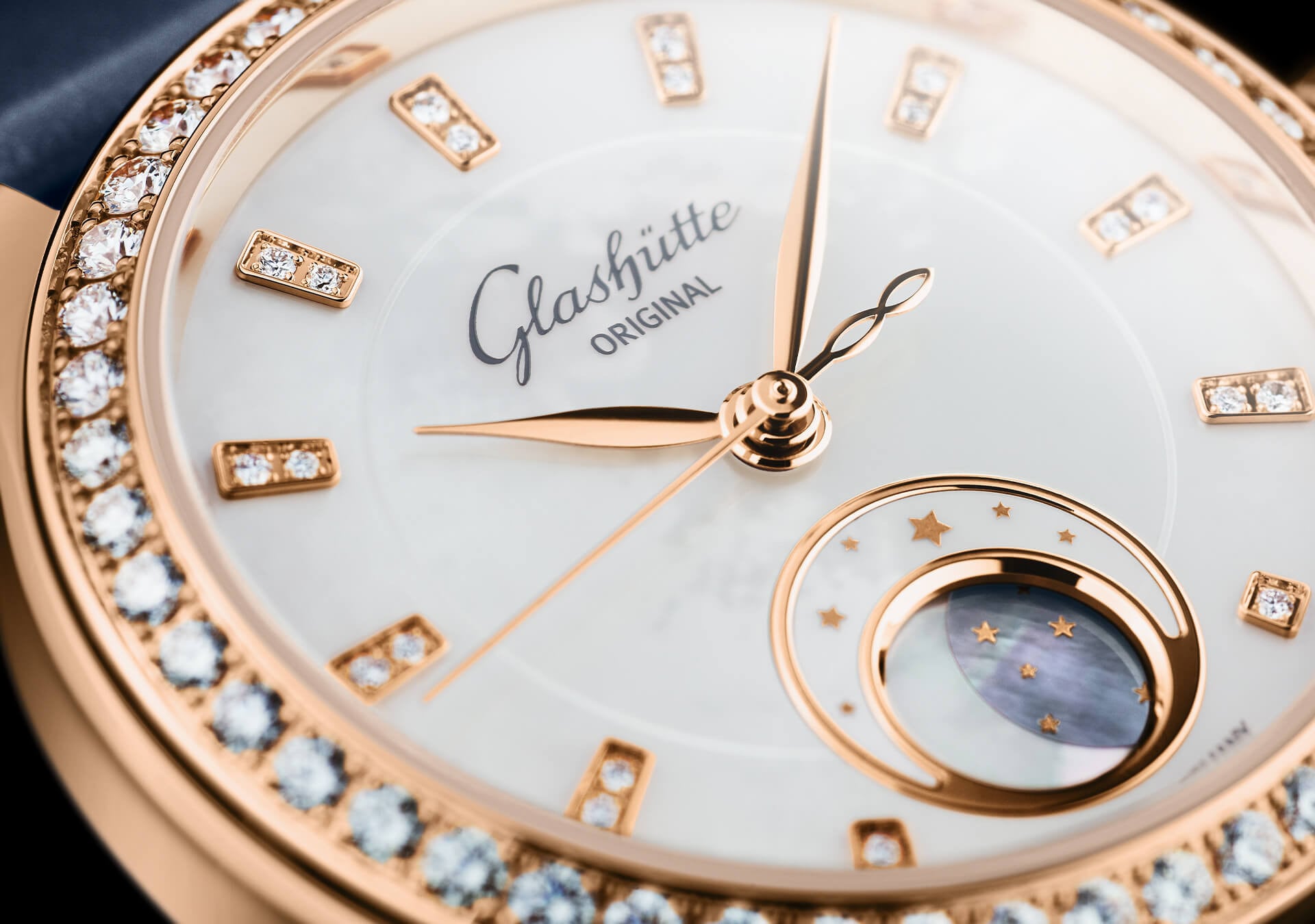 The dial in ‘Shimmering White’ is made in-house from natural mother-of-pearl. It is set with a total of 20 brilliant-cut diamonds, which serve as hour markers and sparkle in competition with the diamond-studded bezel. The delicately crafted hands, which are also made of red gold, round off the elegant overall appearance of this luxurious Serenade Luna.