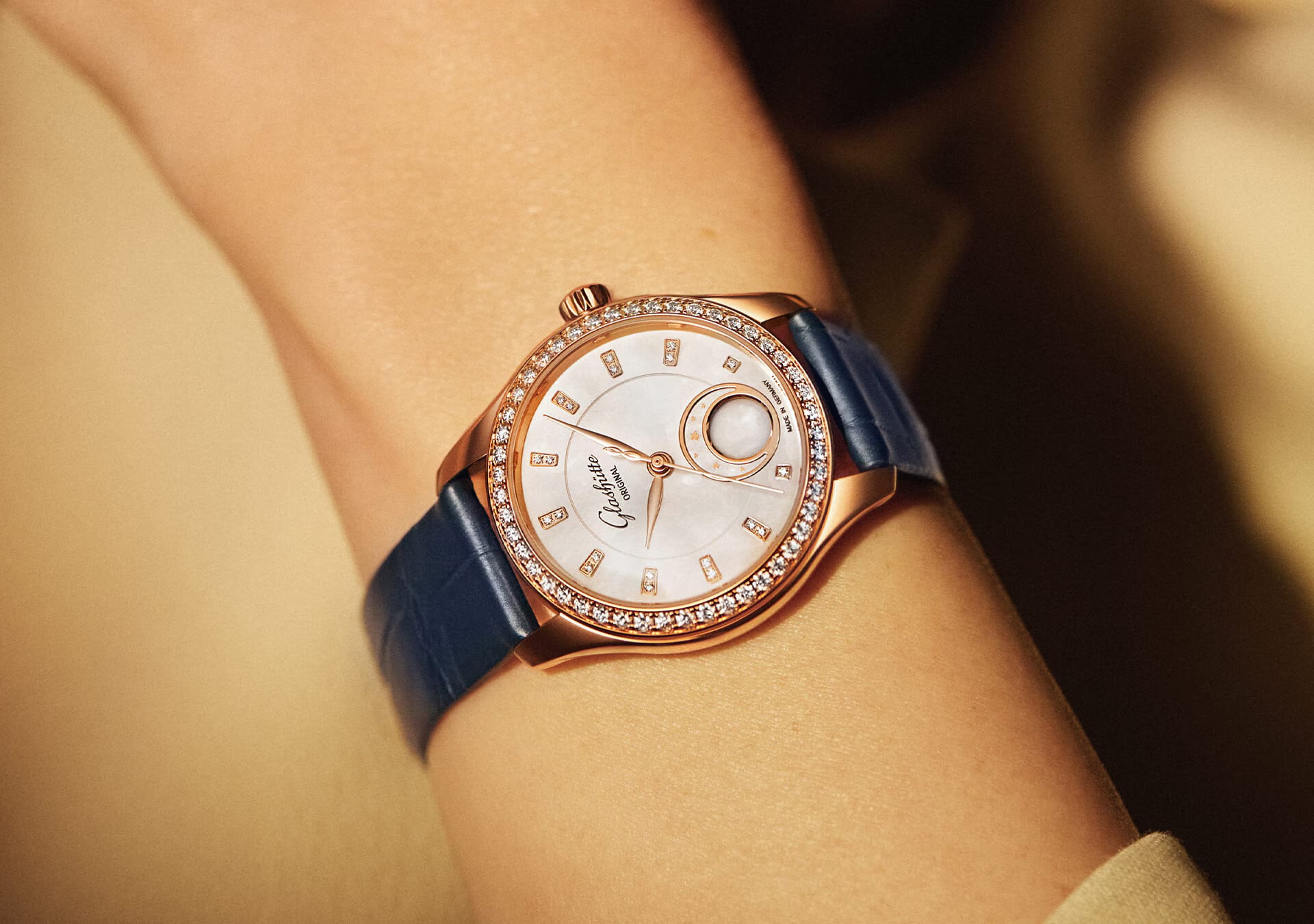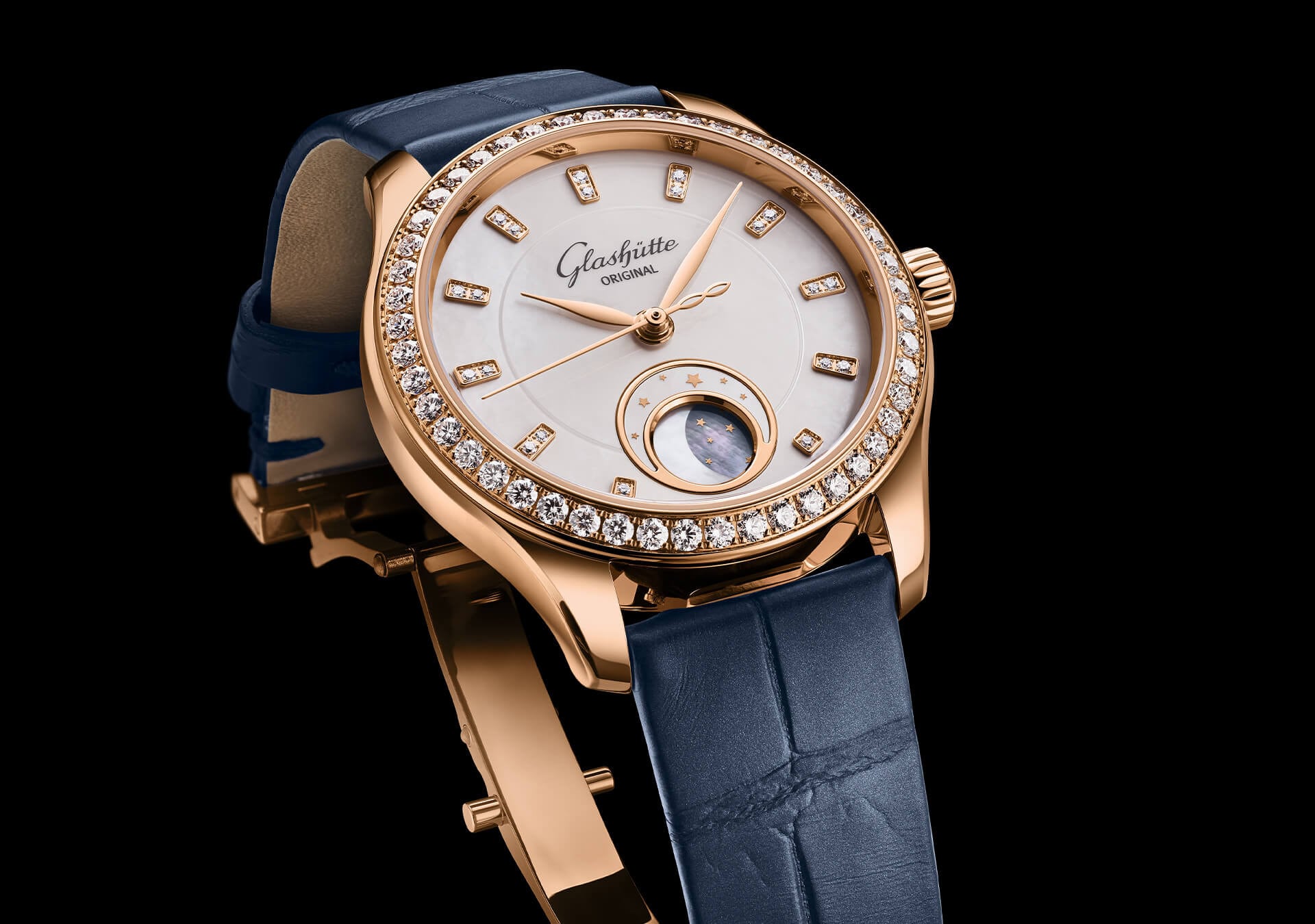 The back of this feminine timepiece is equally impressive and offers fascinating insights into the automatic calibre 35-14, while typical Glashütte features and traditional decorations can be easily admired through the sapphire crystal case back. A deep blue Louisana alligator leather strap completes this piece of jewellery and ensures a reliable hold on the wrist.