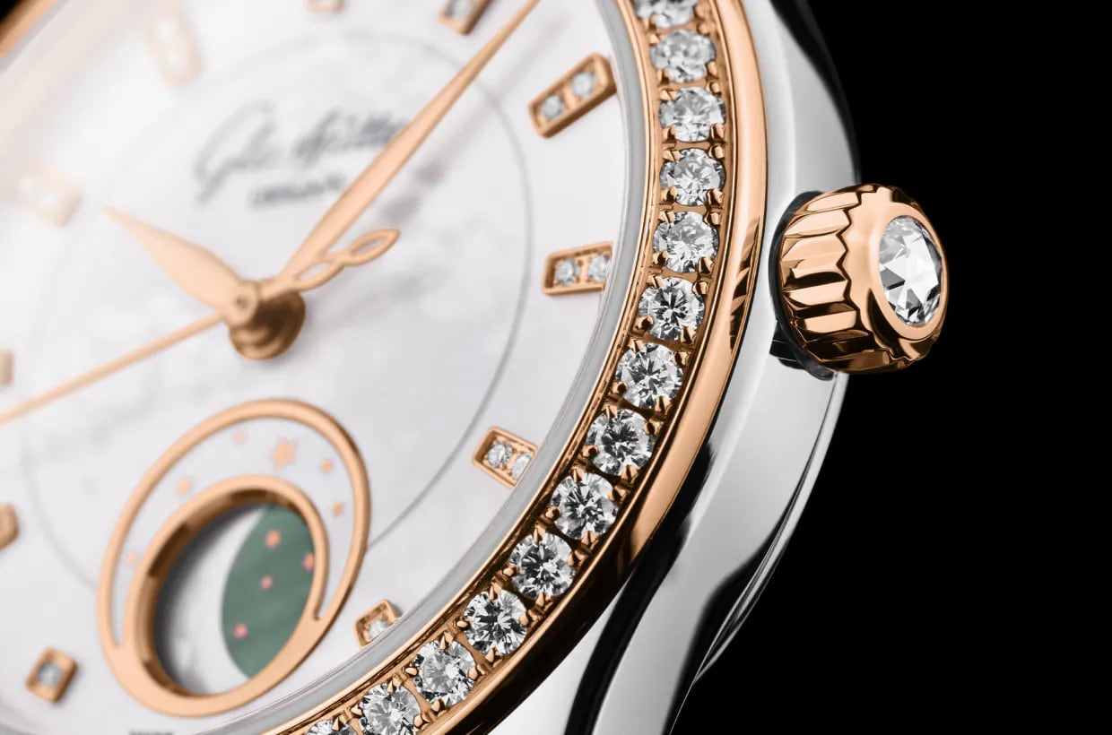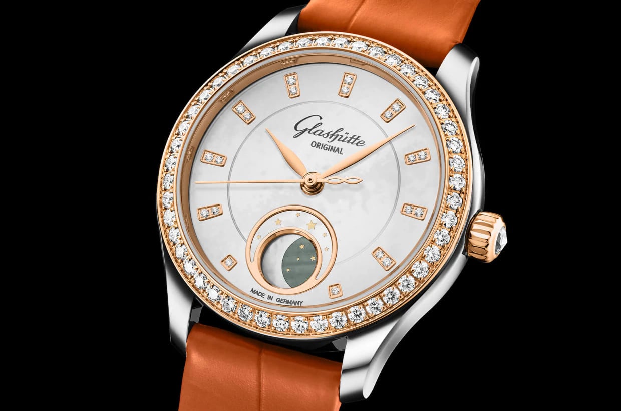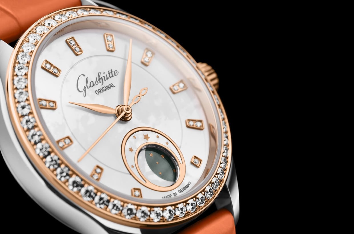 The delicate dial in ‘Shimmering White’ comes from our own manufactory and is elaborately crafted by hand. The white mother-of-pearl is adorned with red gold indexes set with a total of 20 brilliant-cut diamonds. These are set against a sparkling brilliant-cut diamond bezel and a rose-cut diamond on the crown. An absolute visual highlight is the unusual moon phase display, which is located in a round dial cut-out at 6 o’clock.