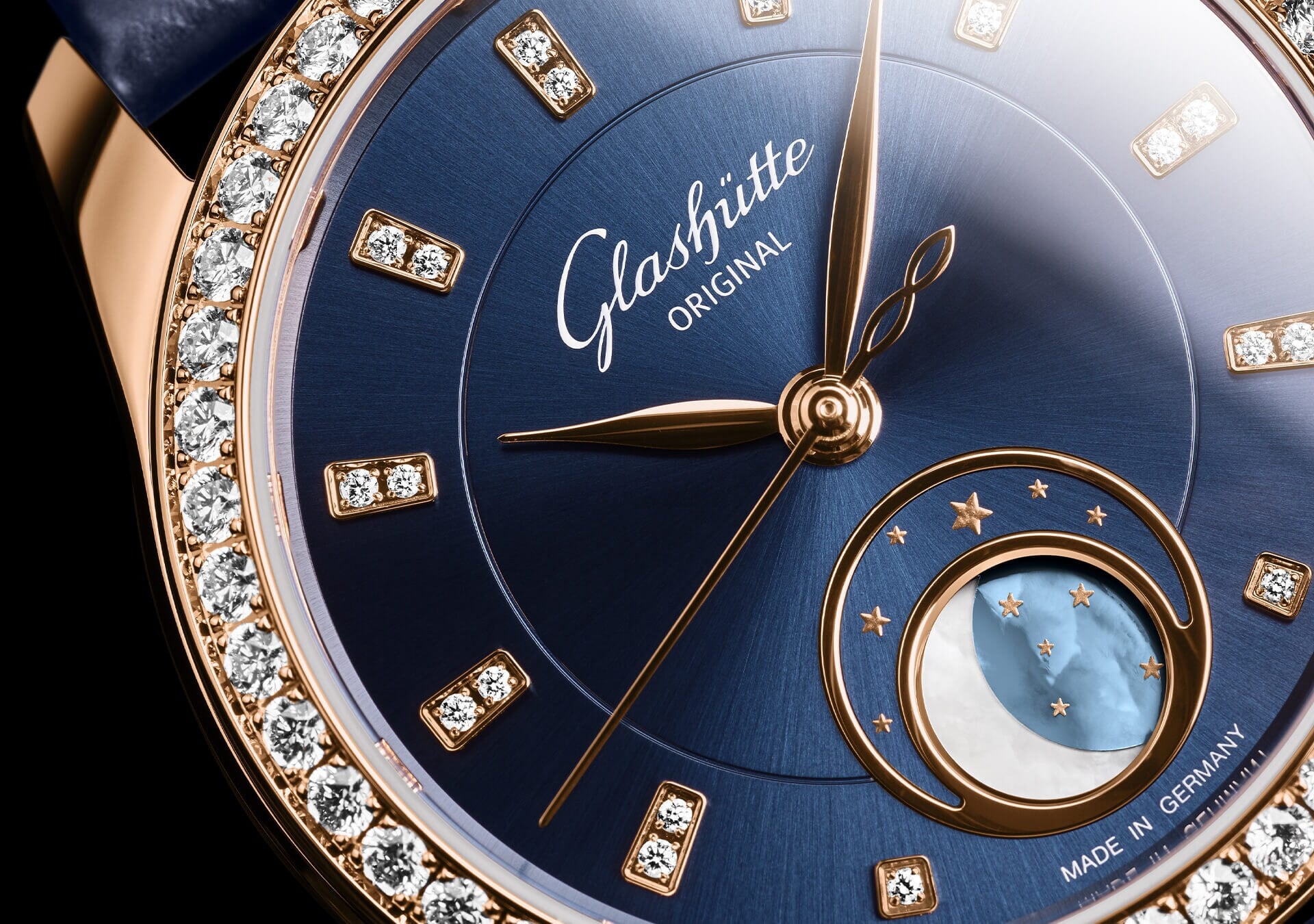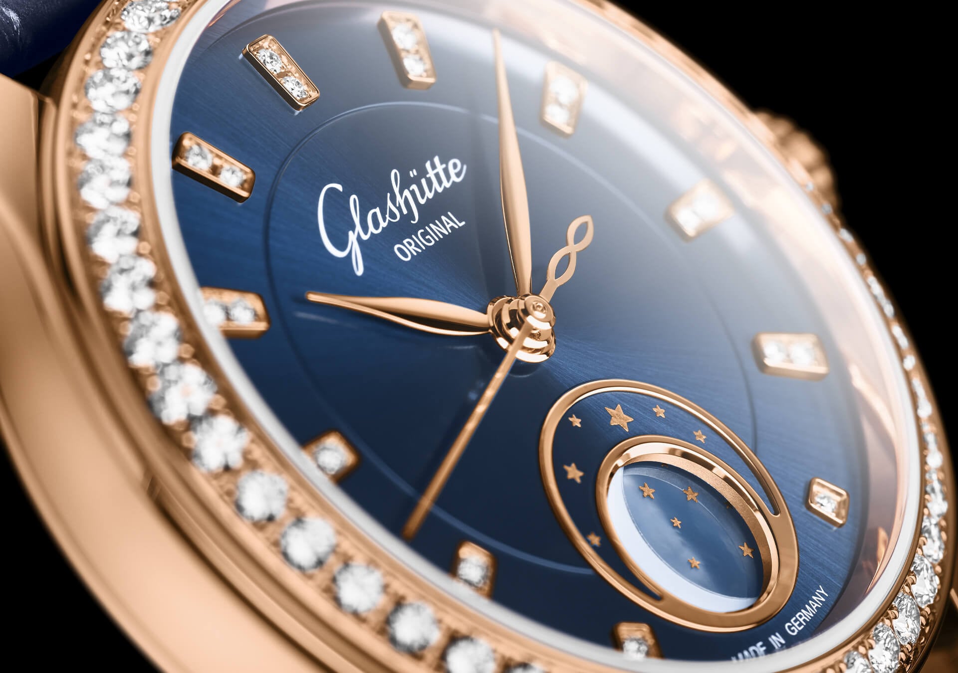 The dial in ‘Radiant Blue’ is made by hand in our own dial manufactory. The galvanic blue colour is reminiscent of the clear sky on a summer’s night; a fine sunray finish lends the dial surface vibrancy and depth. The hour markers are set with a total of 20 sparkling diamonds that resemble shining stars – an impression that is emphasised by the elaborately crafted moon phase.