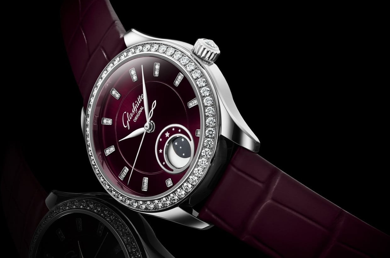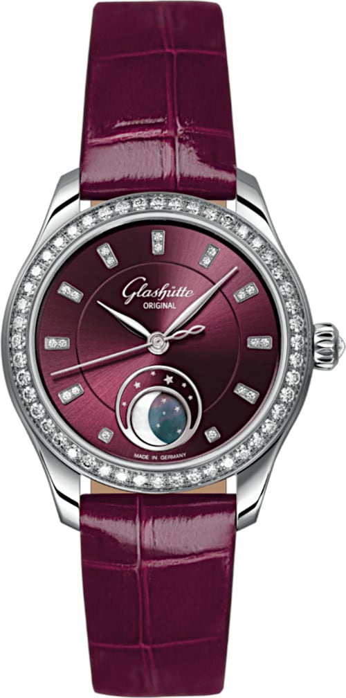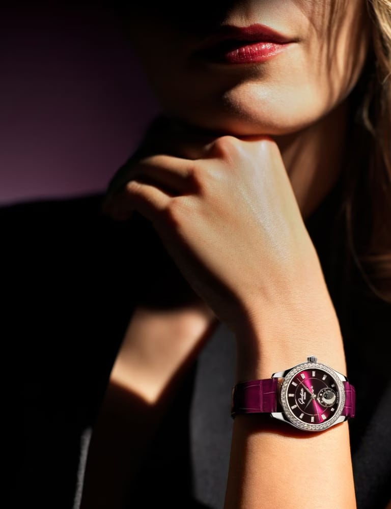 The Serenade Luna presents itself in a colour reminiscent of velvet and silk. The dark violet is a luxurious composition of red and blue, inspired by the Gynura aurantiaca, also known as the ‘velvet plant’. It appears spiritual, inspiring and mysterious at the same time. A fine sunray finish and translucent lacquer on the dial create visual depth, while the lively reflections of the diamond indexes and the sparkling diamond-set bezel underline the jewellery character of the watch.