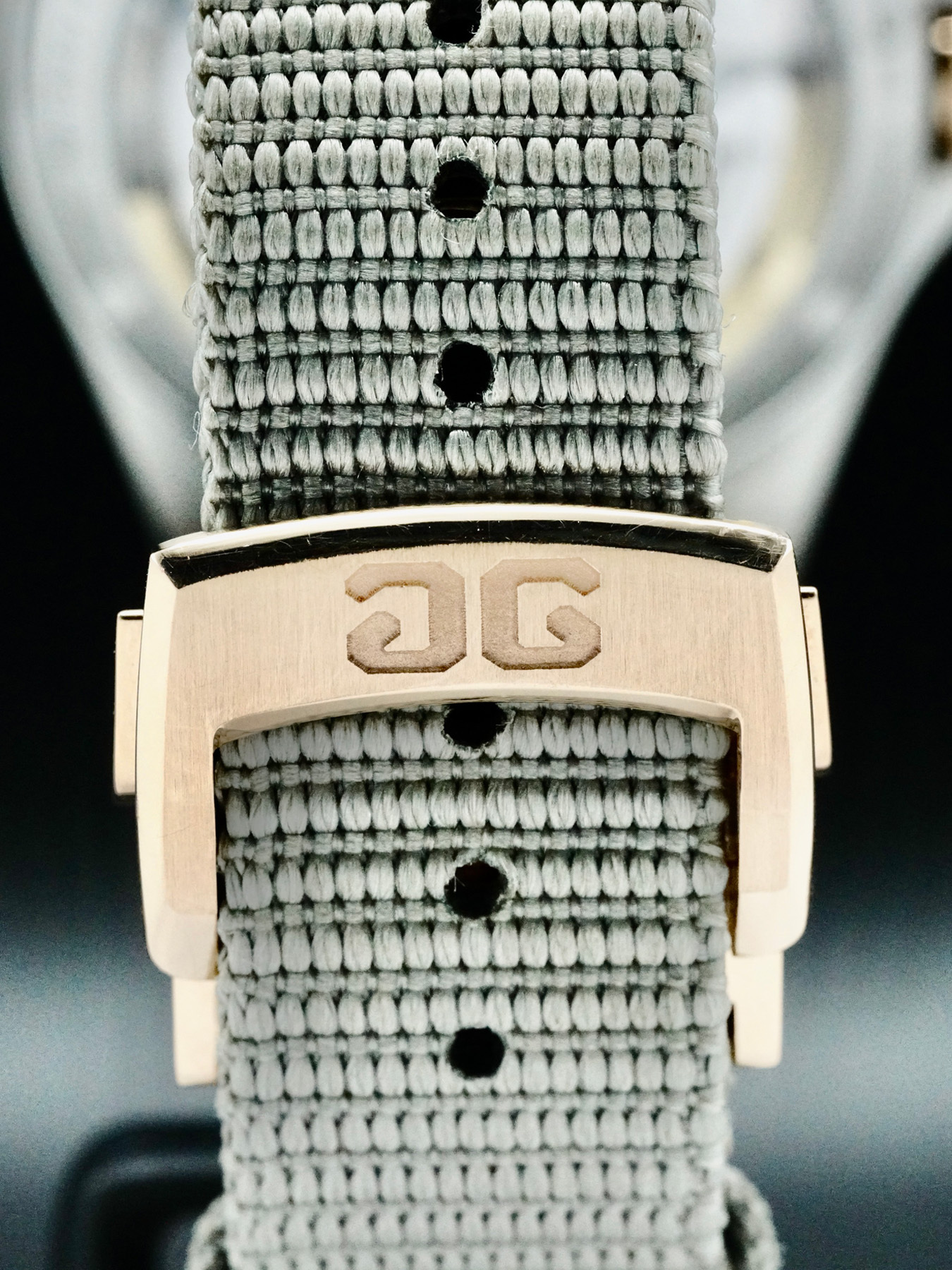 This Glashütte Original SeaQ Panorama Date features a 43mm stainless steel & 18k red gold case with a display case back on a grey canvas strap with an 18k red gold buckle. This watch also sports a black galvanic dial with sunray finish & luminous red gold-tone hands and Arabic numeral dial marker covered by scratch resistant sapphire crystal.