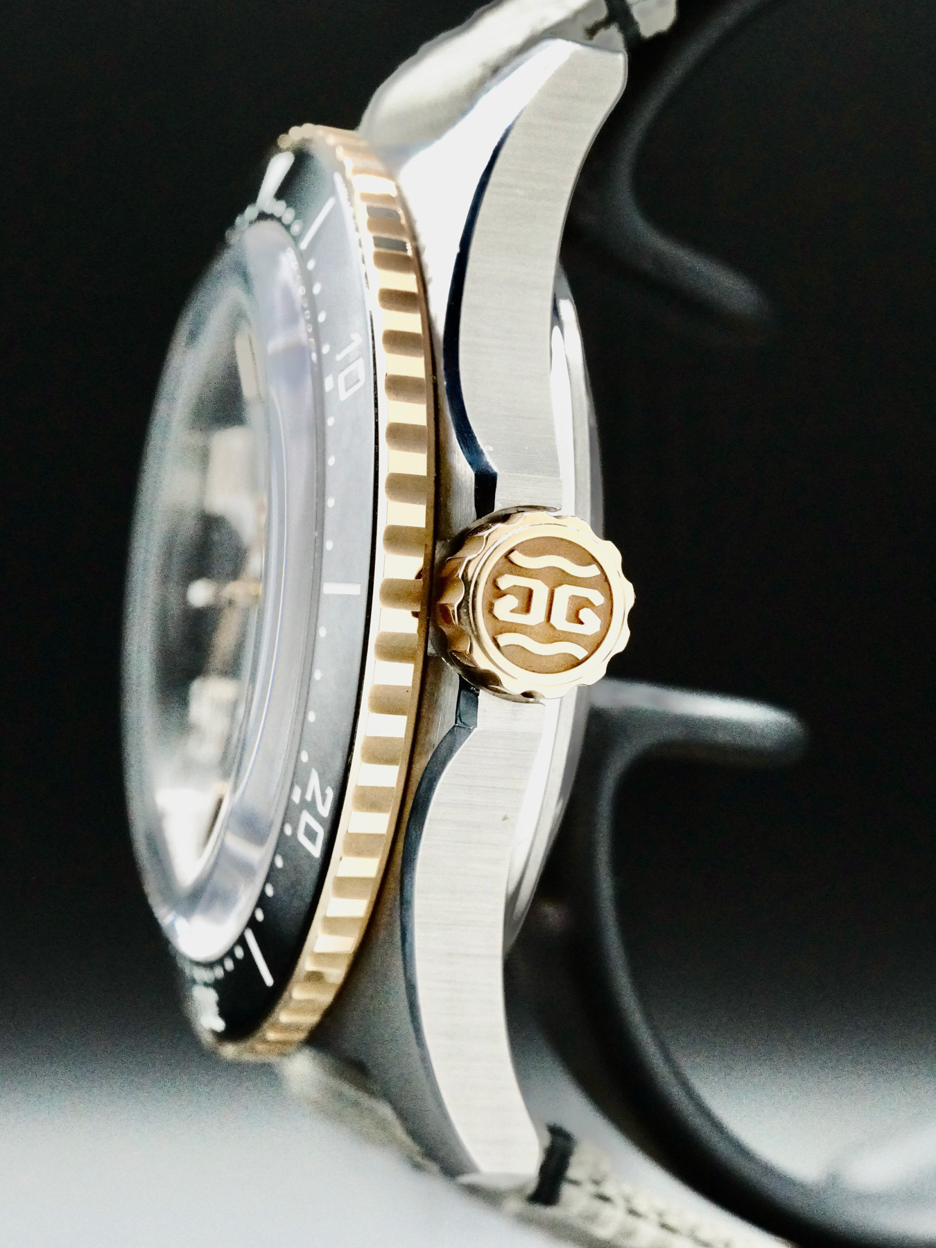 This watch features a 43 mm Stainless Steel & 18k Red Gold case on canvas strap. This watch also sports a black dial. Powered by a mechanical automatic movement. Water resistance up to 300 meters.