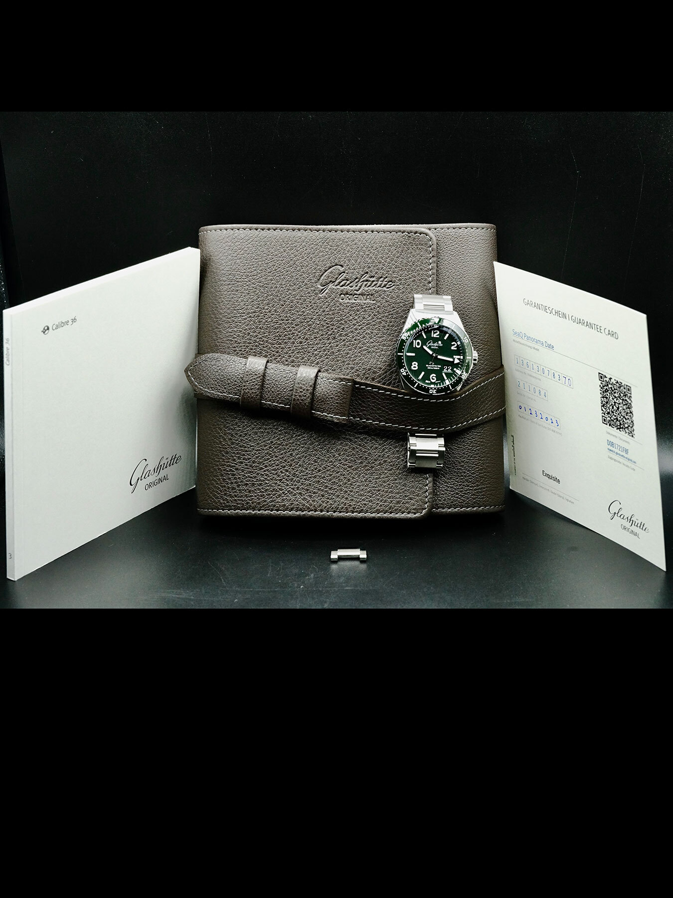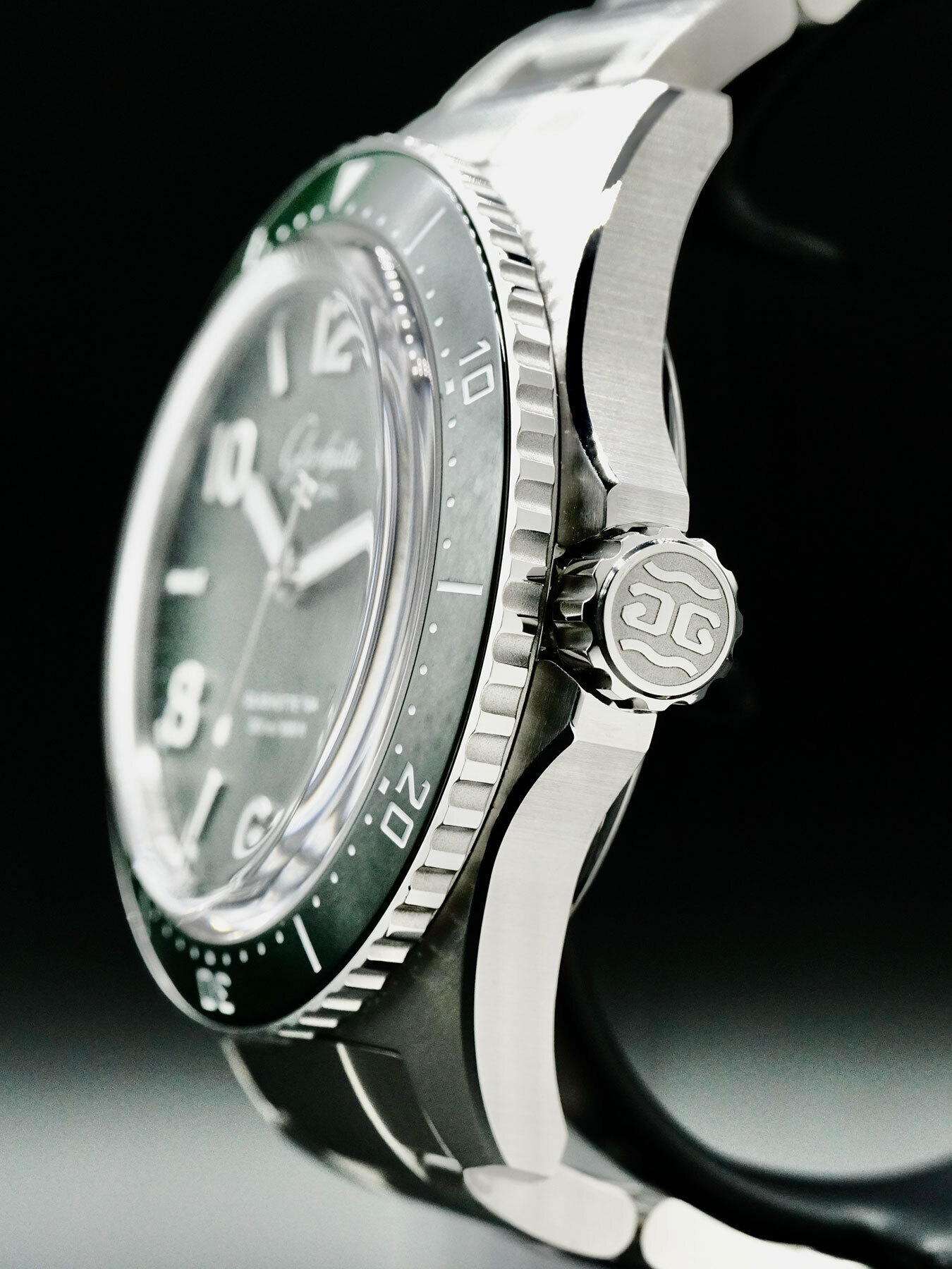 This Glashütte Original 1-36-13-07-83-70 SeaQ Panorama Date Reed Green on Bracelet is in EXCELLENT condition. This watch includes its original box, instruction manual, examination certificate, and guarantee card dated for January 2023. Extra stainless steel bracelet links.
