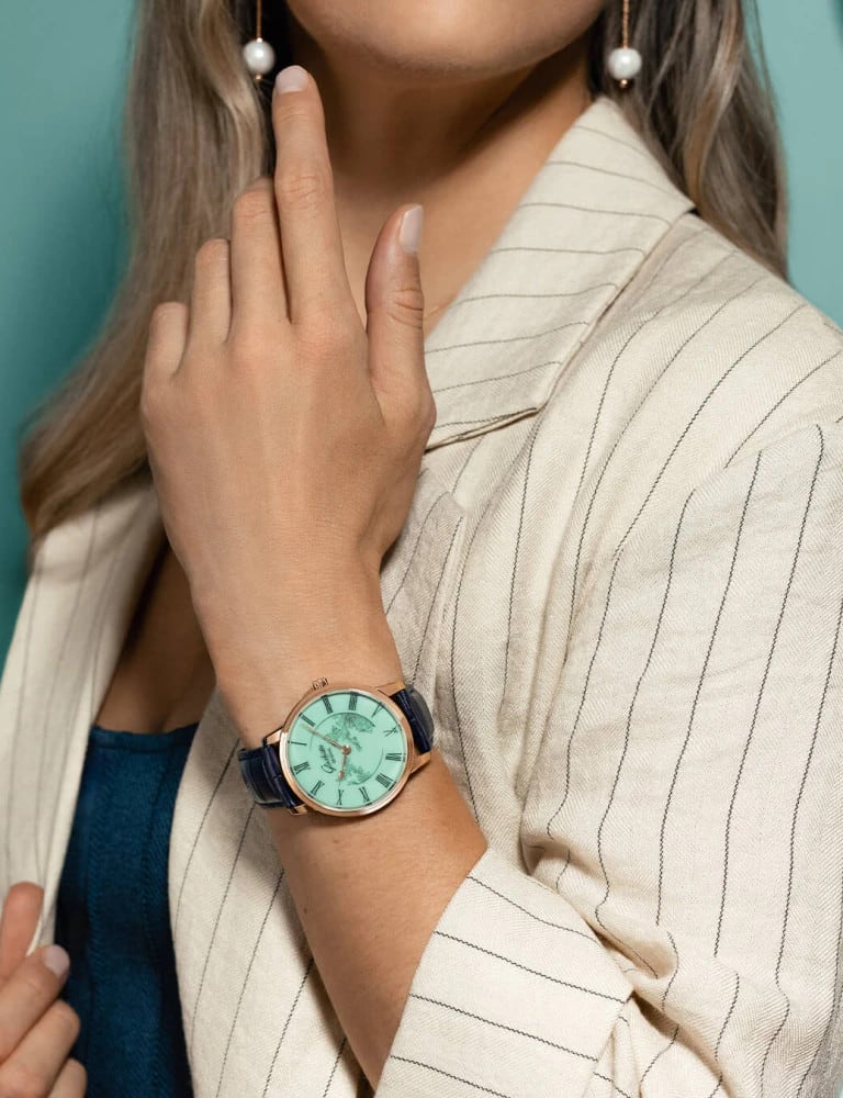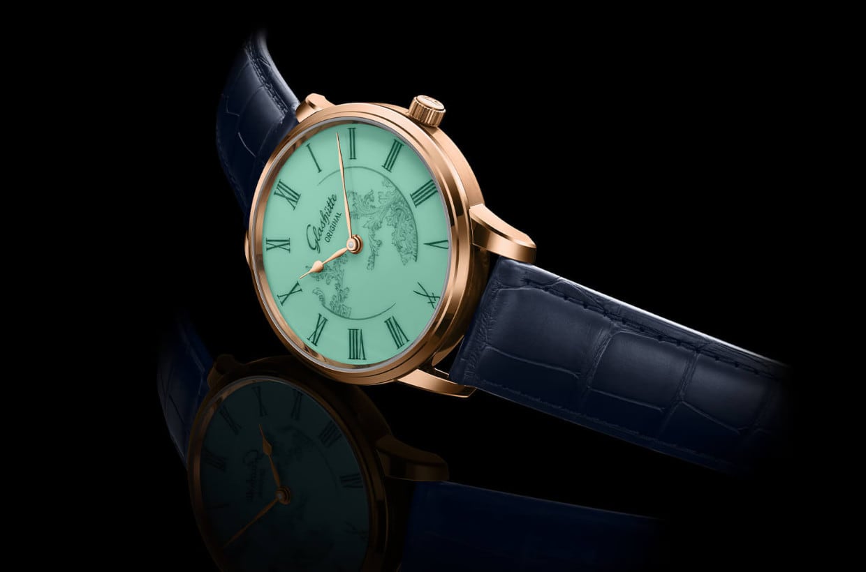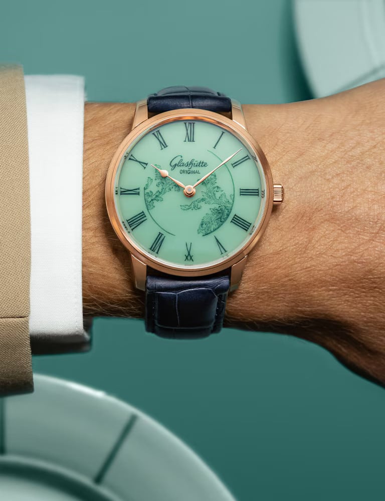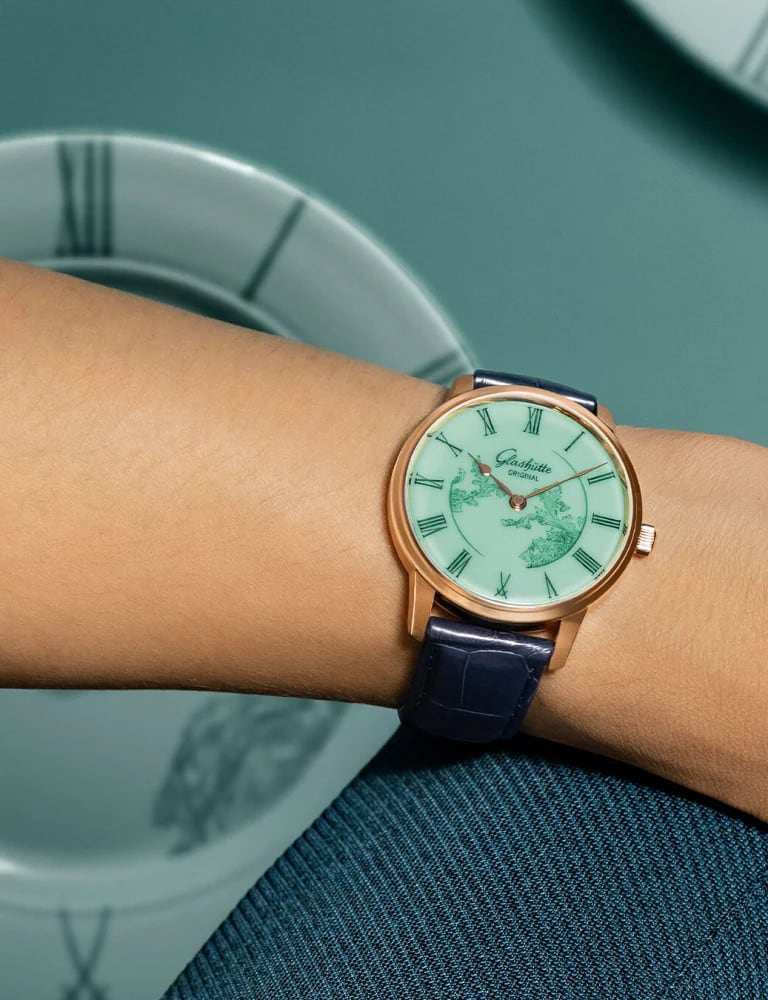 The Senator Meissen Edition is a commitment to traditional craftsmanship, maximum precision down to the smallest detail and human creativity. Its elegant red gold case with a diameter of 40 mm frames a delicate, celadon green porcelain dial with ornamental “Mystic Maison” decoration. This masterpiece is limited to 150 pieces worldwide and is complemented by a blue Louisiana alligator leather strap.