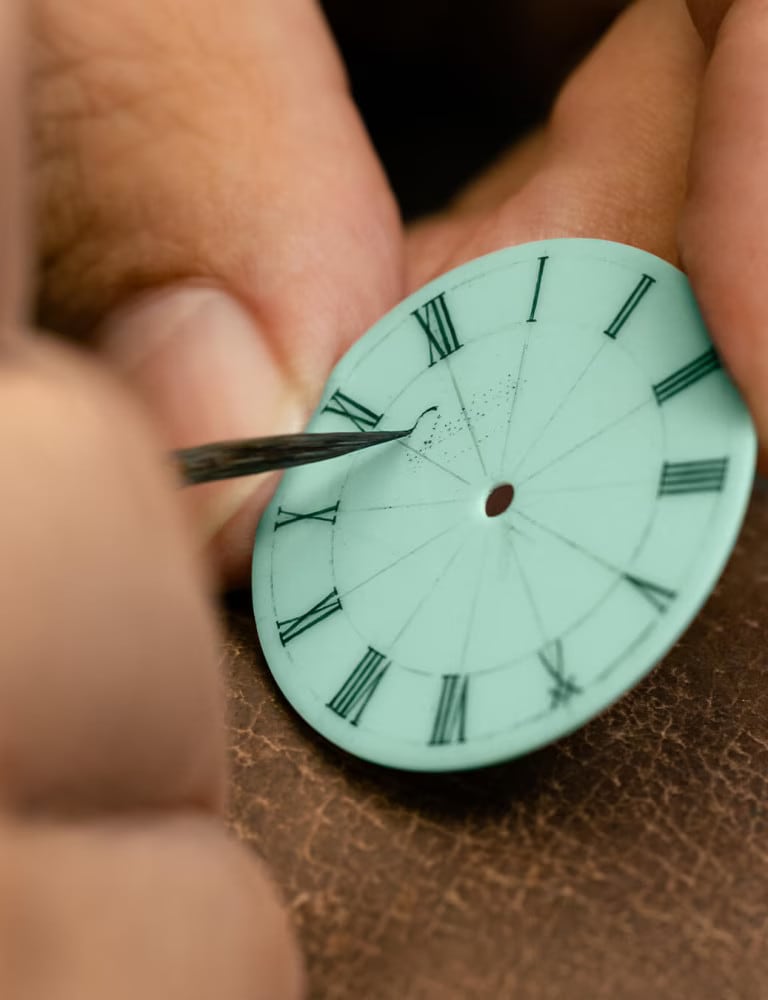 The MEISSEN dial consists of a razor-thin porcelain disc, which is first fired at 1,400°C and then carefully examined to ensure high quality and a perfectly flat surface. The decoration, lettering and Roman numerals are then applied by hand in several layers using fine brushes. Each layer is fired in a kiln at 900°C to achieve the desired depth of colour.