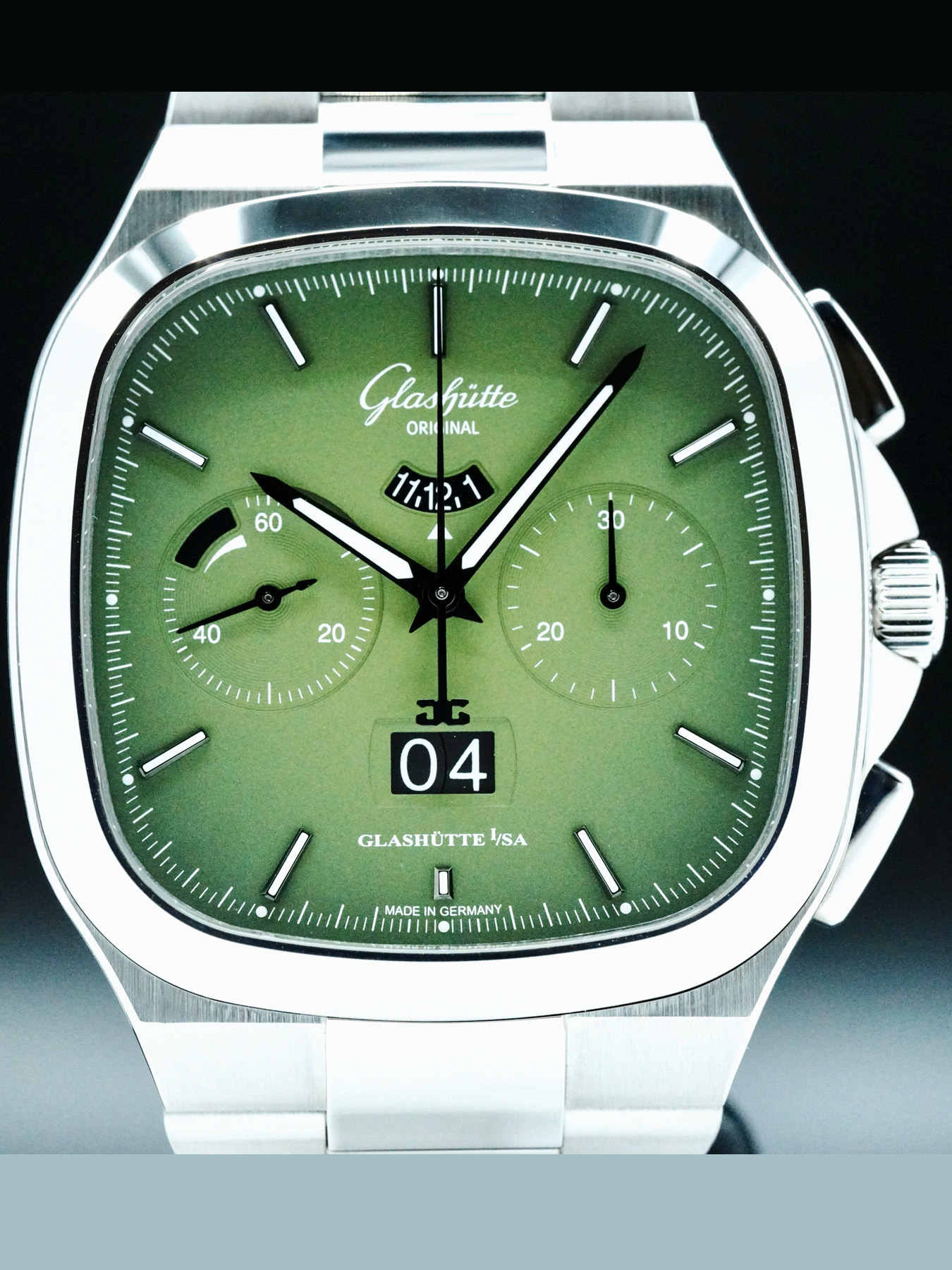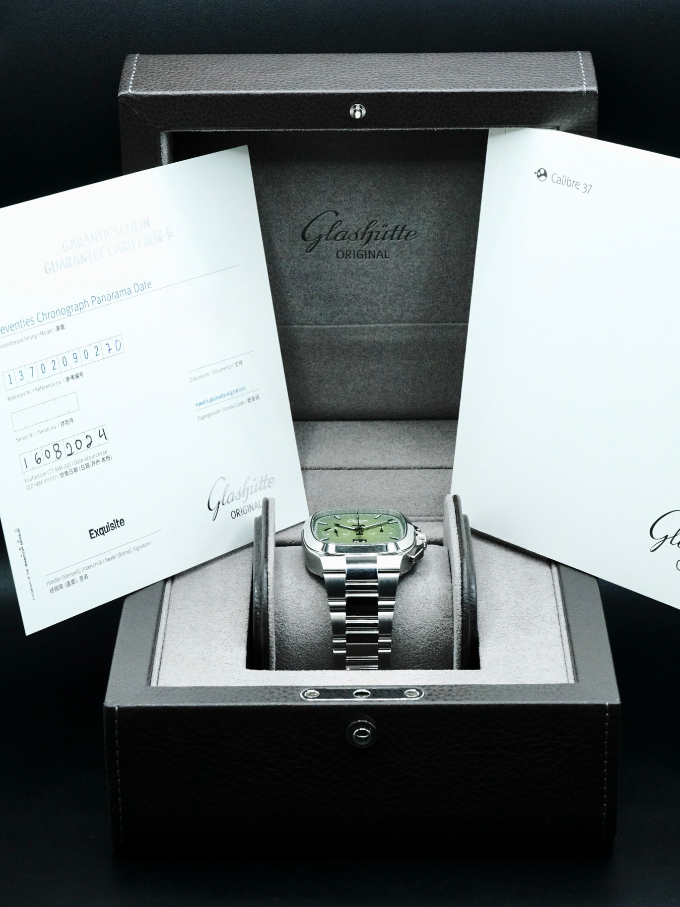 This Glashutte Original 1-37-02-09-02-70 Seventies Chronograph Panorama Date is in GREAT condition. This watch includes its Original Box, Original Papers and Warranty Card Dated August 2024. This watch has been fully authenticated and certified by Exquisite Timepieces.