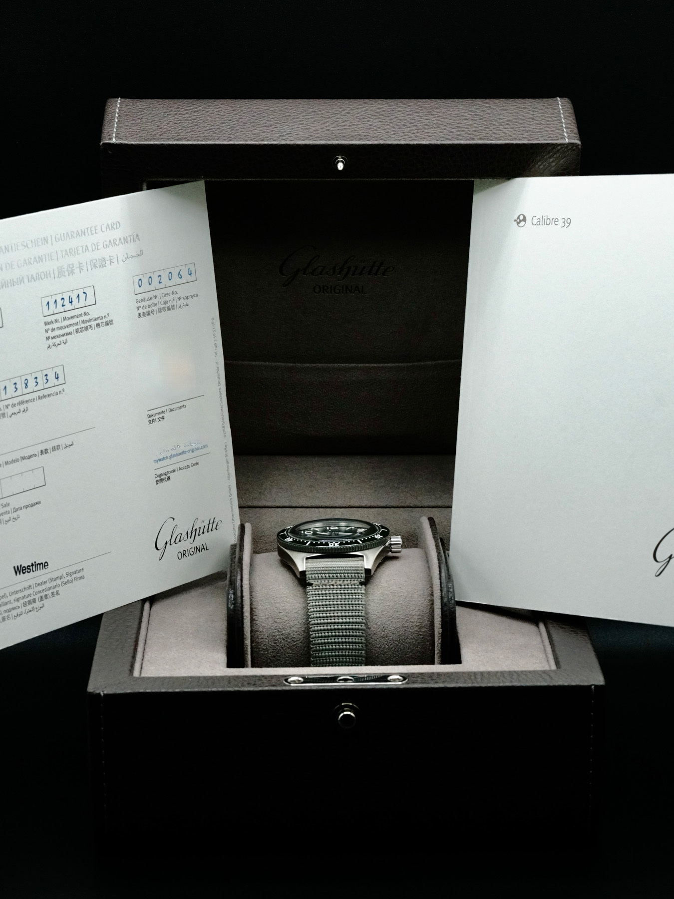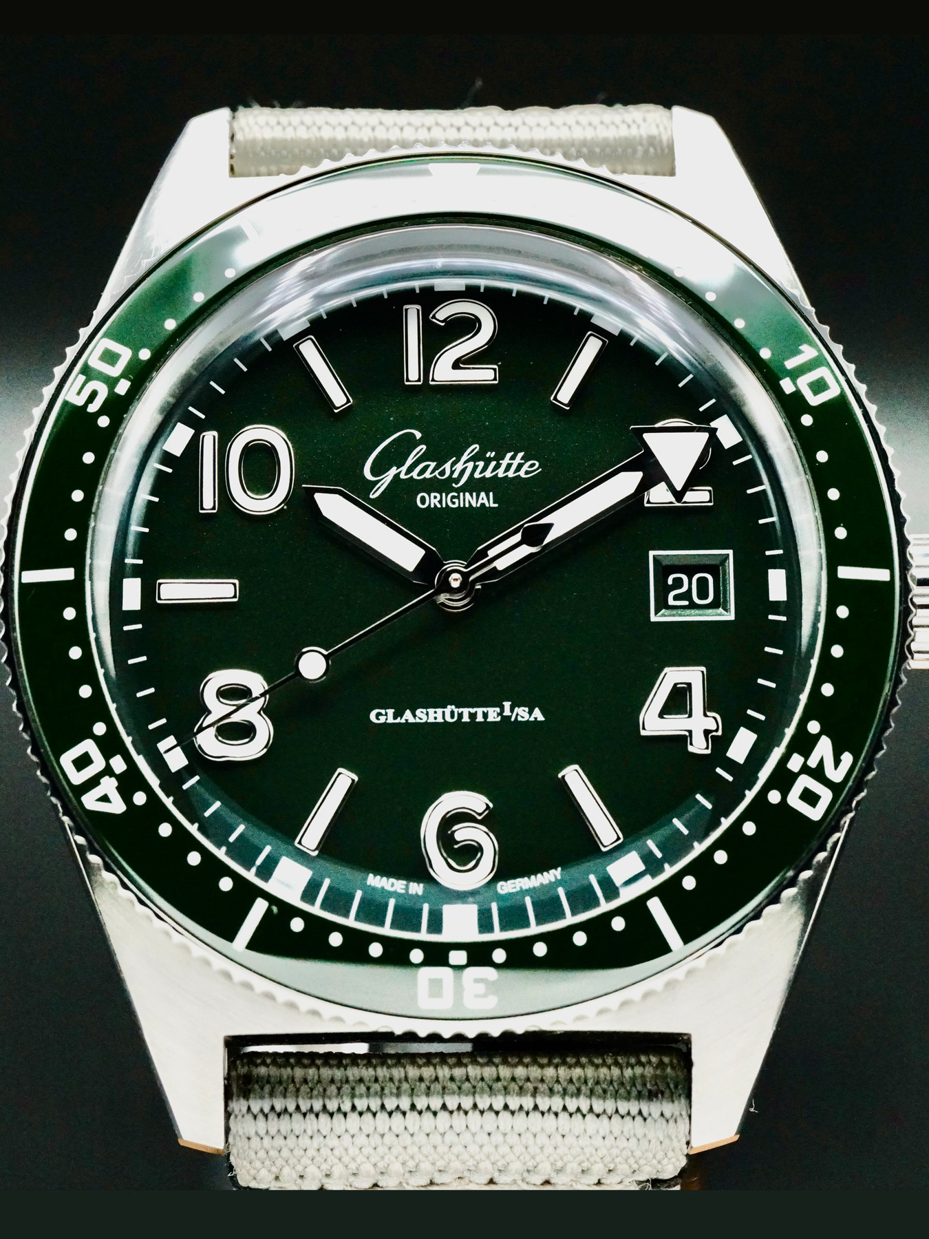 This Glashütte Original 1-39-11-13-83-34 SeaQ Auto SS Green is in GREAT condition. This watch includes original box, instruction booklet and warranty card not dated.