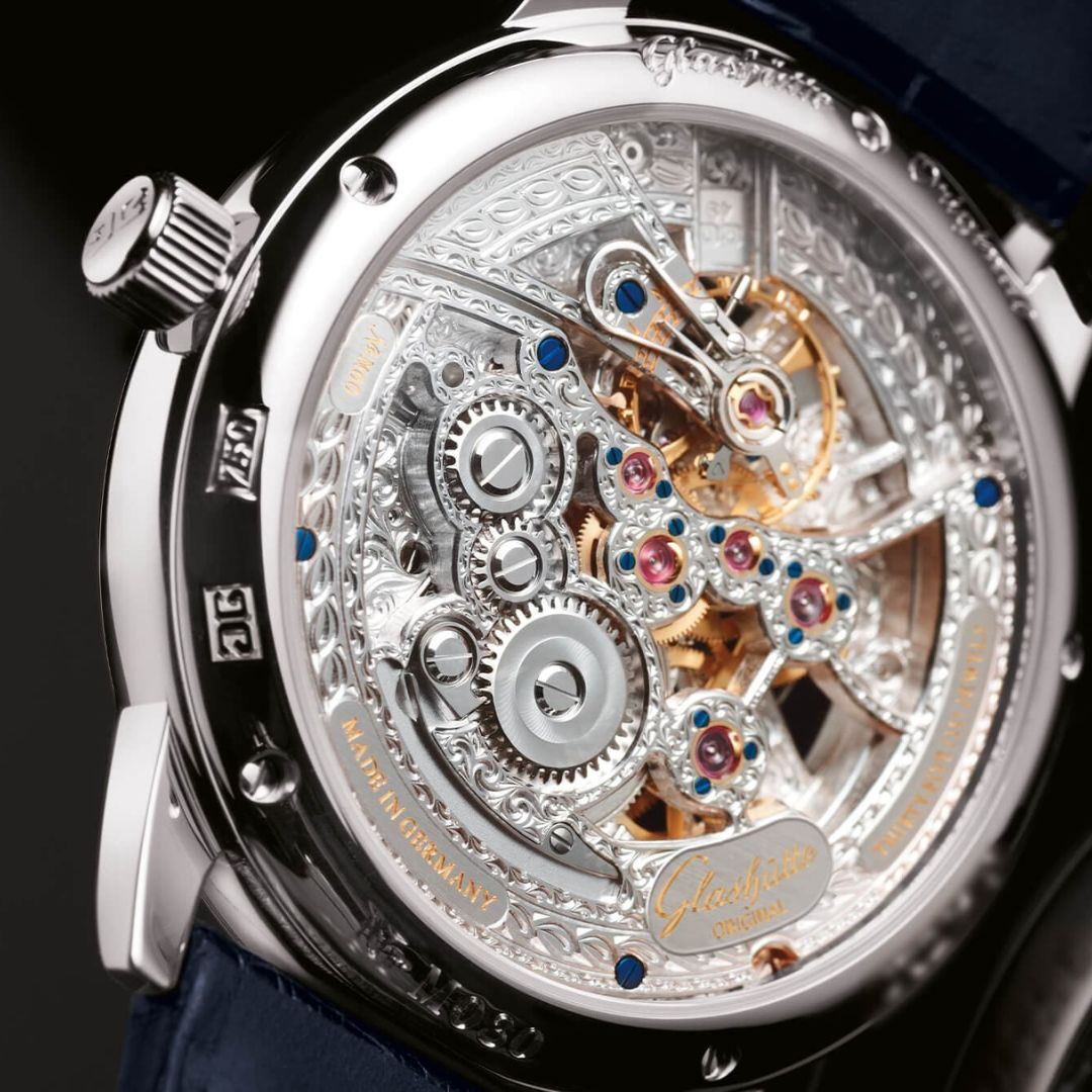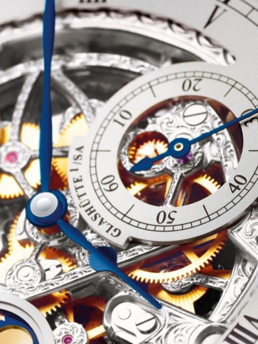 This exclusive watch for men is presented in a perfectly finished 42 mm diameter white gold case, which frames the filigree dial. The skeletonized and artfully engraved manufacture movement is protected on both the dial side and case back by anti-reflective sapphire crystal. A dark blue Louisiana alligator leather strap ensures an elegant and comfortable fit on the wrist. With this model, Glashütte Original continues the long tradition of skeletonized watches from Glashütte. With a lot of sense of proportion, dexterity and patience, material is removed from movement parts without impairing the functionality and stability of the timepiece. The galvanic silver skeletonized dial offers unobstructed views into an authentic work of art in precision mechanics. It features a black railroad chapter ring and elegant Roman numerals. The blued hands of the hour, minute and small seconds set the pace for the time. Positioned at 2 o’clock is the power reserve, while the elaborately crafted moon phase display with its gold-coloured moon and starry blue sky is placed at 10 o’clock. The precisely executed skeletonization reveals all the beauty of the manual winding movement, its fascinating complications and elaborately decorated components. The characteristic features of the Glashütte art of watchmaking, including winding wheels with double sunburst decoration, screw-mounted gold chatons with blued screws, and the swan-neck fine adjustment’s hand-engraved cock, bear witness to exceptional precision and a great love of detail.