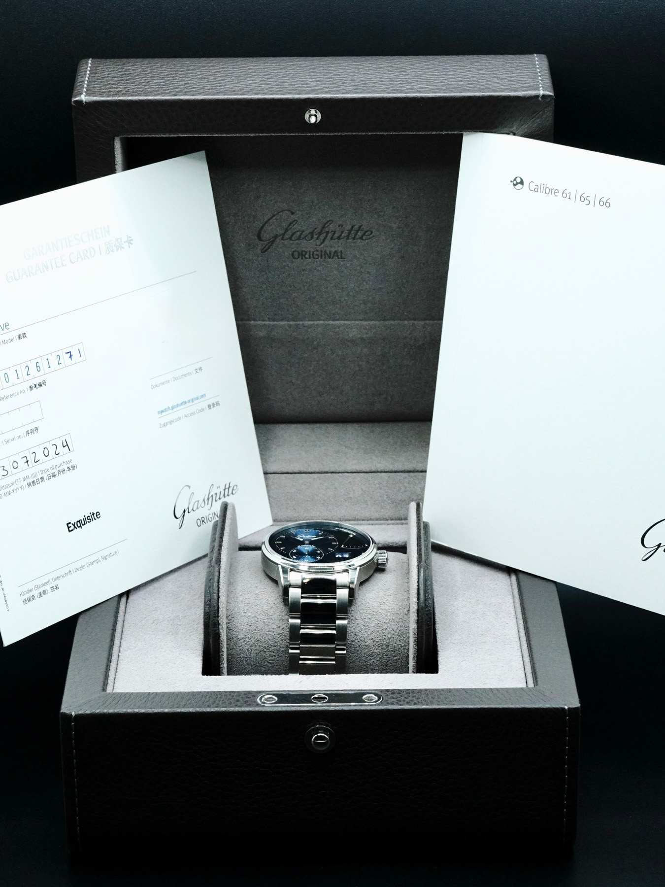 This Glashütte Original 1-65-01-26-12-71 PanoReserve is in EXCELLENT condition. This watch includes its Original Box, Original Papers and Warranty Card. This watch has been fully authenticated and certified by Exquisite Timepieces.