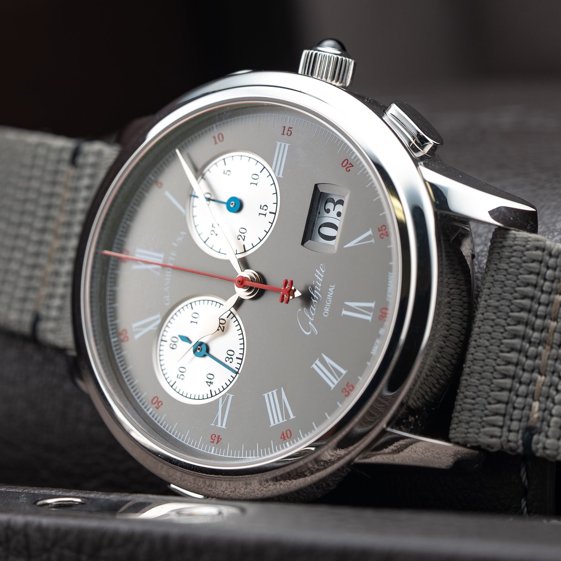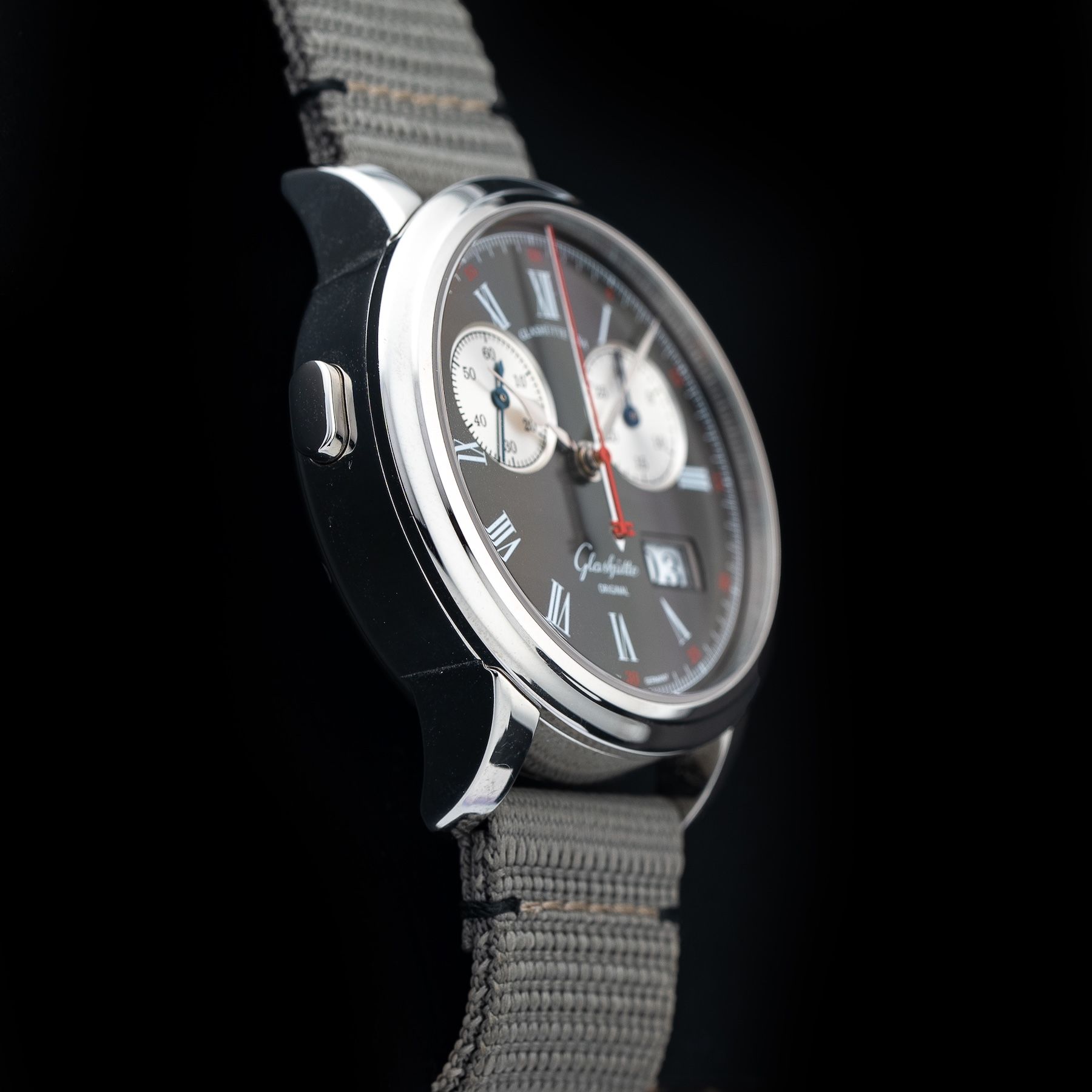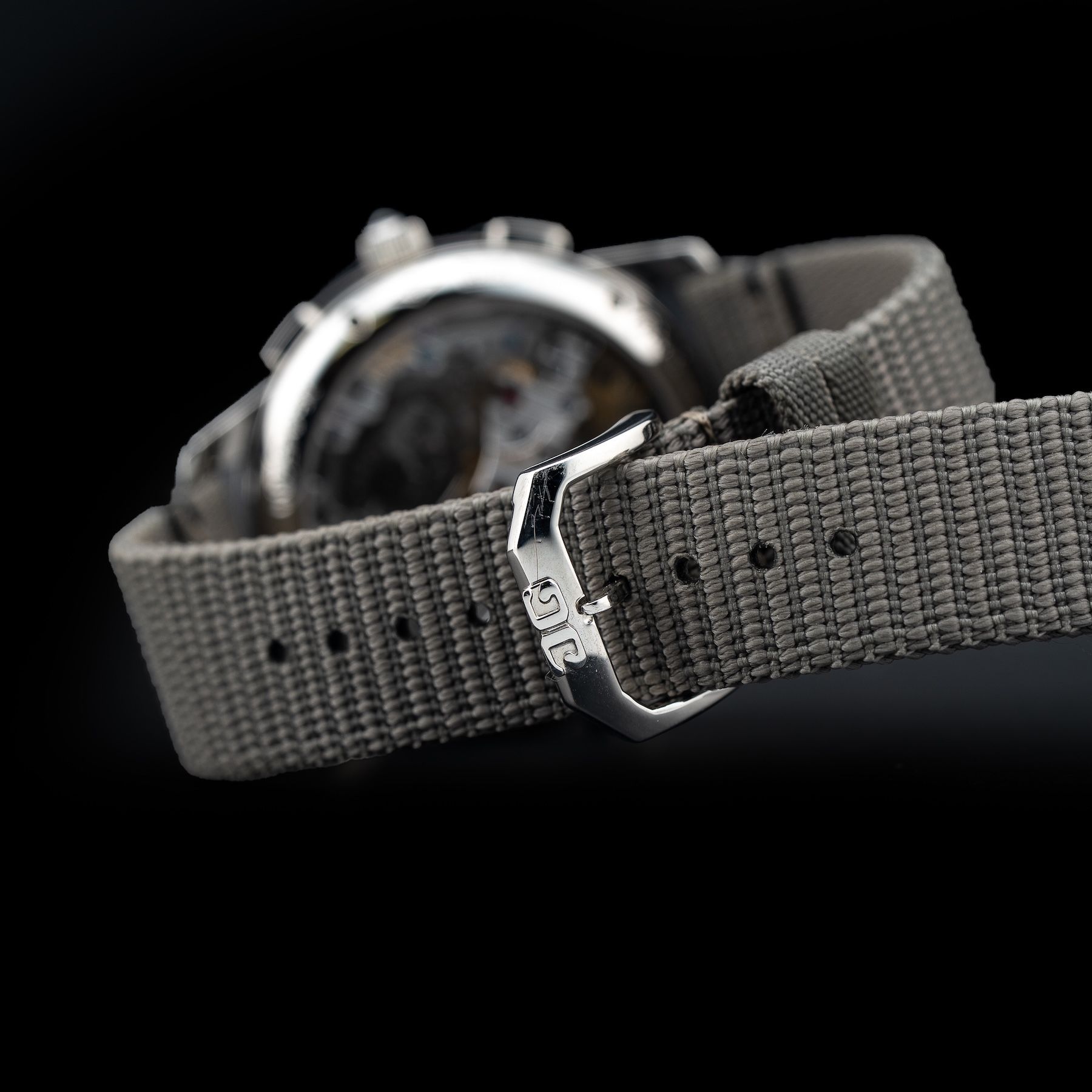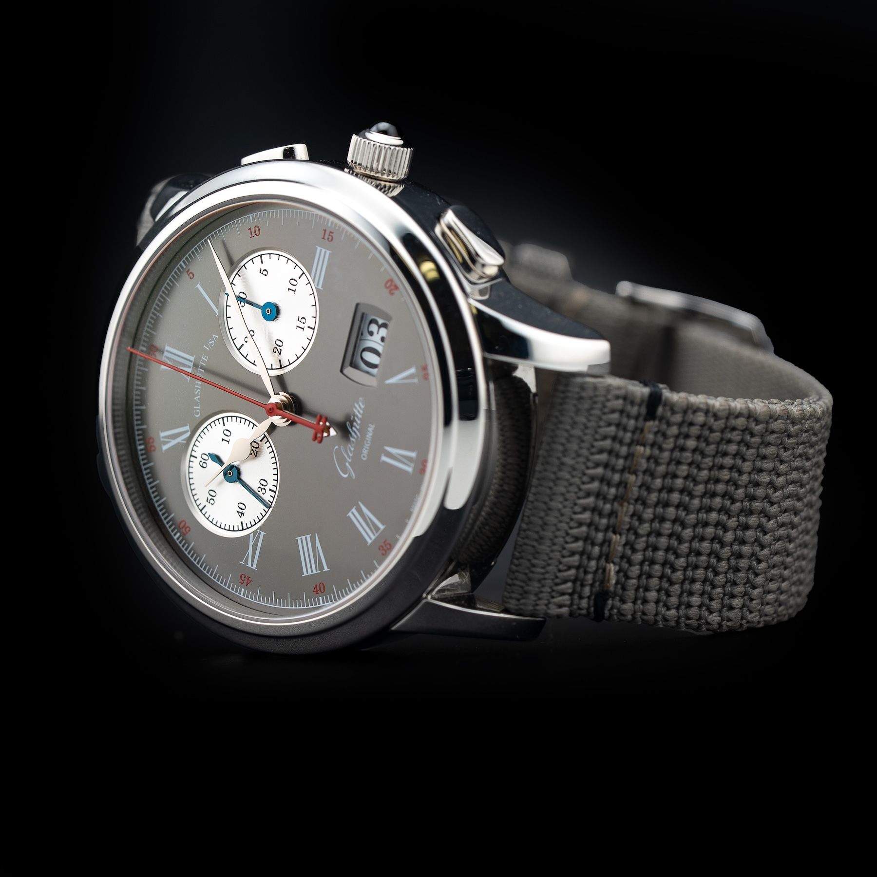 This watch features a 42mm platinum case on nylon strap. This watch also sports a anthracite dial. Powered by a mechanical manual movement. Water resistance up to 50 meters.