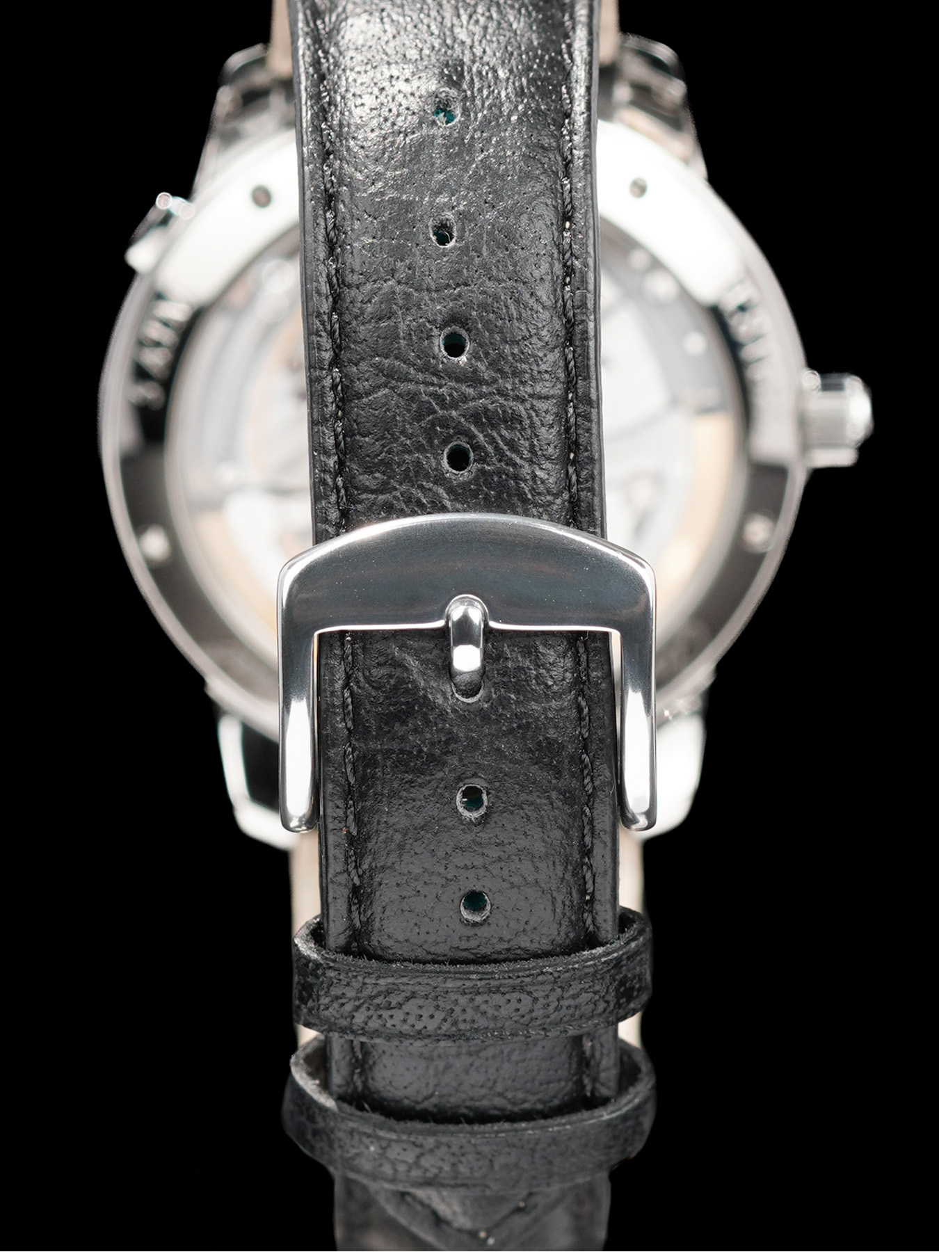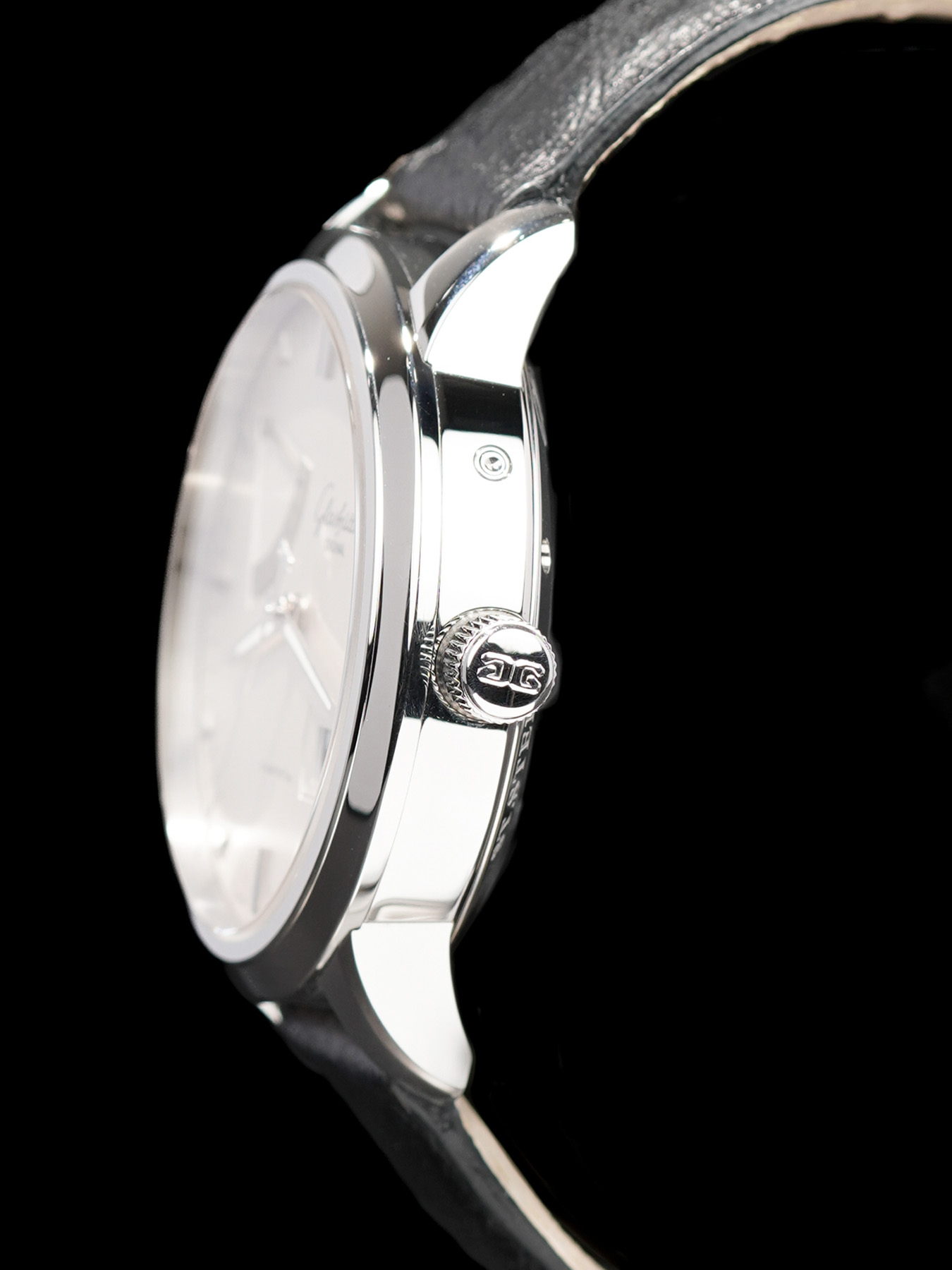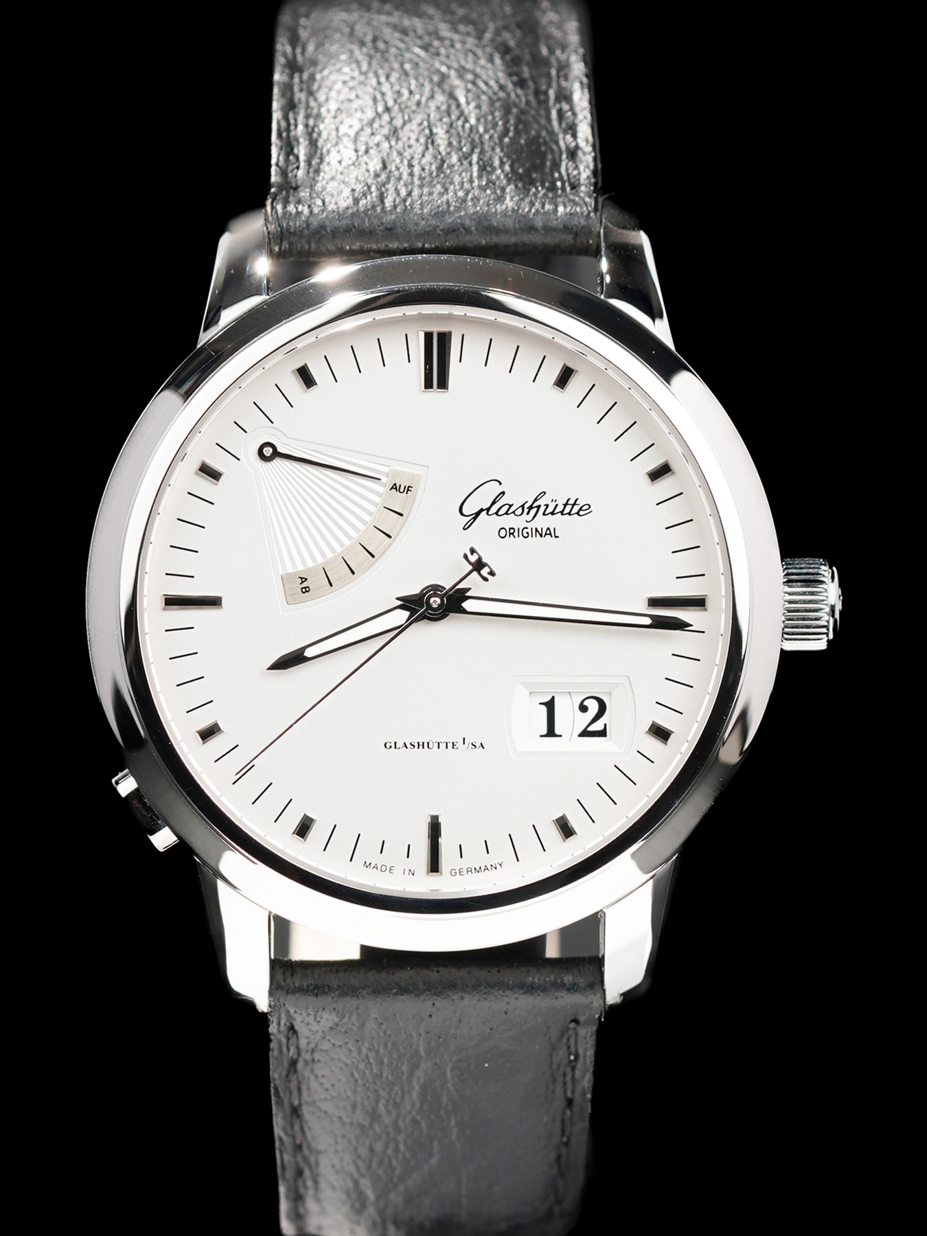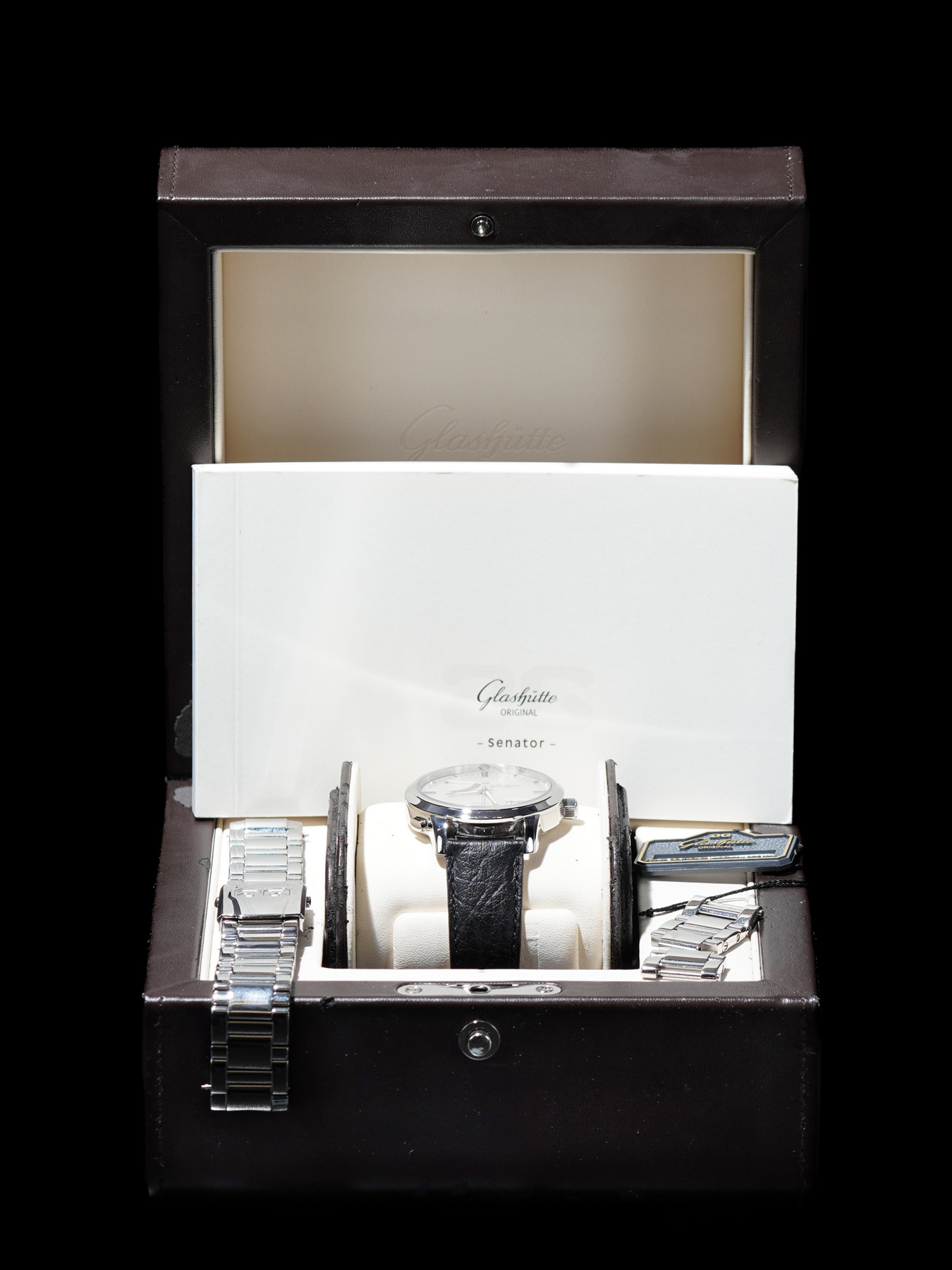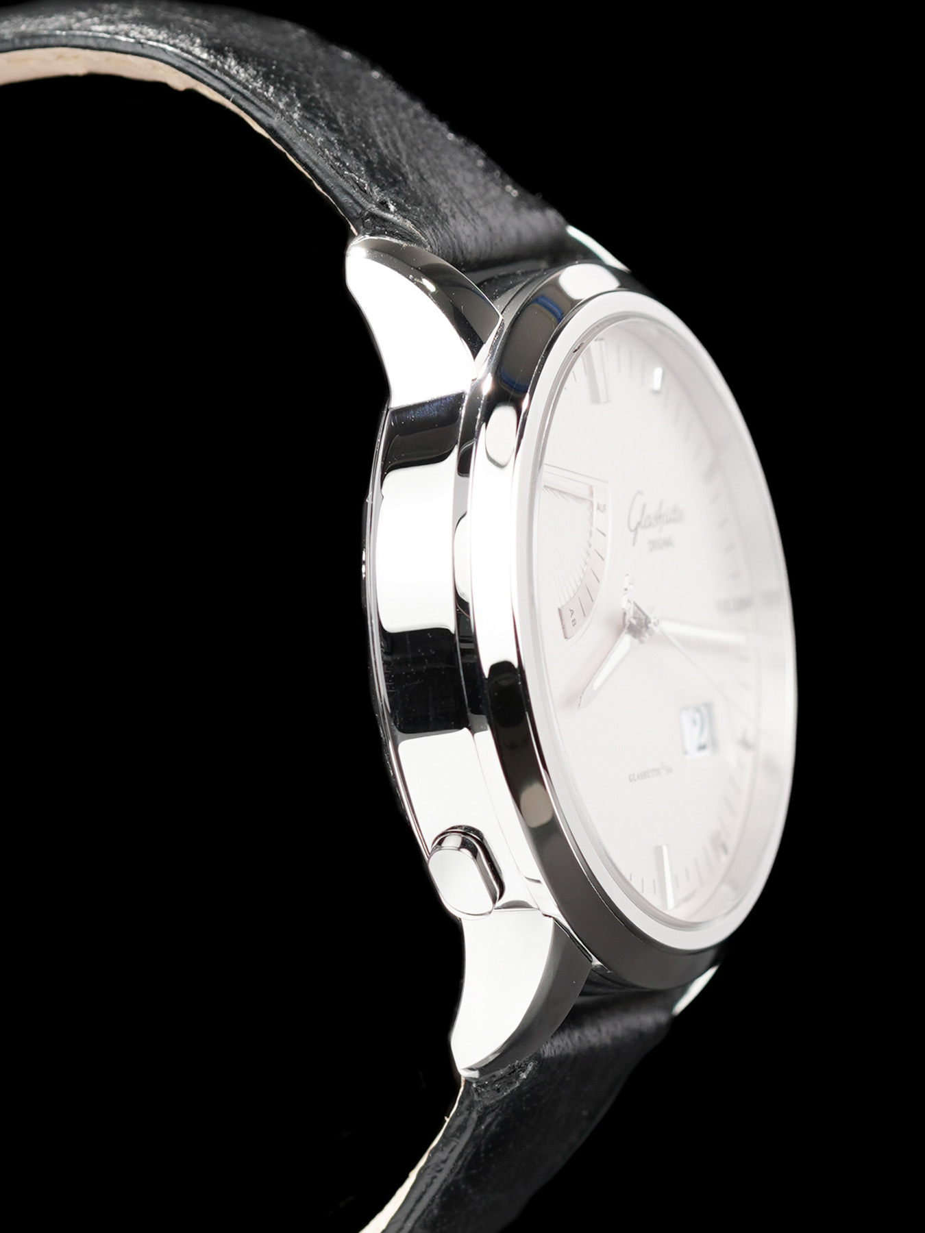 This watch features a 40.1mm stainless steel case on an aftermarket black leather strap. This watch also sports a silver dial. Powered by a Glashutte Caliber 100-01 automatic movement. Water resistance up to 50 meters.