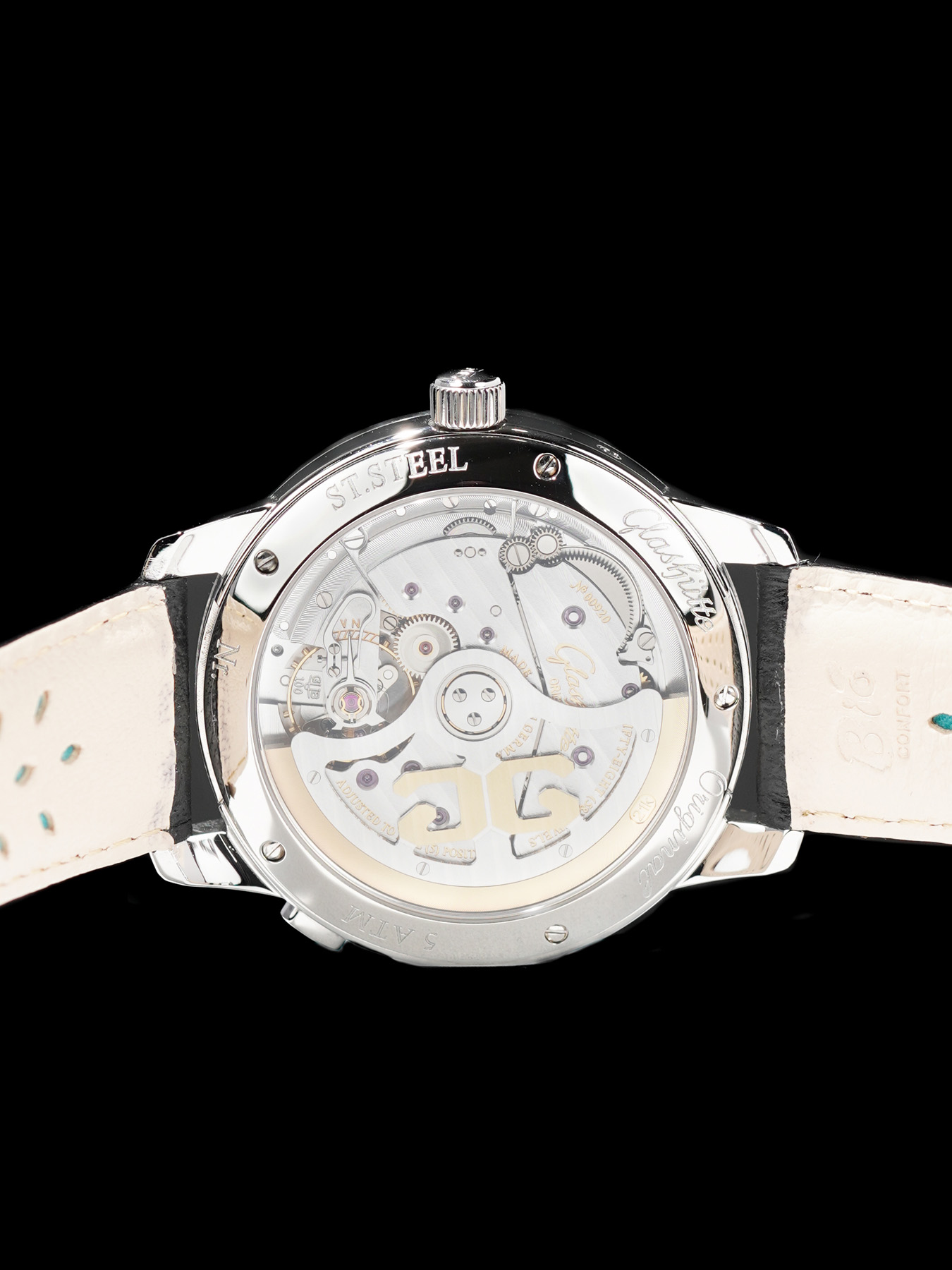 Automatic Glashutte Caliber 100-01 contains 58 jewels, beats at 28,800 vph & has an approximate Power Reserve of 55 hours