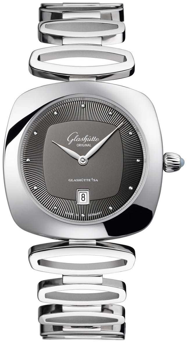 Glashütte Original Lady Collection Pavonina. Stainless Steel 1-03-01-14-02-14, Quartz movement, central hour/minute, date window at 6 o'clock, exquisitely finished movement, Glashütte stripe finish, electronic fine adjustment, anti-magnetic protective cage