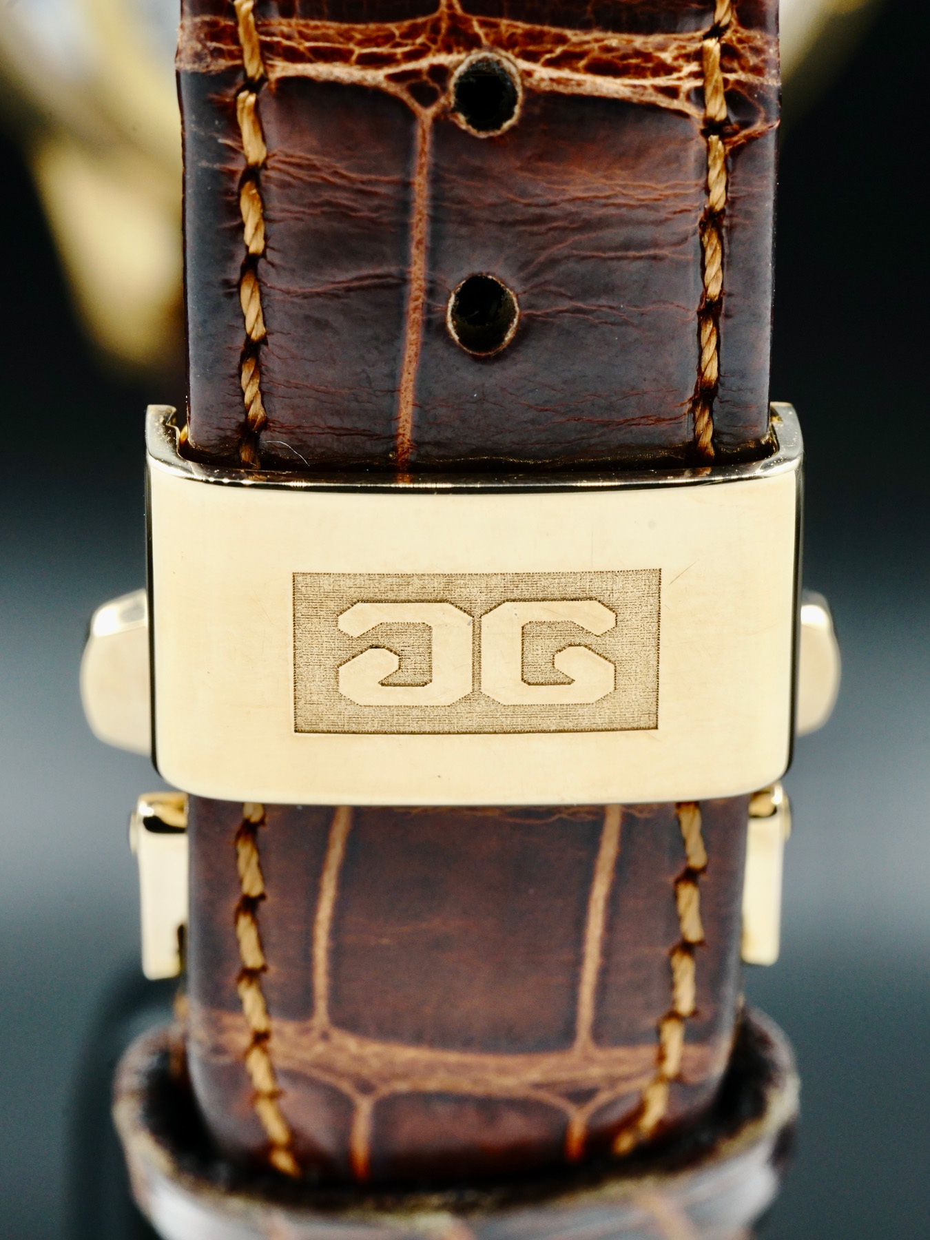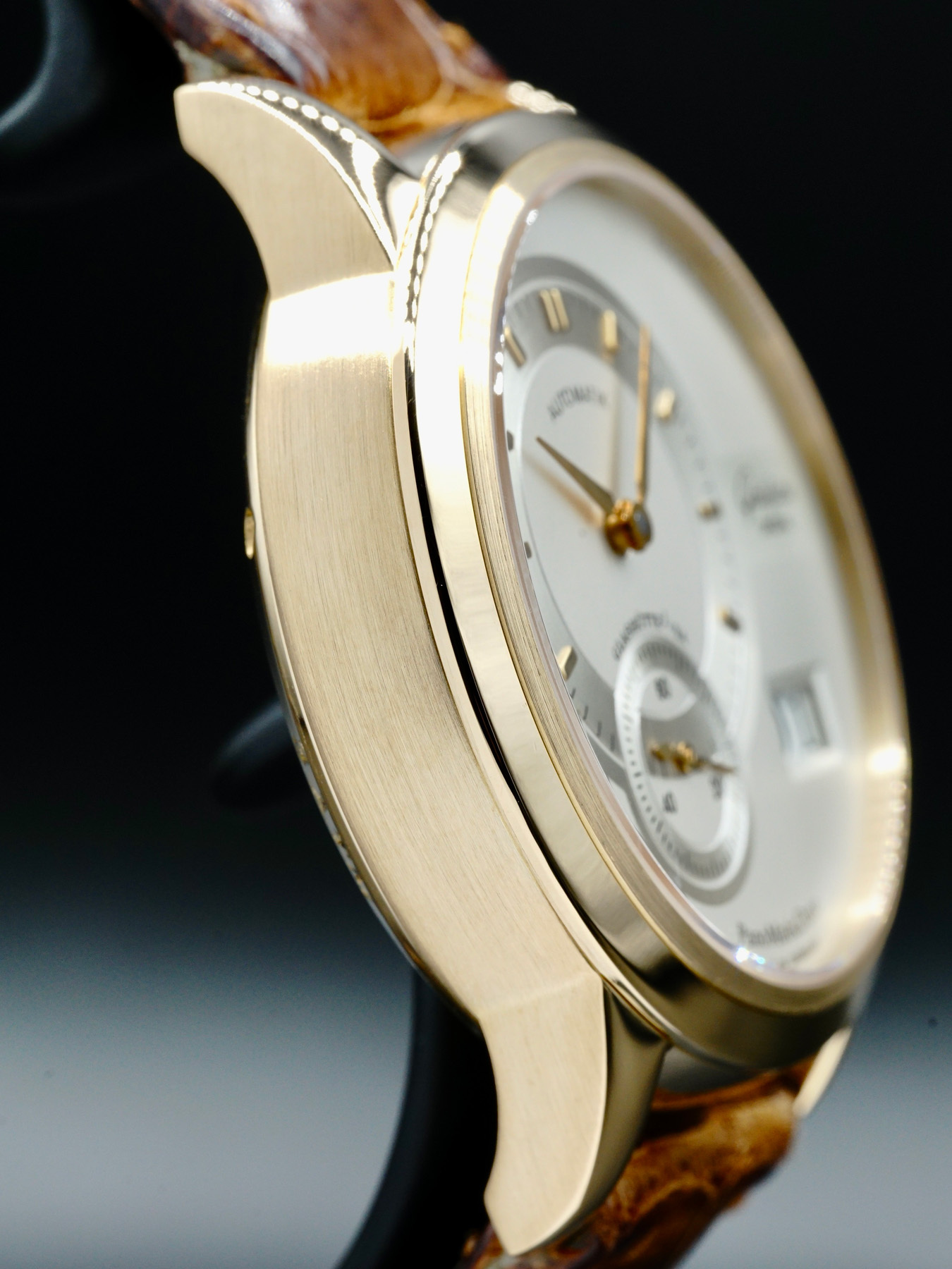 This Glashütte Original PanoMaticDate 1-90-01-02-02-14 features a 39mm gold case mounted on leather strap. This watch also sports a silver dial.