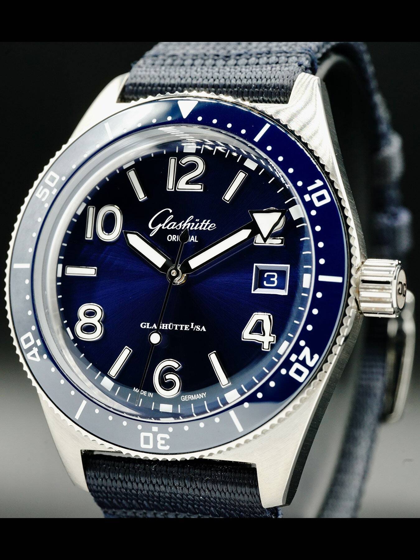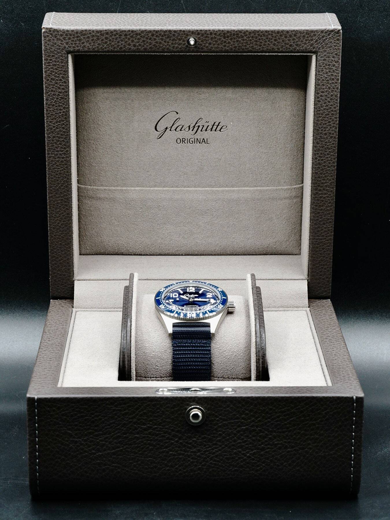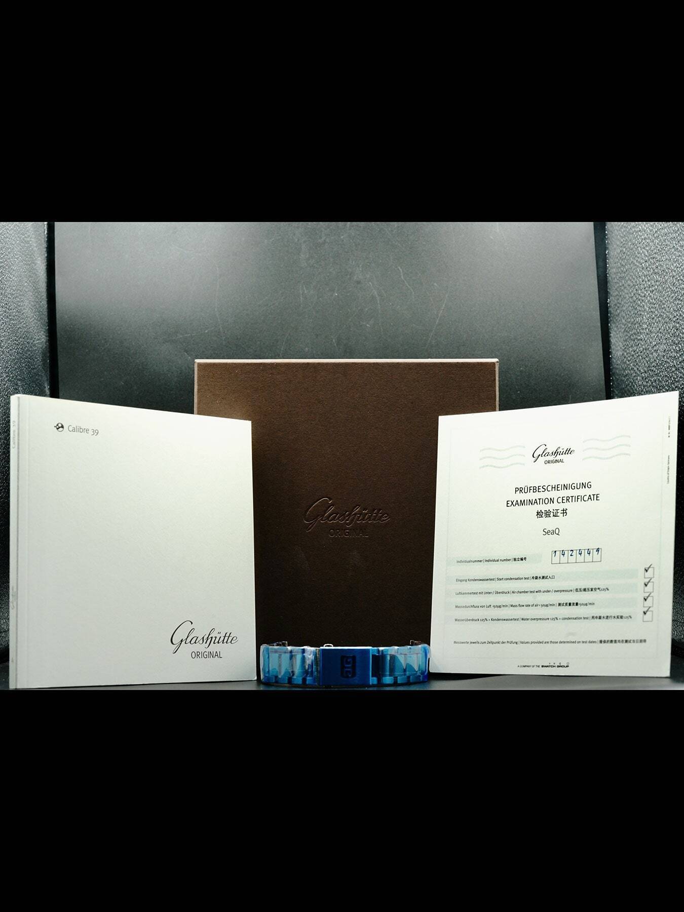 This Glashütte Original SeaQ Blue Dial 1-39-11-09-81-70 is in EXCELLENT condition. This watch includes its original box, instruction manual, and examination certificate. Extra stainless steel bracelet.
