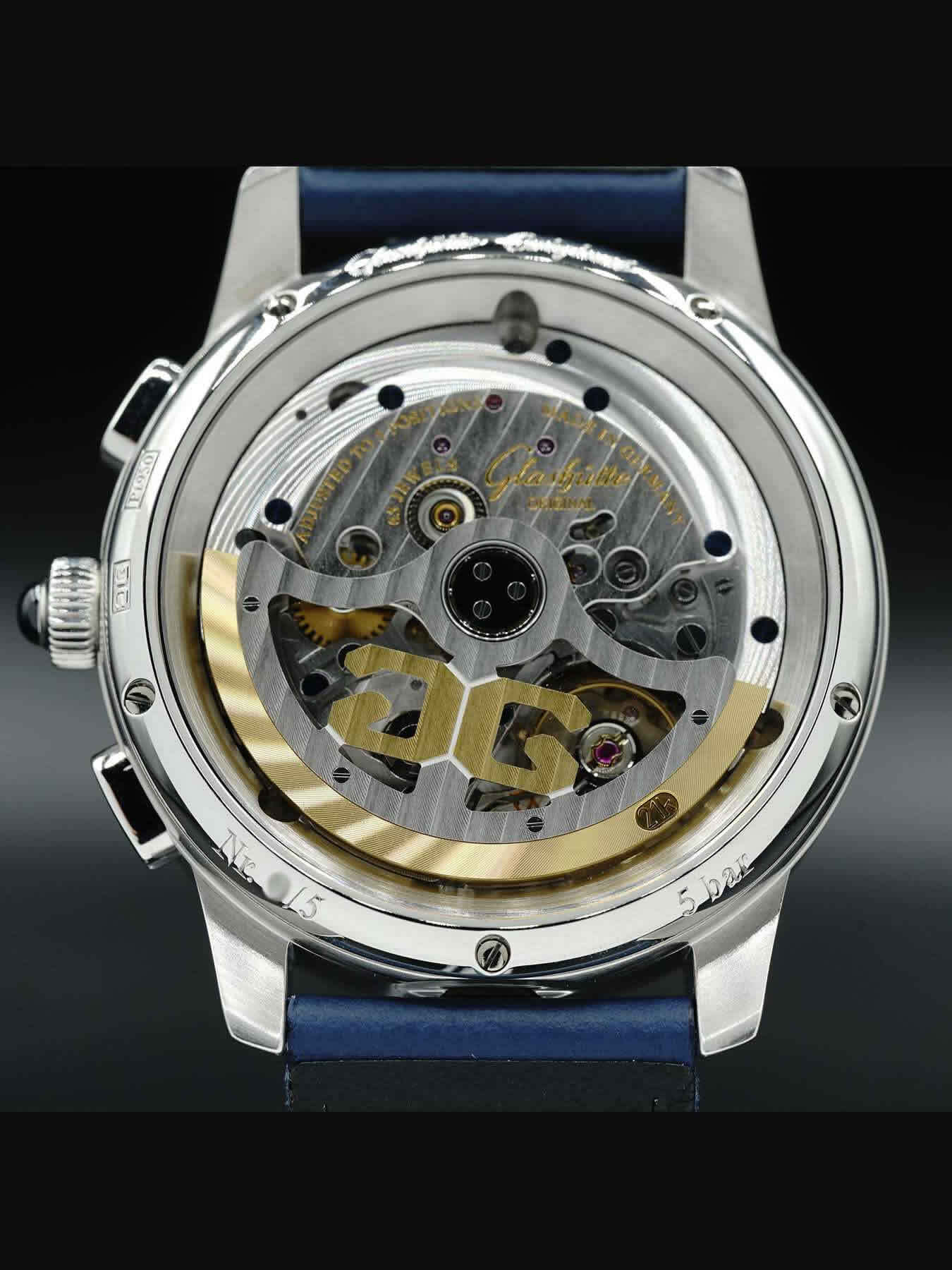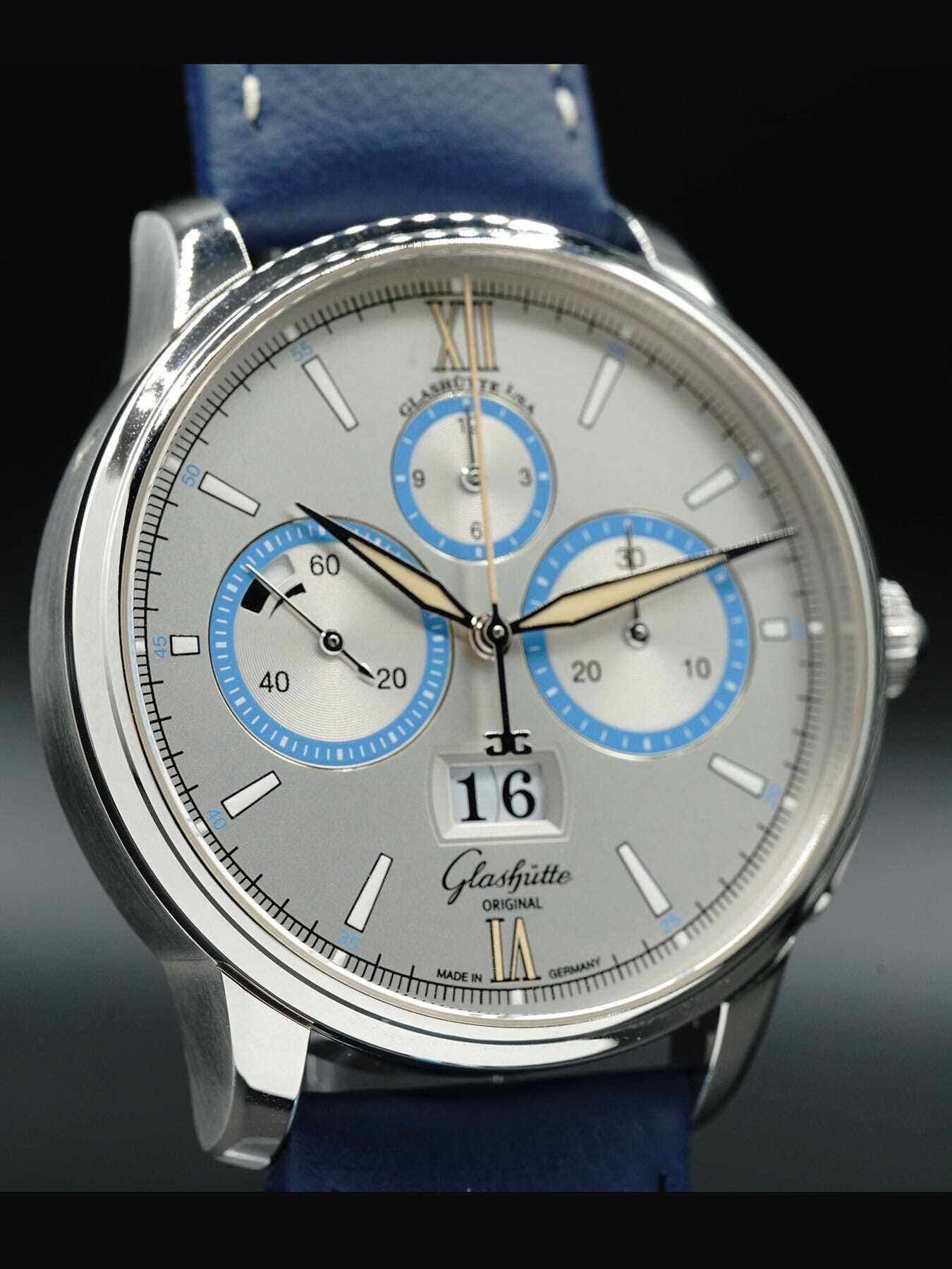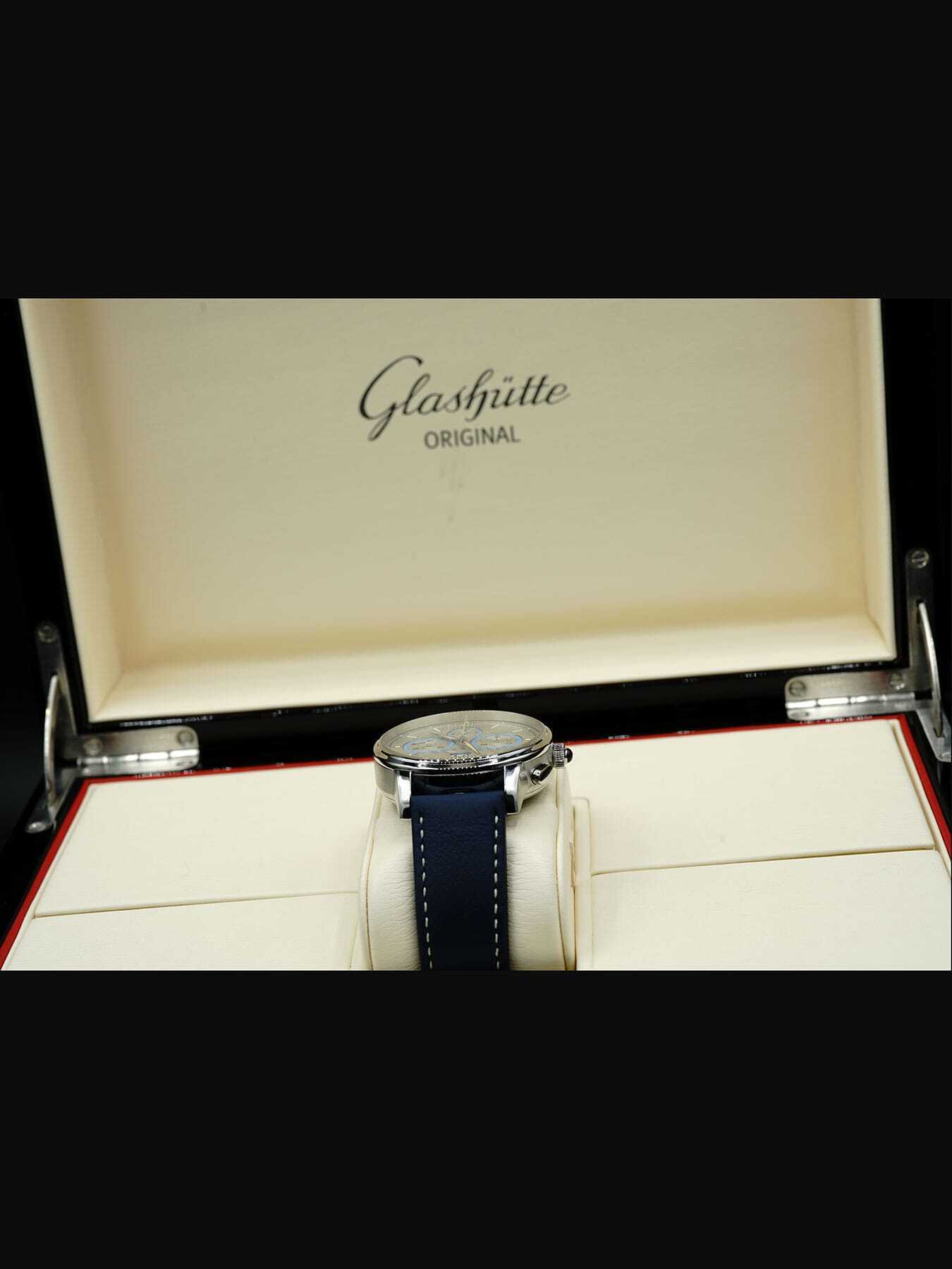 This Limited Edition Glashütte Original Senator Chronograph Panorama Date watch is in LIKE NEW condition. This watch features a 42mm Platinum case and a silver dial. The watch is fitted with an Alligator Leather strap & a deployant buckle. This watch is limited to 5 pieces and includes its original box, papers, and warranty.