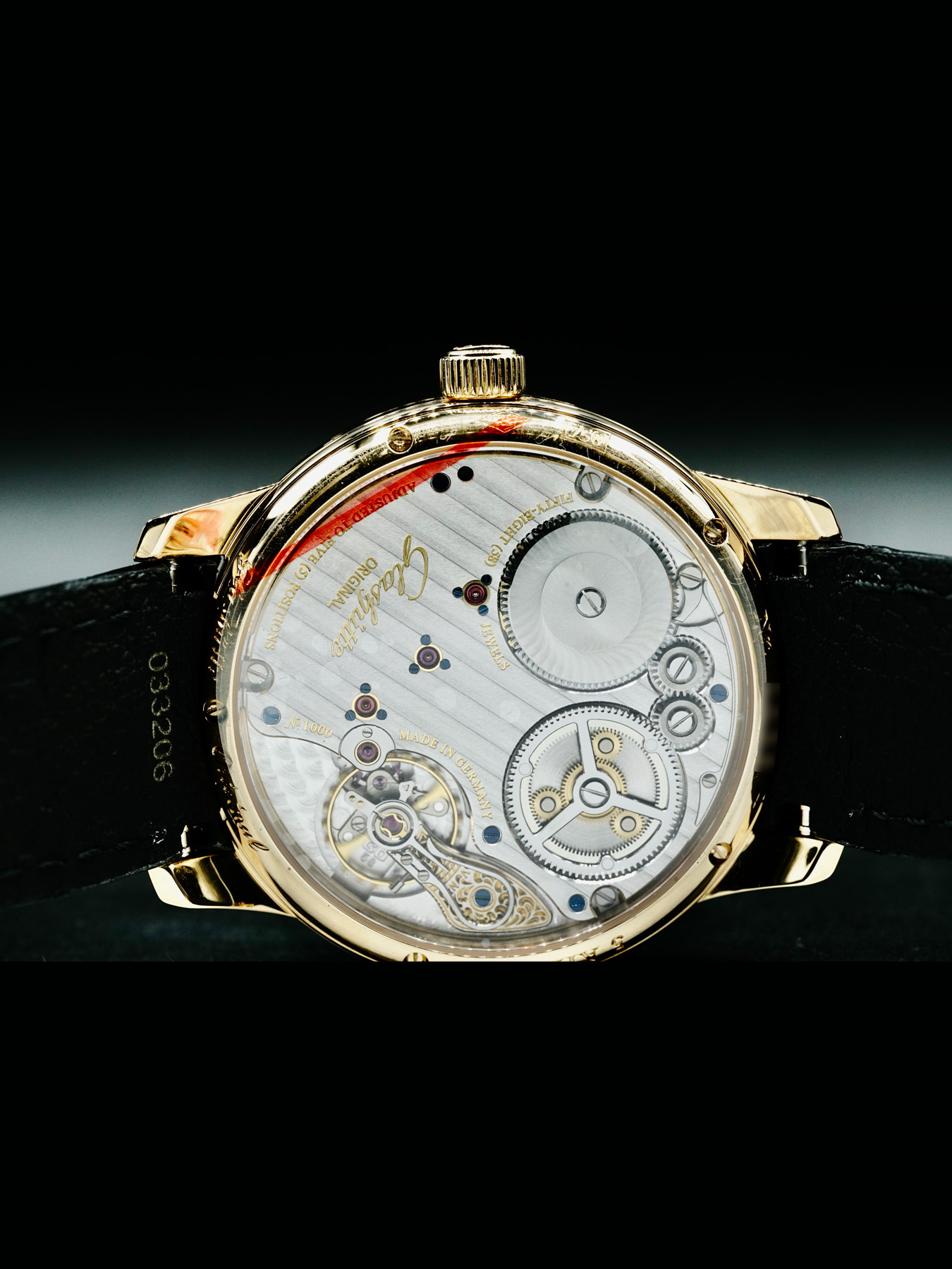 Manual wind movement powered by Glashütte Original Caliber 58-01. Water resistance up to 50 meters.