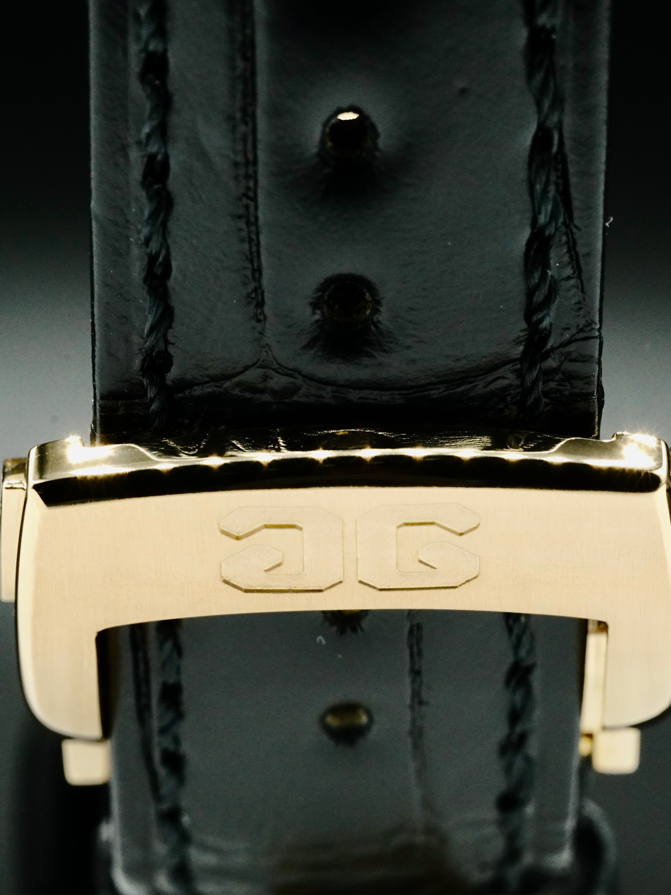 This Glashütte Original Senator Chronometer features a 42mm 18k rose gold case with a display case back on a black leather strap. This watch also sports a silver dial with blue hands and pained Roman numeral dial markers covered by scratch resistant sapphire crystal.